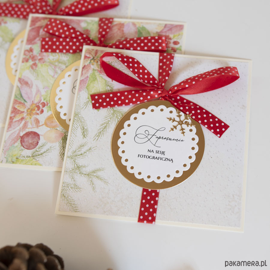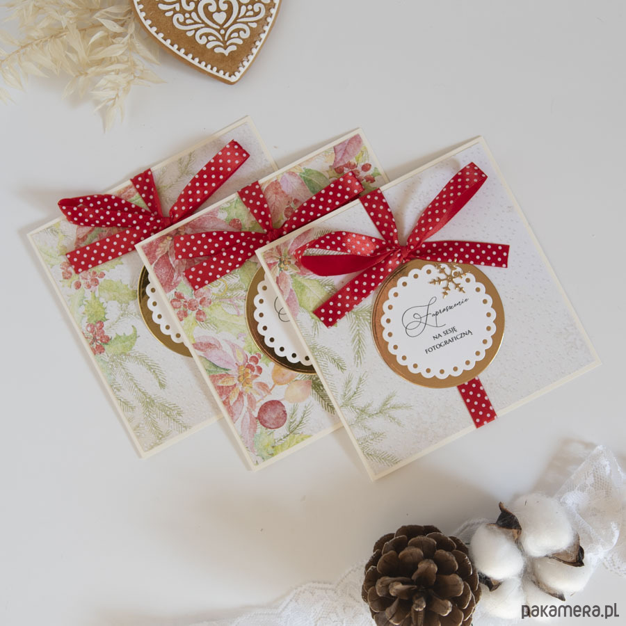 Zestaw trzech ręcznie robionych voucherów bożonarodzeniowych, zaproszeń na sesję fotograficzną.