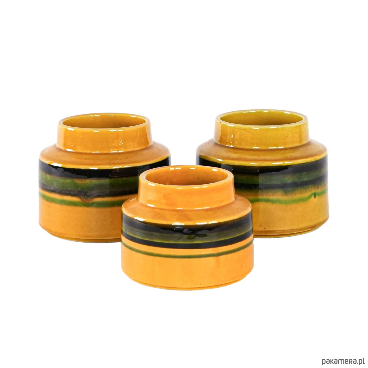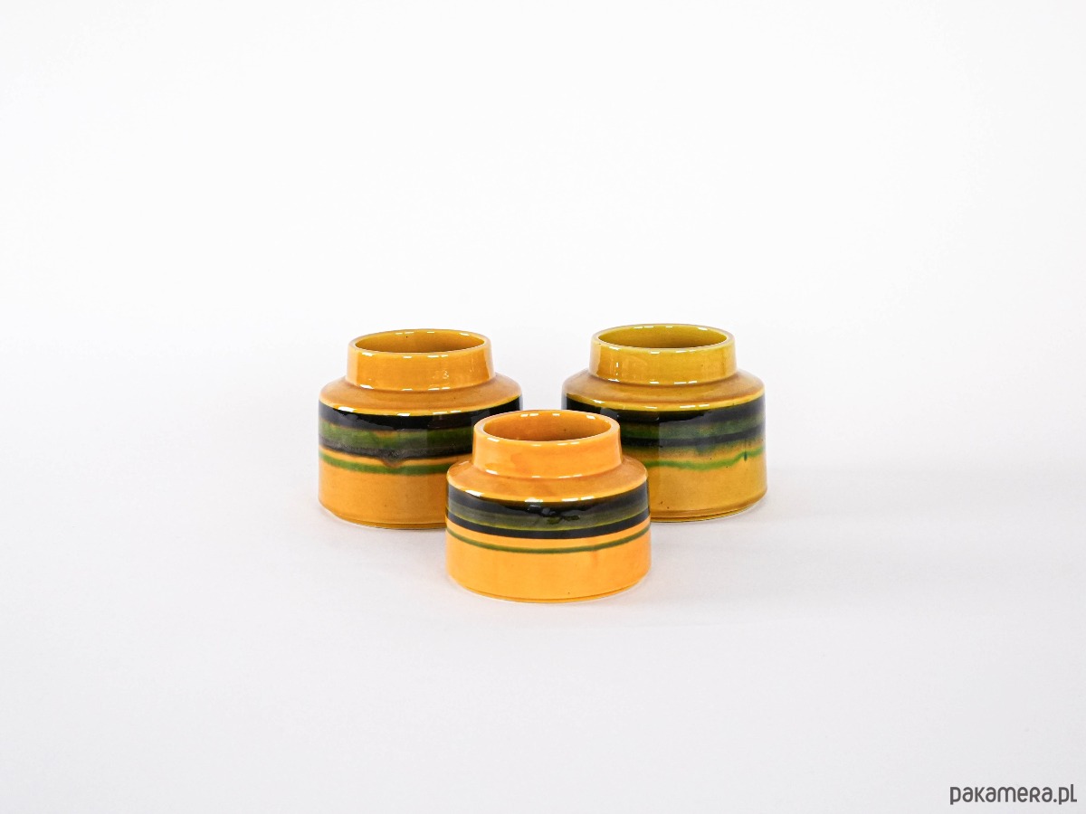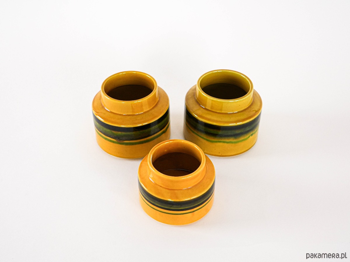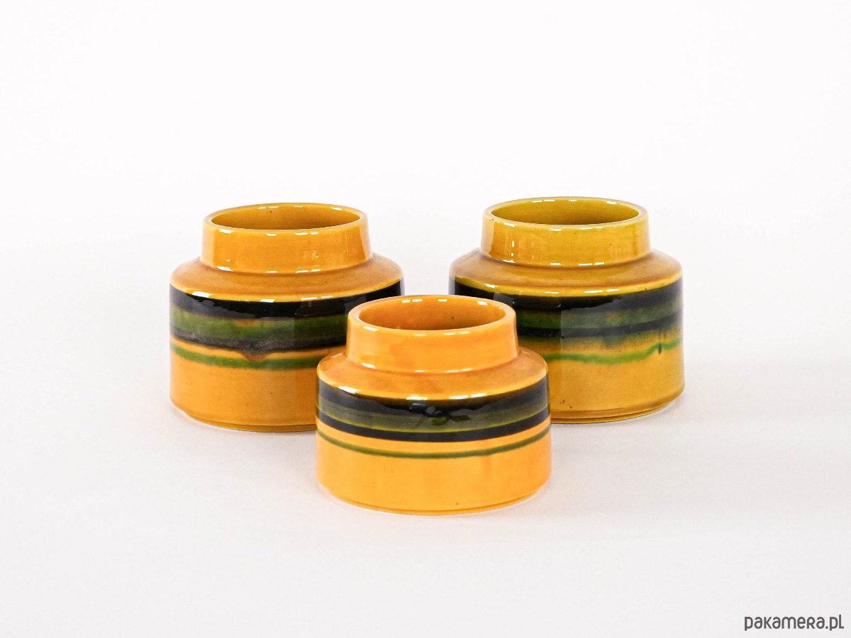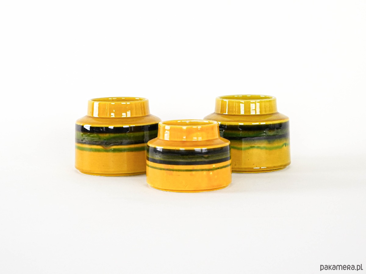Zestaw trzech ceramicznych wazonów vintage z lat 60. w intensywnym odcieniu żółci, ozdobionych pasami w zielono-czarnej tonacji. Idealne jako stylowa dekoracja wnętrza w klimacie retro — przyciągają wzrok i dodają charakteru. Każdy przedmiot może nosić naturalne ślady użytkowania, co podkreśla ich unikalny charakter i historię.