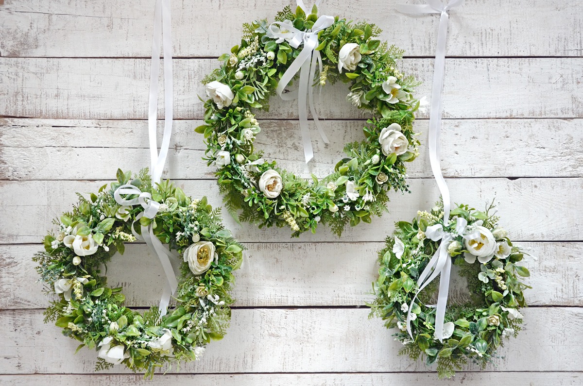 Średnice wianków: 24 cm, 20 cm i 15 cm. Zapakowane w ozdobny kartonik.
