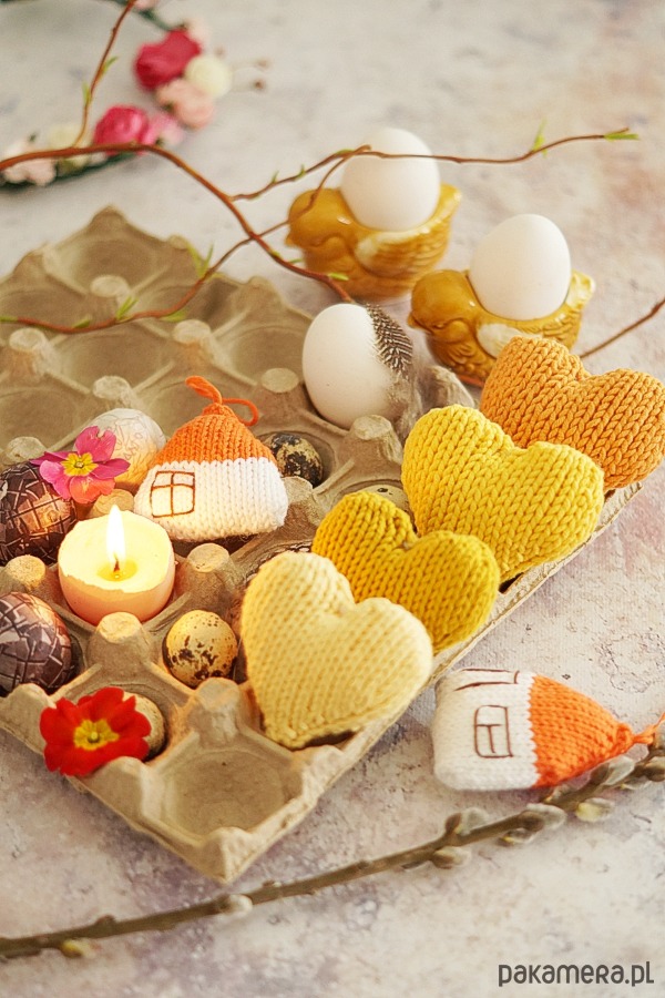 - dwa dziergane na drutach miękkie domki,