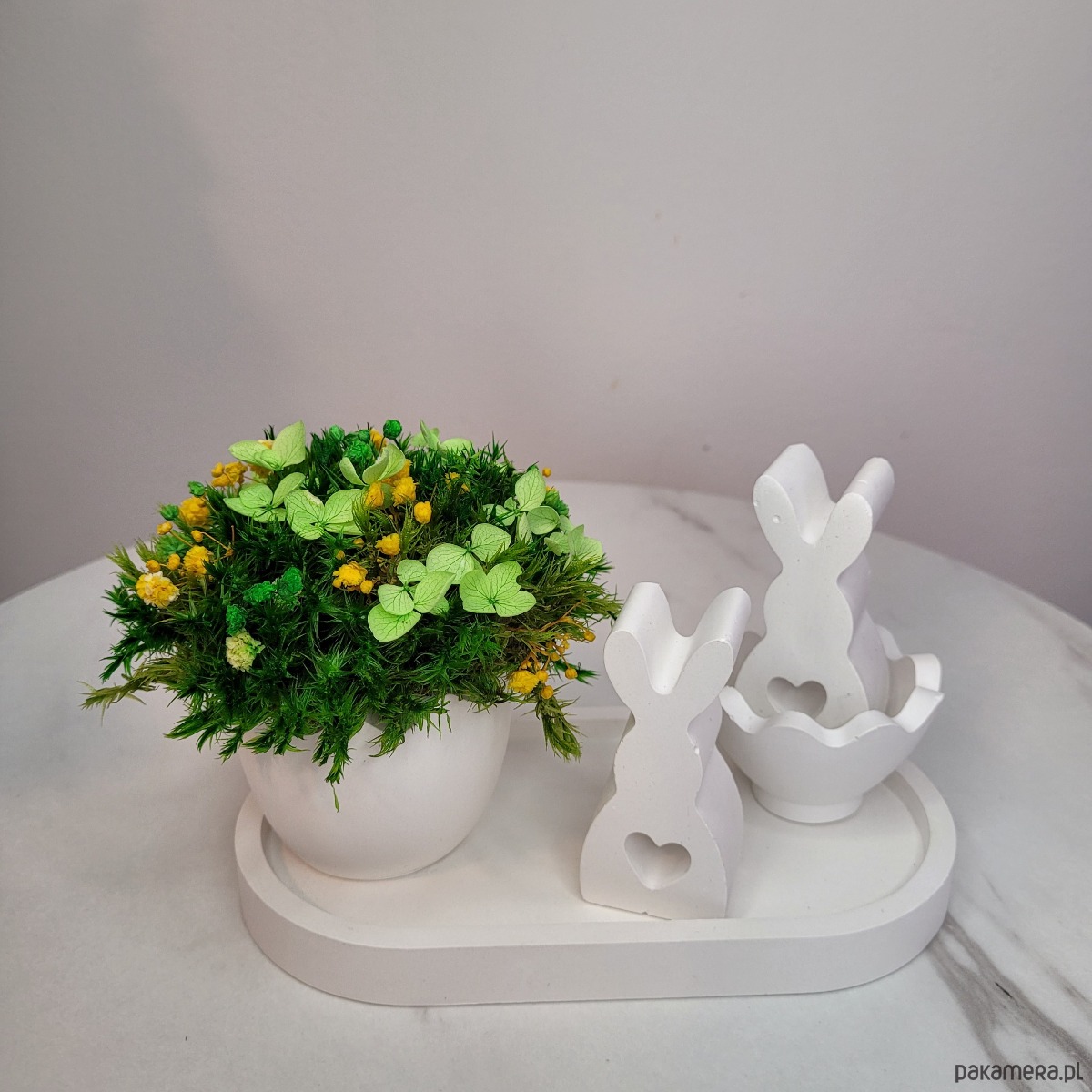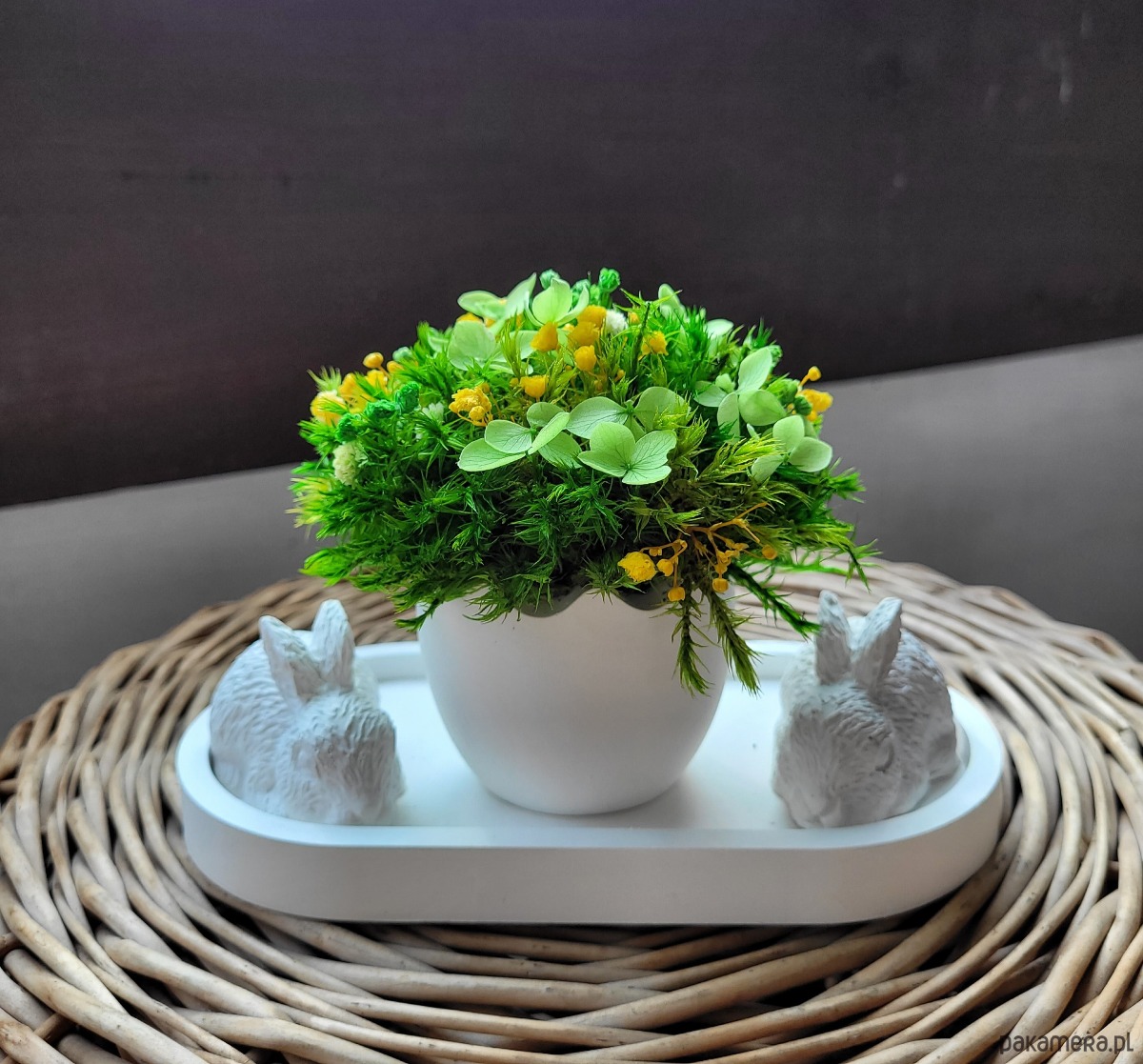 Wiosenna dekoracja z mchem i króliczkami