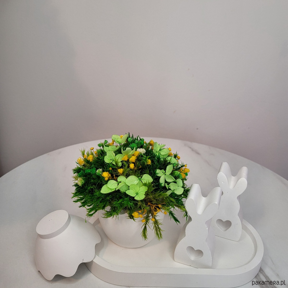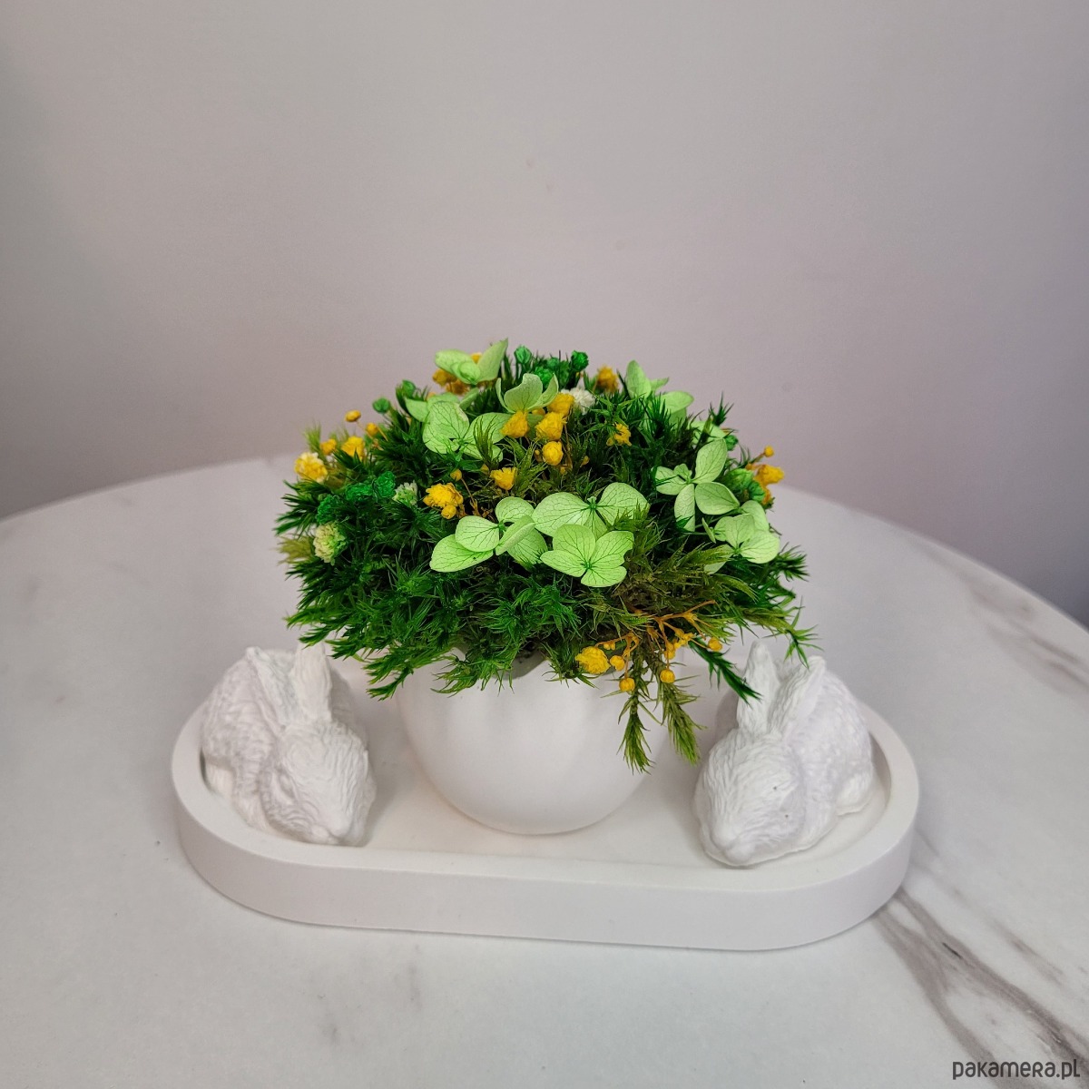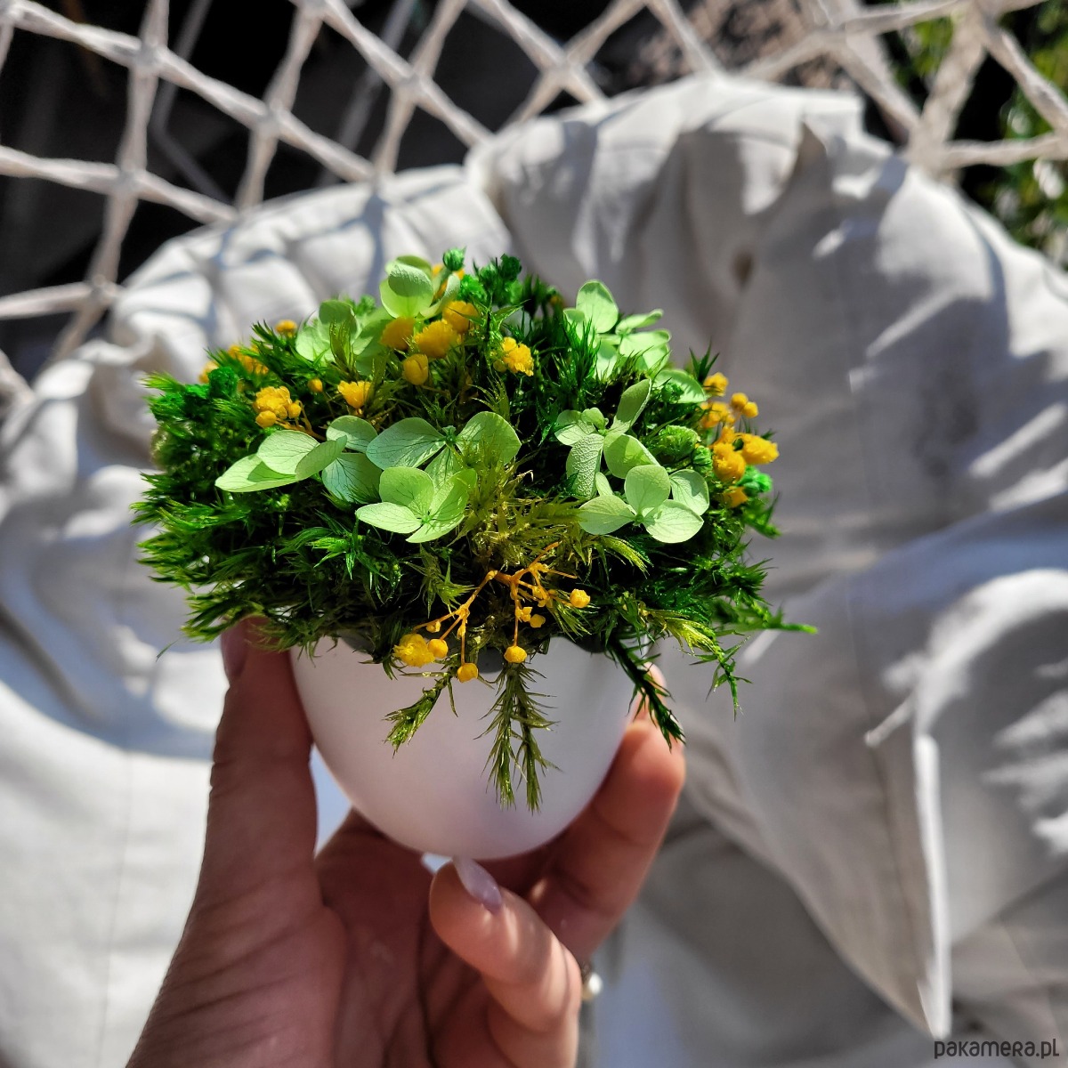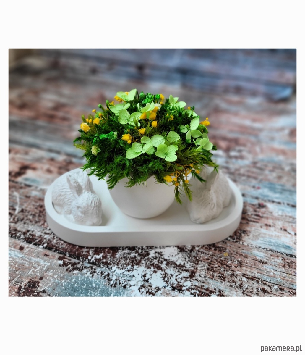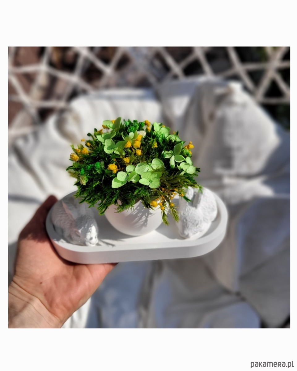 Centralnym elementem jest śnieżnobiały wazon w kształcie jajka, symbolizujący początek nowego życia, przebudzenie natury i czystość myśli. W jego wnętrzu znajduje się kompozycja z delikatnego stabilizowanego mchu i suszonych kwiatów, które niczym oddech wiosny wprowadzają uczucie świeżości i lekkości.