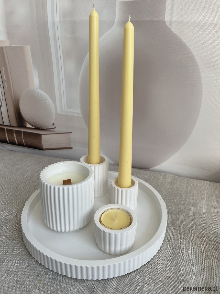 Minimalistyczna, biała taca wraz z dopasowanymi świecznikami tworzy stylową i nowoczesną dekorację, która pasuje zarówno do klasycznych, jak i nowoczesnych wnętrz. Zestaw doskonale sprawdzi się jako ozdoba stołu, komody lub prezent dla bliskiej osoby.