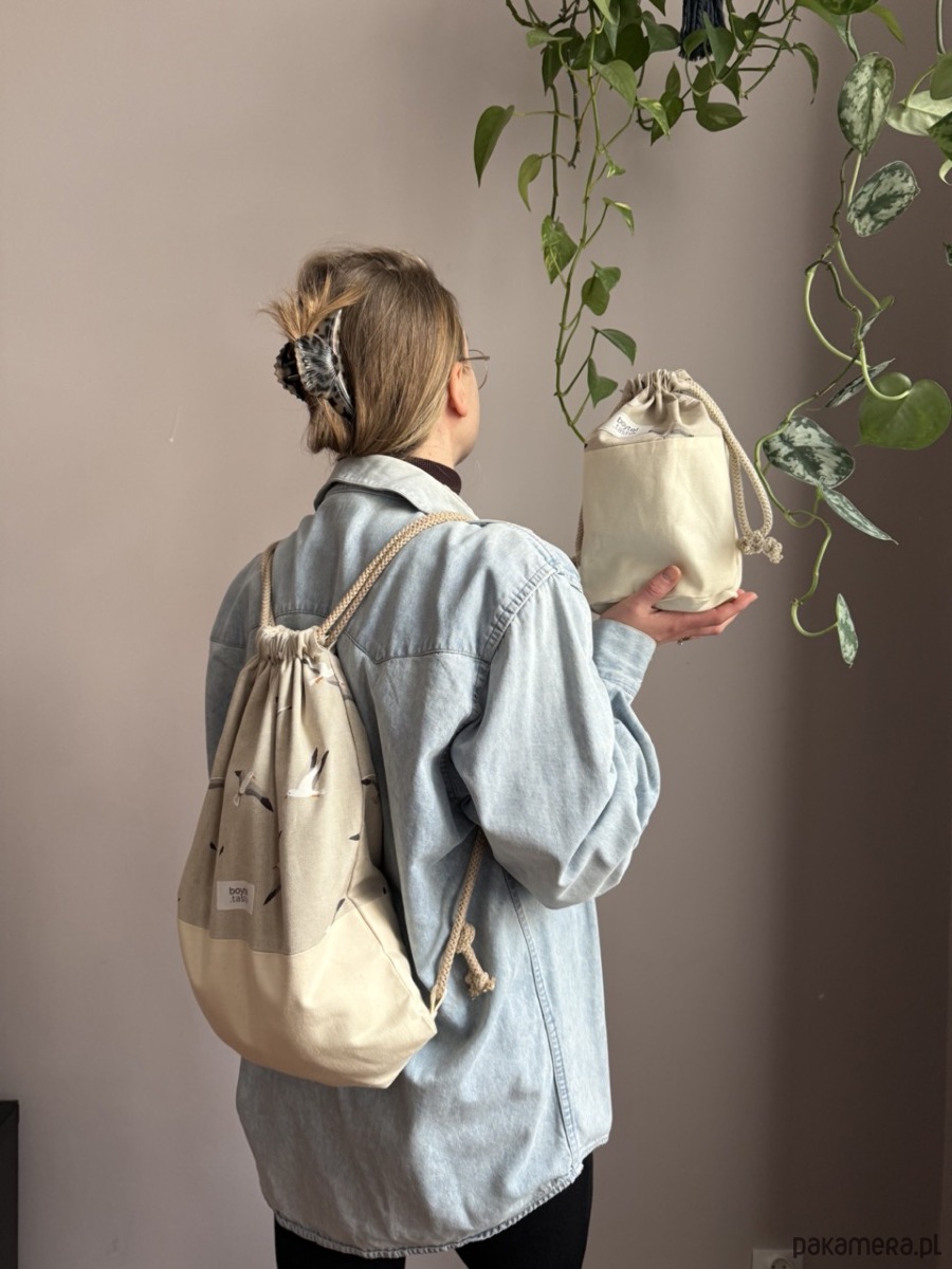 Zestaw bawełniany: workoplecak + kosmetyczka mewy