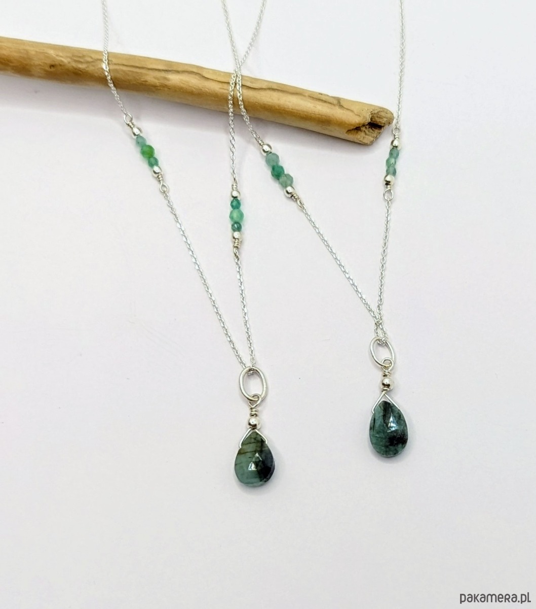 Naszyjnik ze szmaragdami zadowoli każdą wielbicielkę tych kamieni szlachetnych. Drobne kuleczki zostały wplecione w srebrny łańcuszek, a na środku znajduje się zawieszka z brioletką szmaragdu.