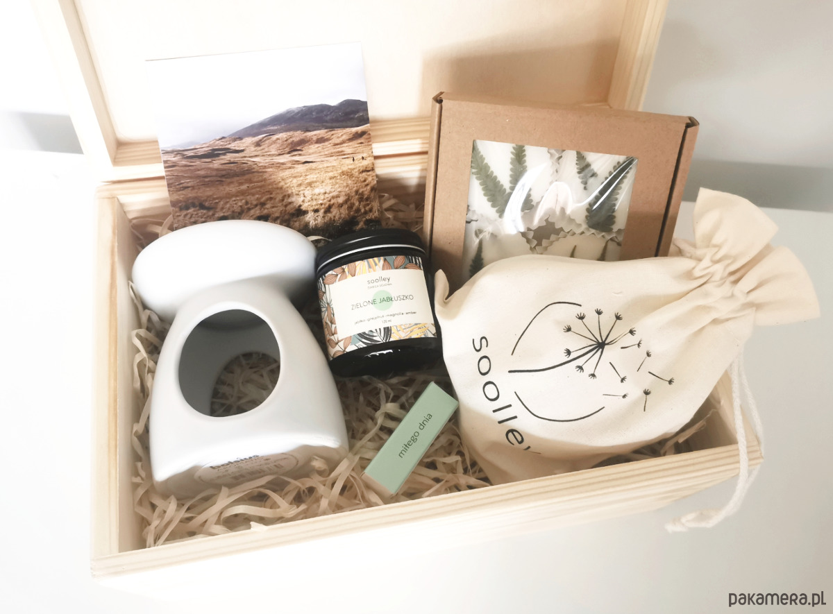 - wszystko zapakowane jest w drewniane pudełeczko z zamykanym wiekiem, na którym znajduje się wygrawerowane logo soolley oraz z naturalnym wypełniaczem w środku