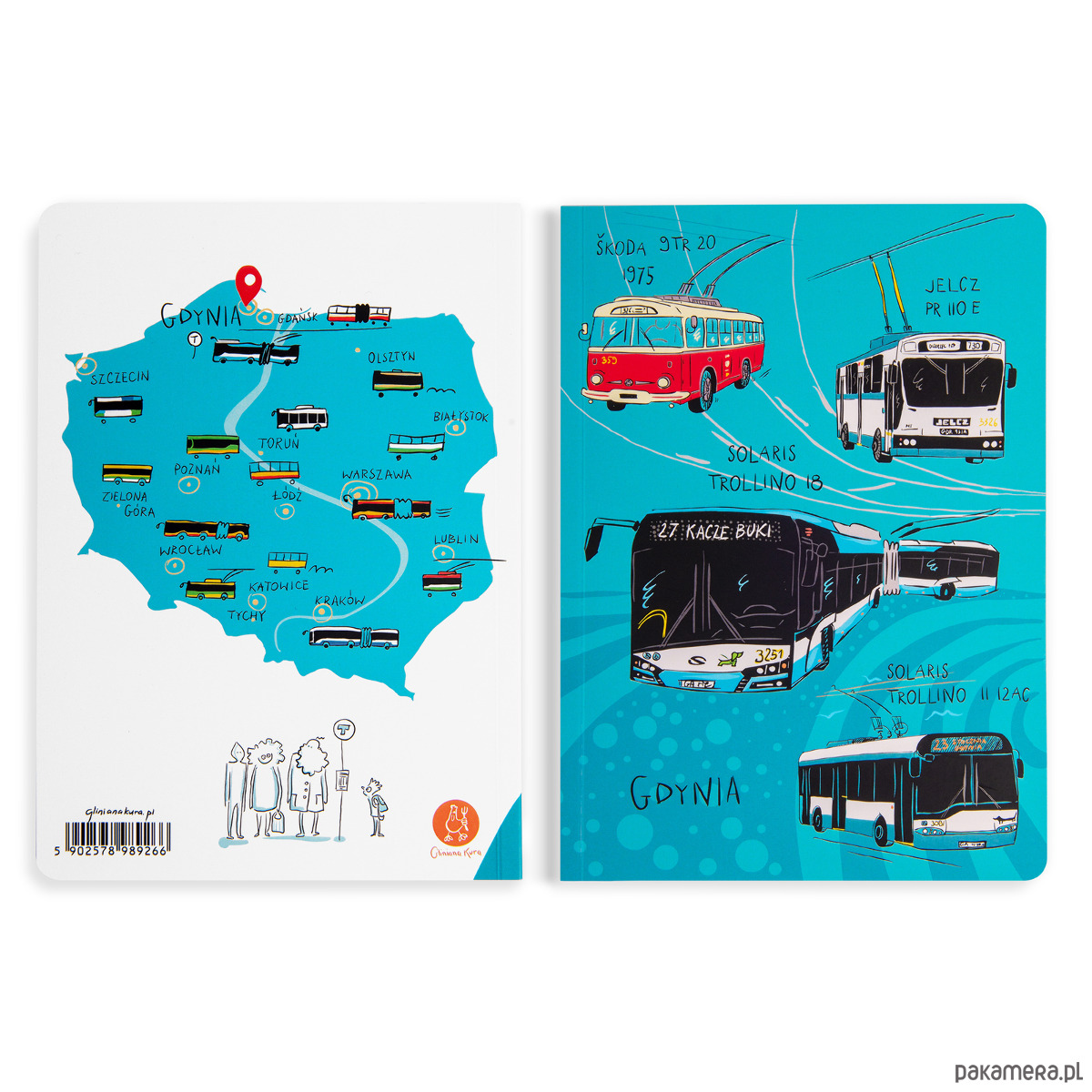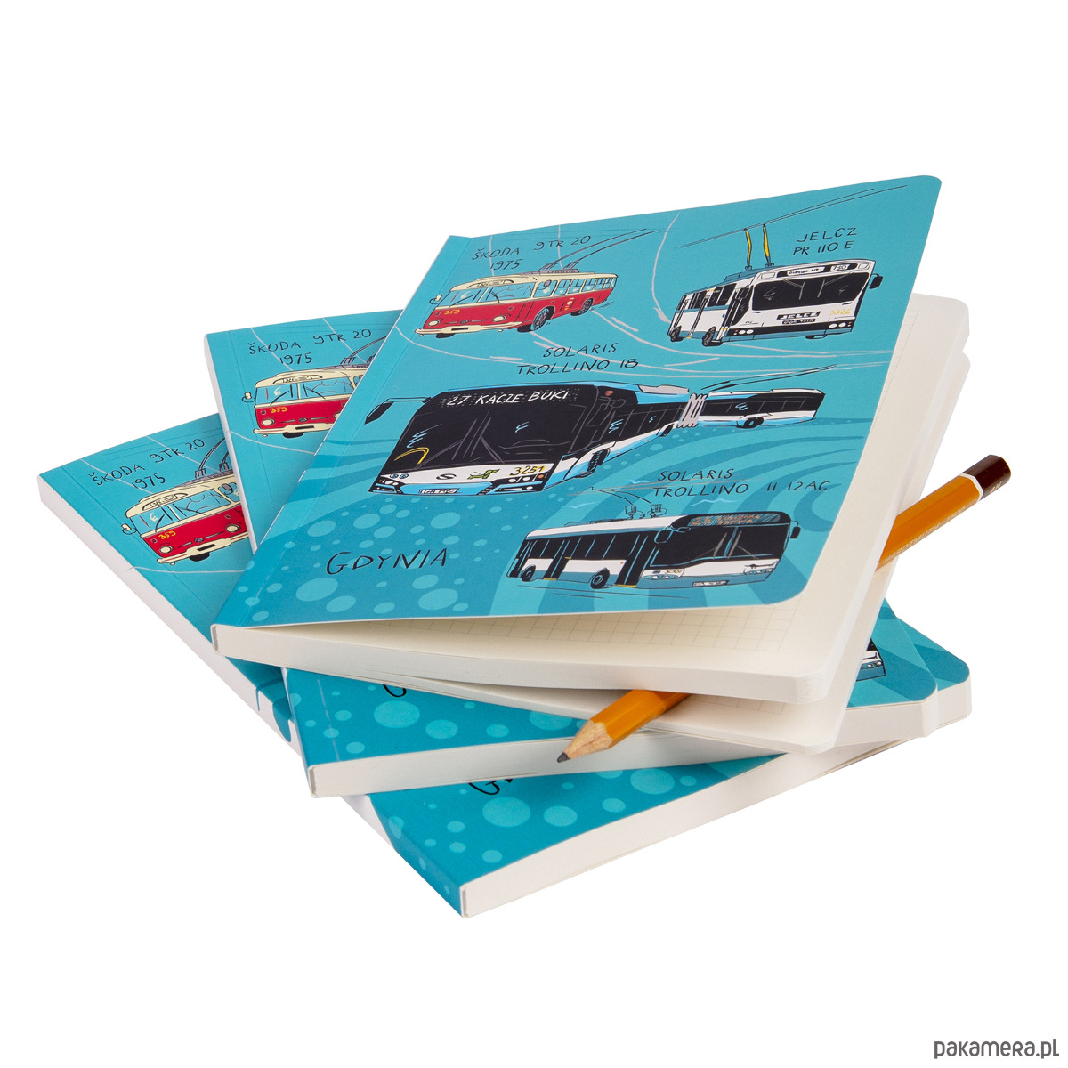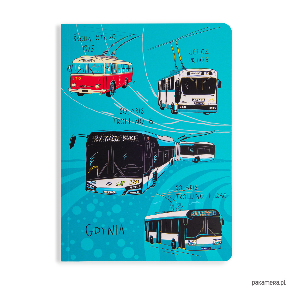 Zeszyt formatu A5 z ilustrowaną okładką przedstawiającą gdyńskie trolejbusy.