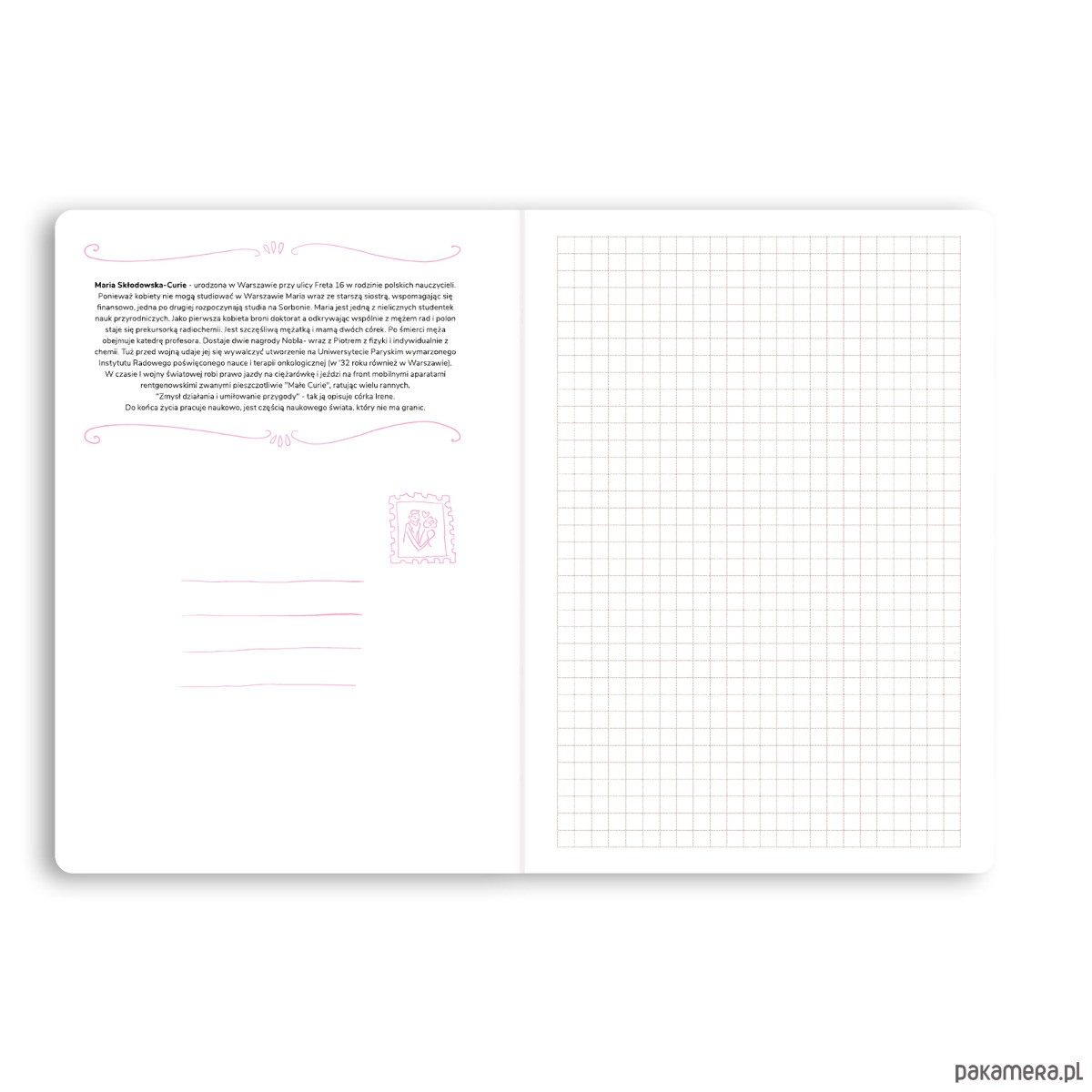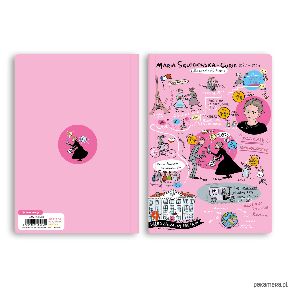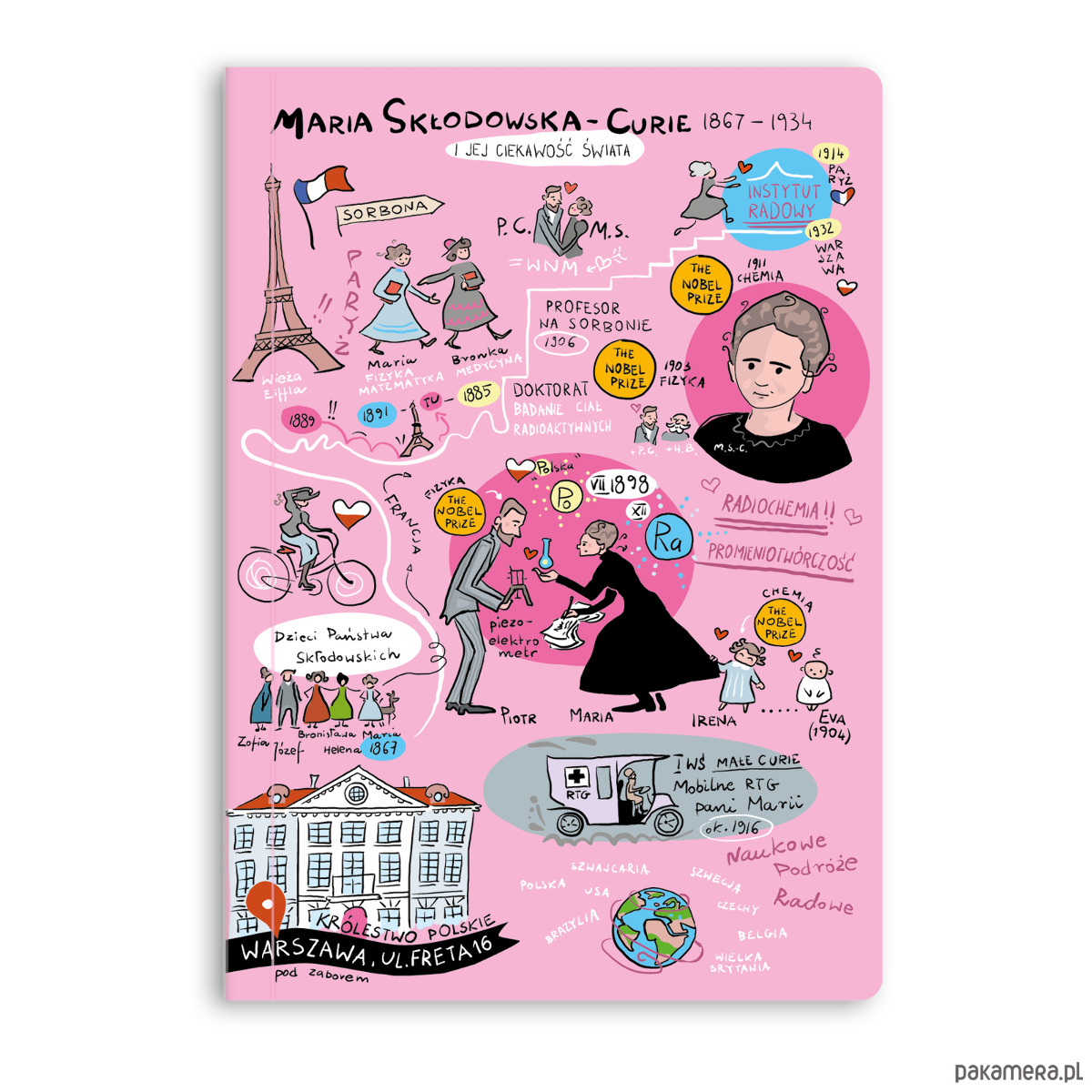 Zeszyt formatu A5 z ilustrowaną okładką przedstawiającą życie Marii Skłodowskiej-Curie.