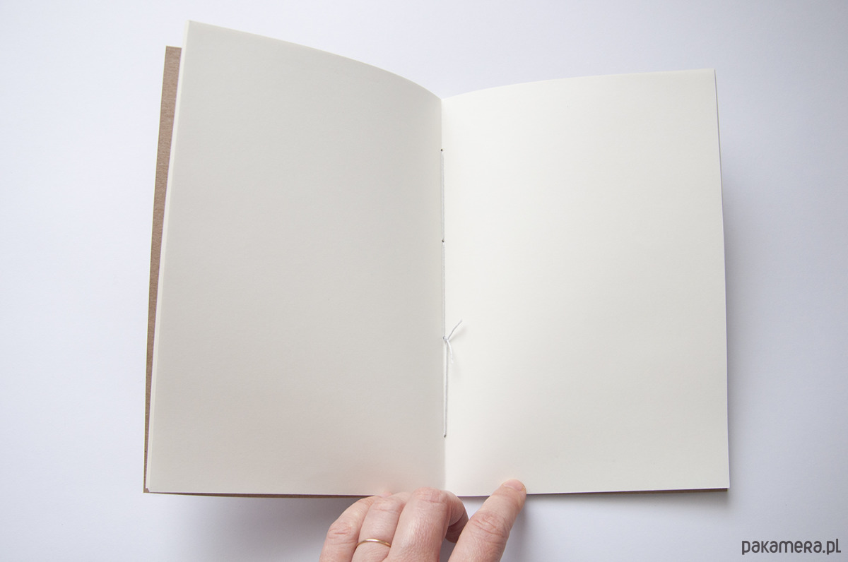 Całość jest ręcznie szyta kolorowymi nićmi. W środku posiada 40 stron gładkiego,