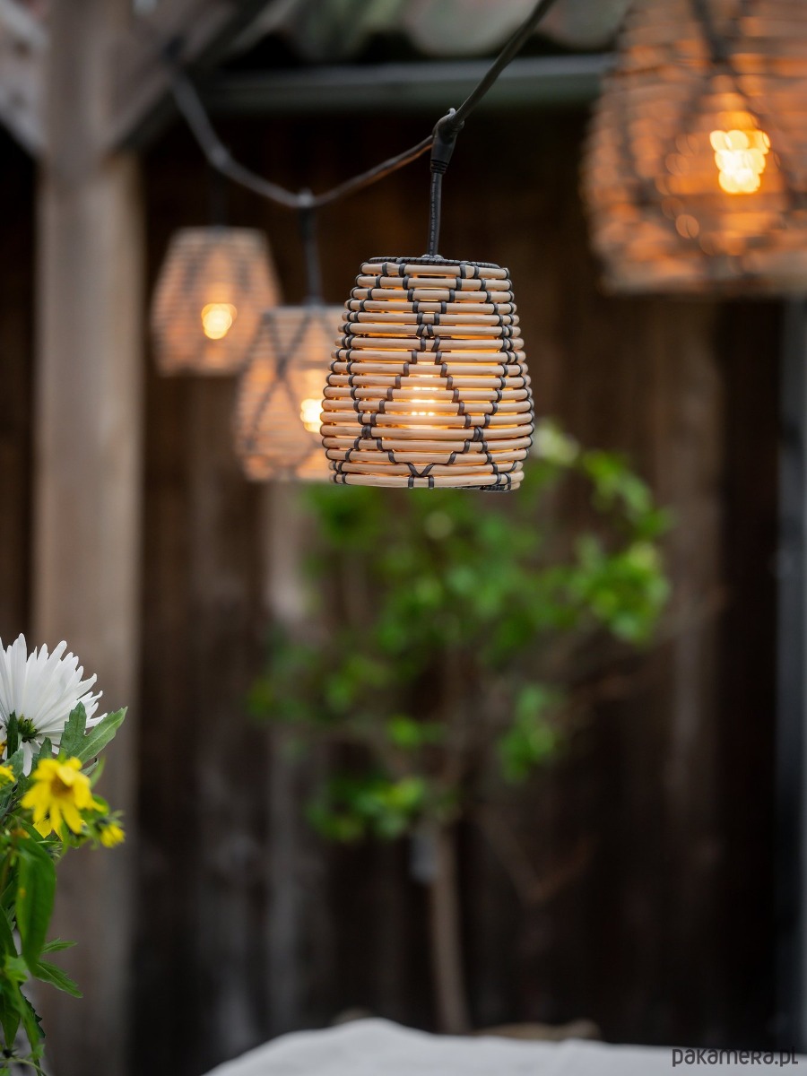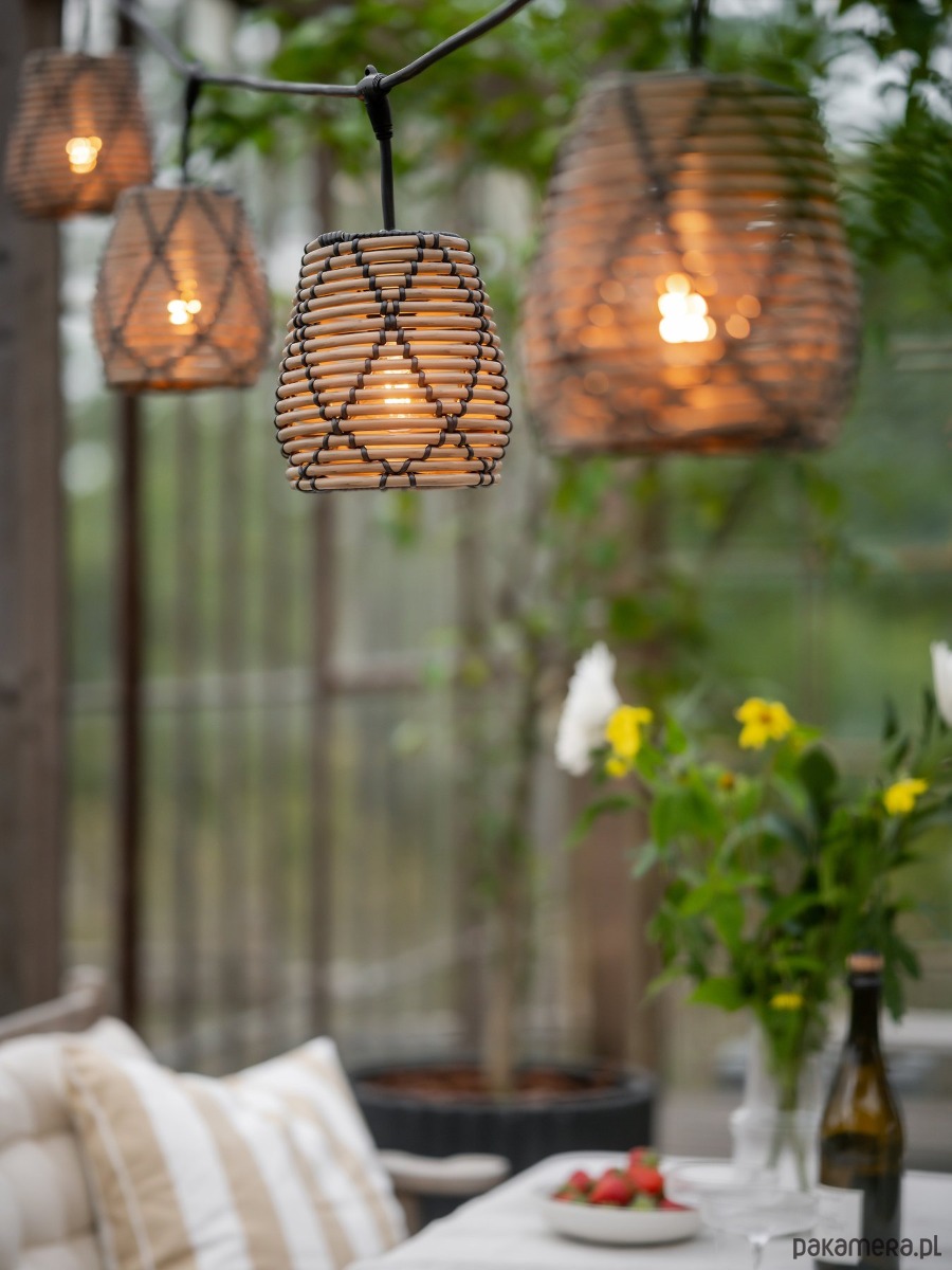 Łańcuch świetlny Flex Out Lollo to praktyczne i dekoracyjne rozwiązanie do oświetlenia przestrzeni zewnętrznych. Zestaw zawiera 5 kloszy w naturalnym kolorze z czarnym akcentem, wykonanych z grubszego, plecionego polirattanu. Nowoczesna forma i tekstura dodają uroku tarasom, altanom i ogrodom, tworząc przyjemną, nastrojową atmosferę.