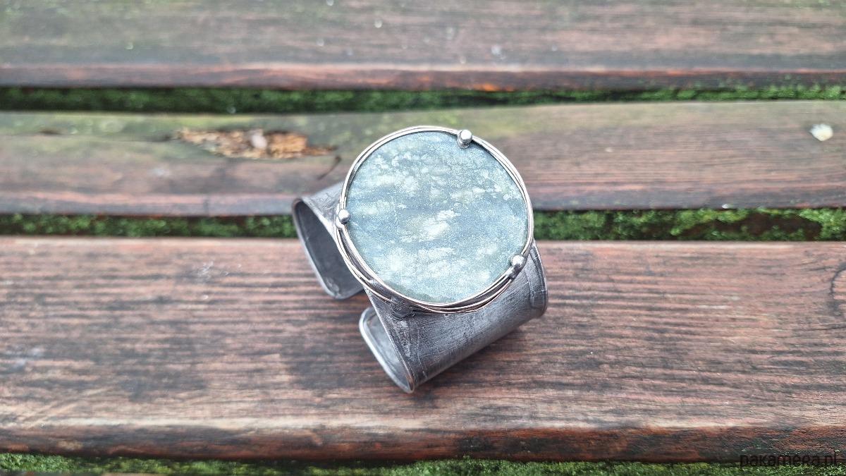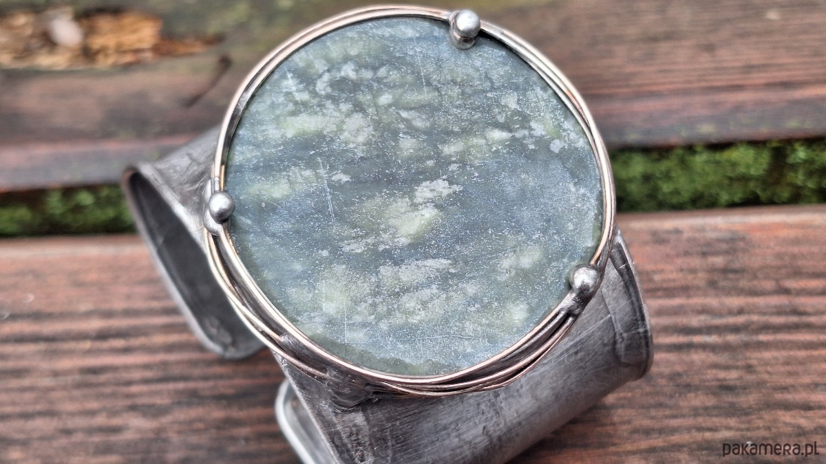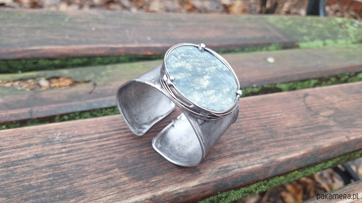 Bransoletka wykonana z miedzi, cyny i jadeitu. Szerokość ok. 5 cm. Regulowana.