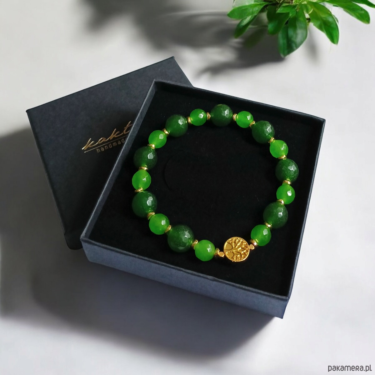Piękna bransoletka na solidnej lince elastycznej, wykonana z fasetowanych kul zielonego jadeitu 10 i 8mm, oraz przekładek ze złotego hematytu i drzewa życia - przekładki z hematytu.