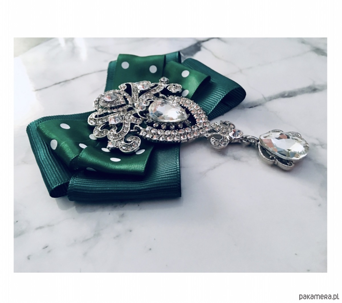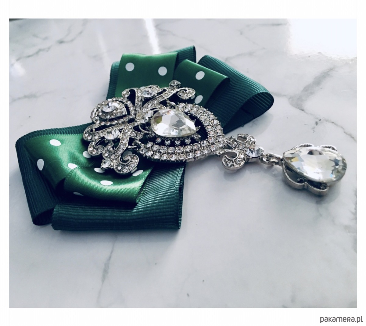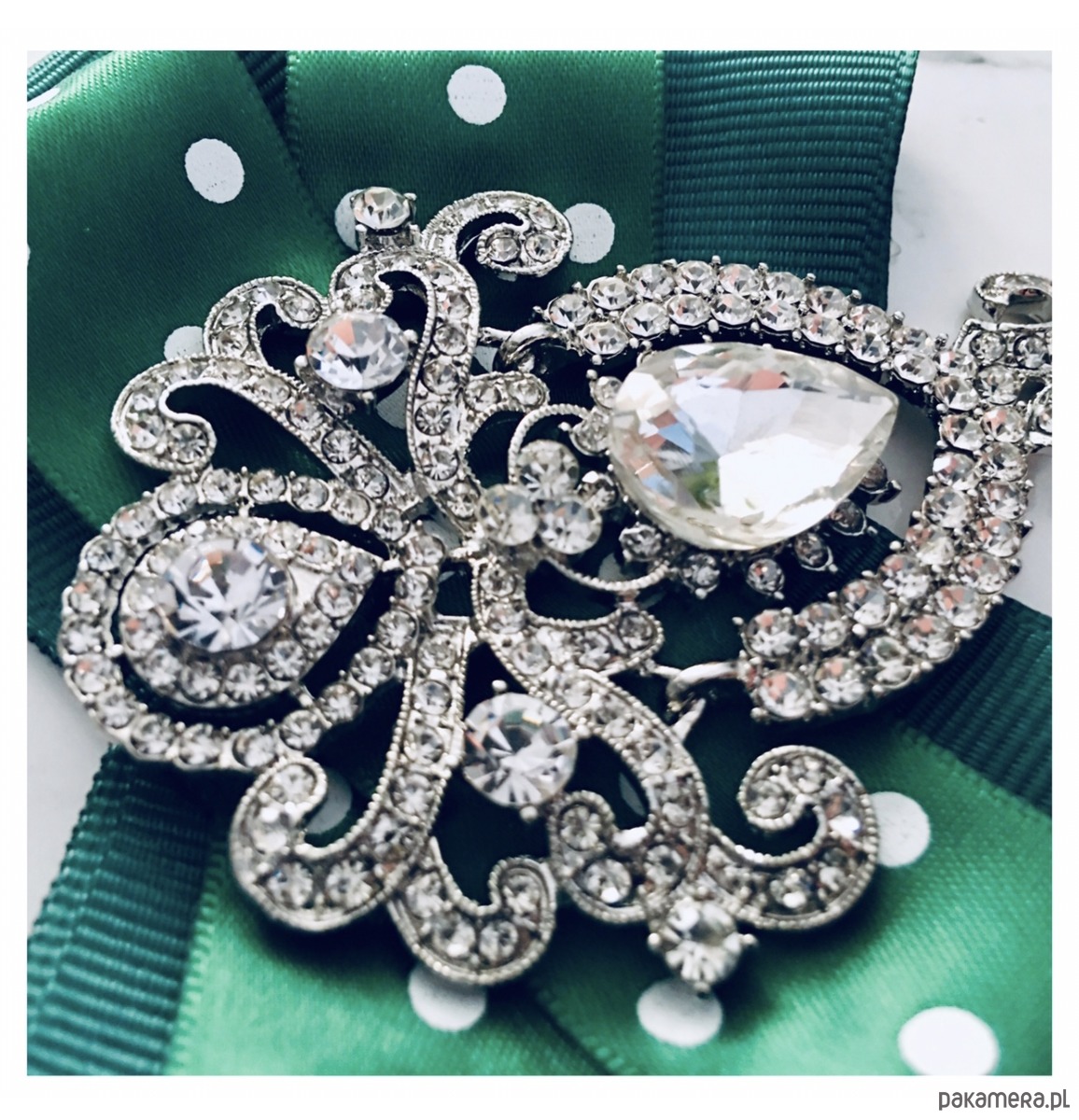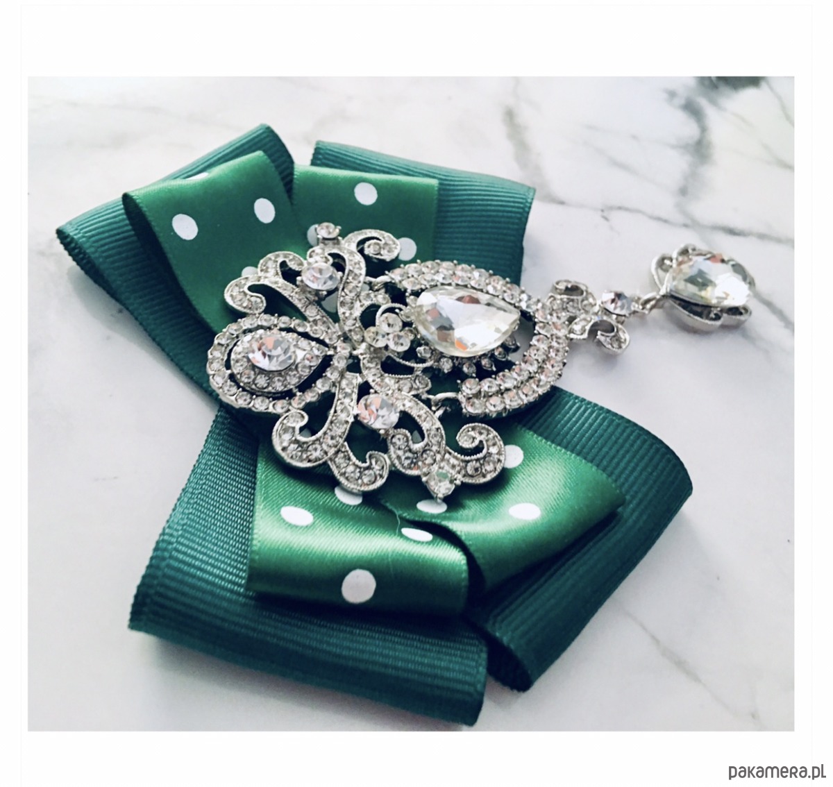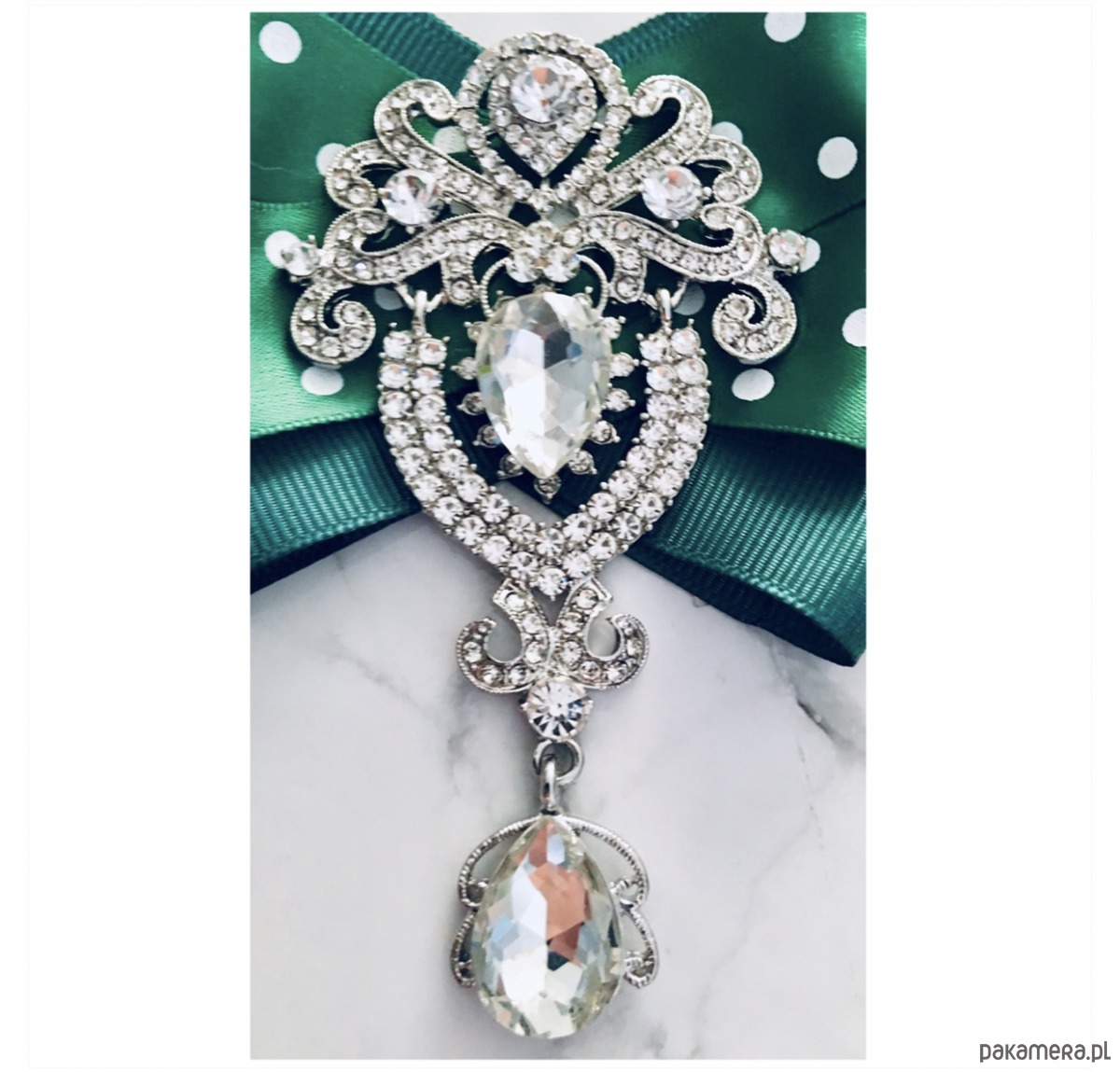 Broszka wykonana z wysokiej jakości taśm i dodatków. Brosza w dwóch kolorach zieleni i bieli. Urocze białe kropki. Na środku duża ozdoba biżuteryjna, Duży kryształ w otoczeniu mniejszych kamieni. Będzie idealnie pasować zarówno do koszul, bluzek, swetrów, sukienek, żakietów oraz do płaszczy, kurtek, szali i chust. Idealna do każdej stylizacji, zarówno do sportowej jak również do eleganckich stylizacji.
