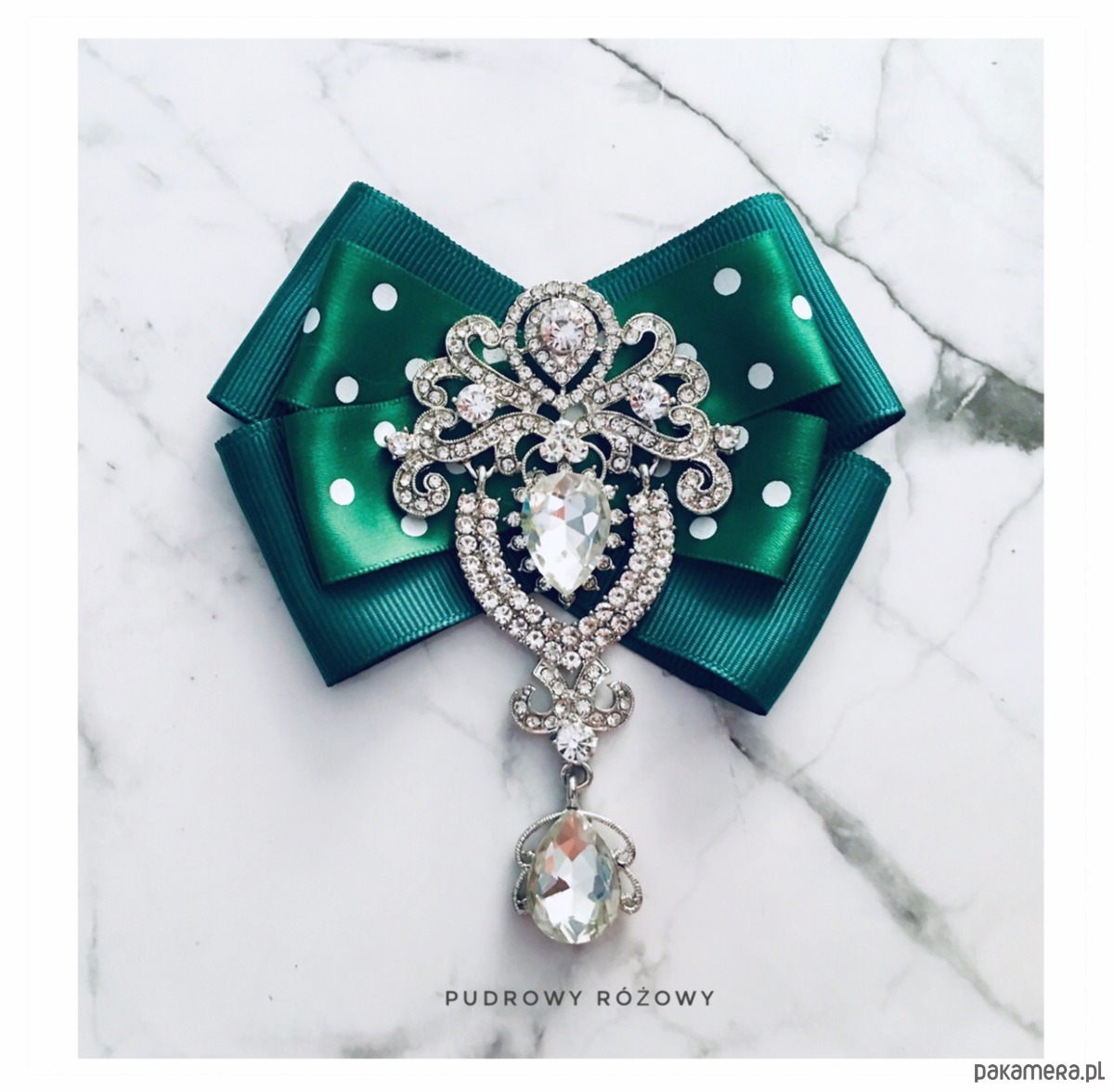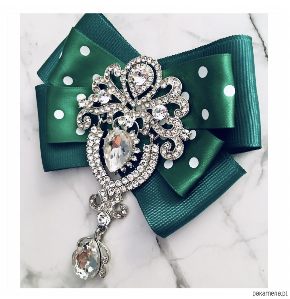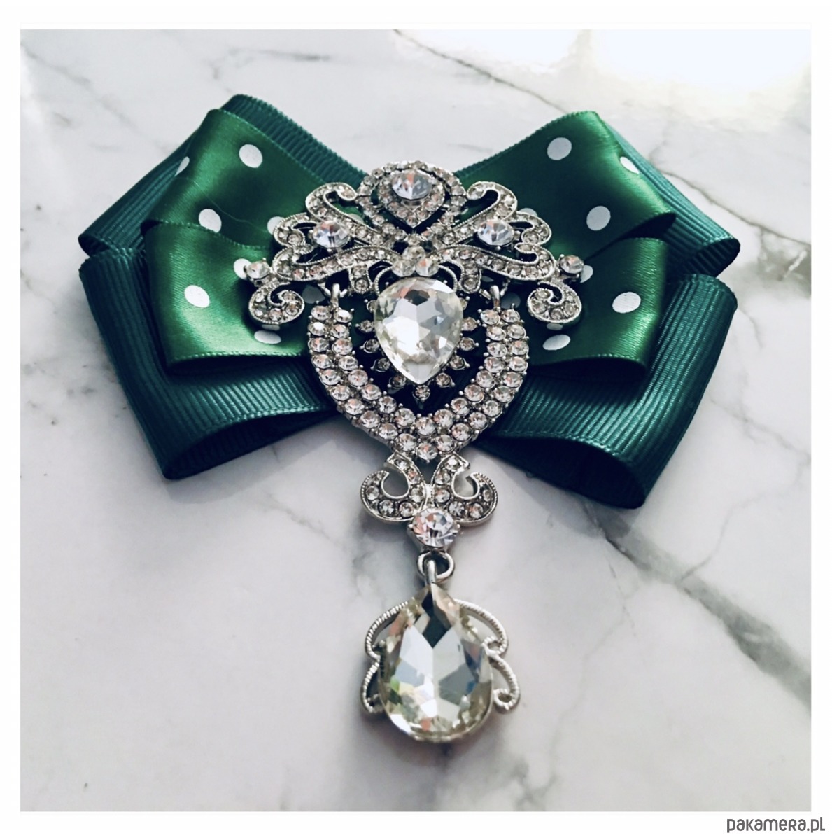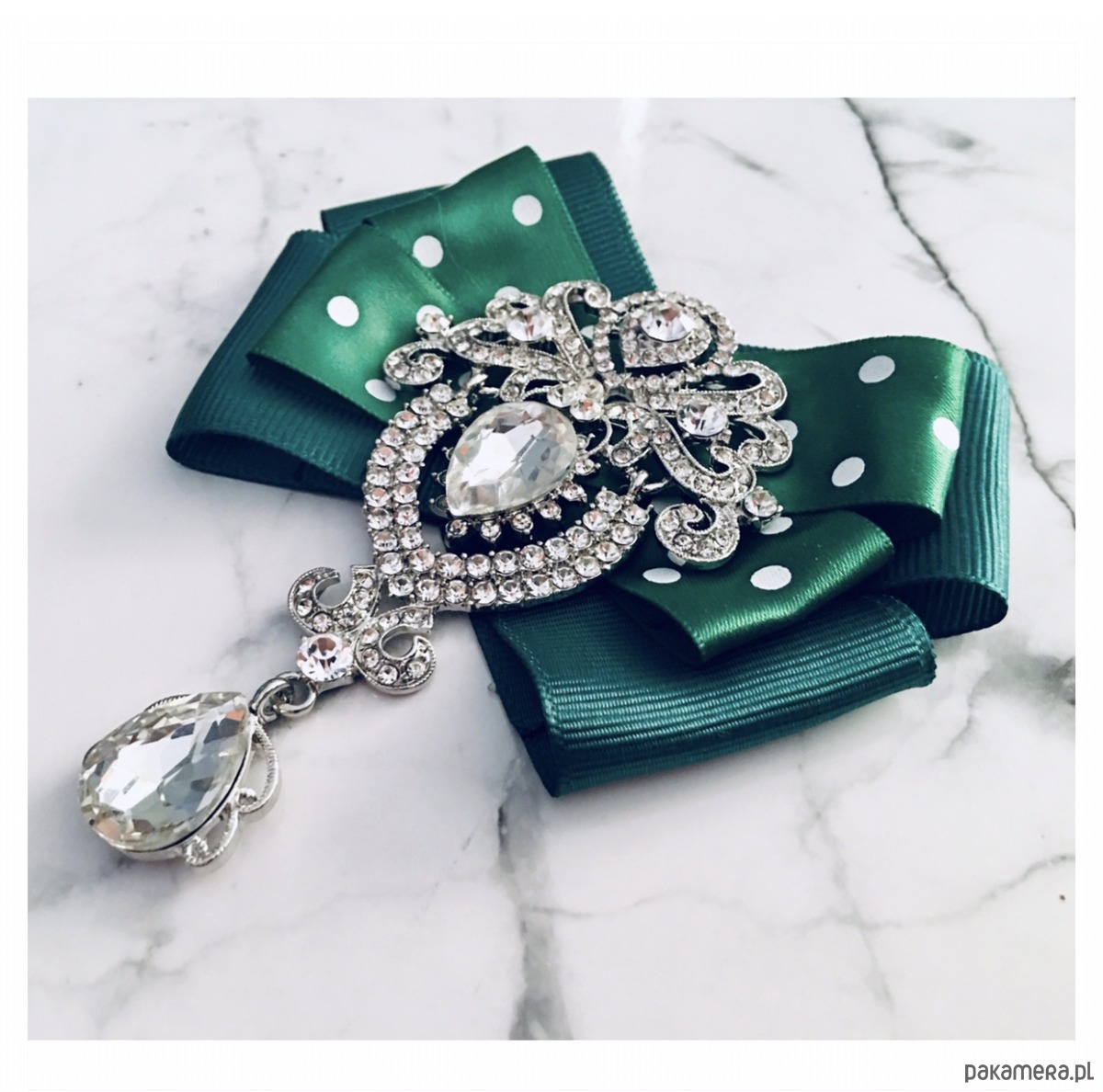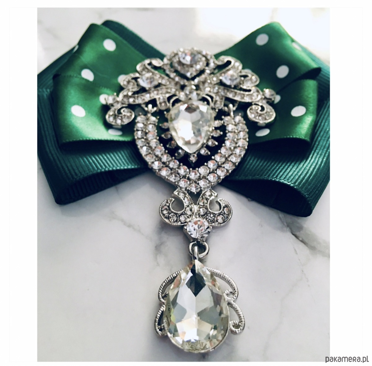 Broszka wykonana z wysokiej jakości taśm i dodatków. Brosza w dwóch kolorach zieleni i bieli. Urocze białe kropki. Na środku duża ozdoba biżuteryjna, Duży kryształ w otoczeniu mniejszych kamieni. Będzie idealnie pasować zarówno do koszul, bluzek, swetrów, sukienek, żakietów oraz do płaszczy, kurtek, szali i chust. Idealna do każdej stylizacji, zarówno do sportowej jak również do eleganckich stylizacji.