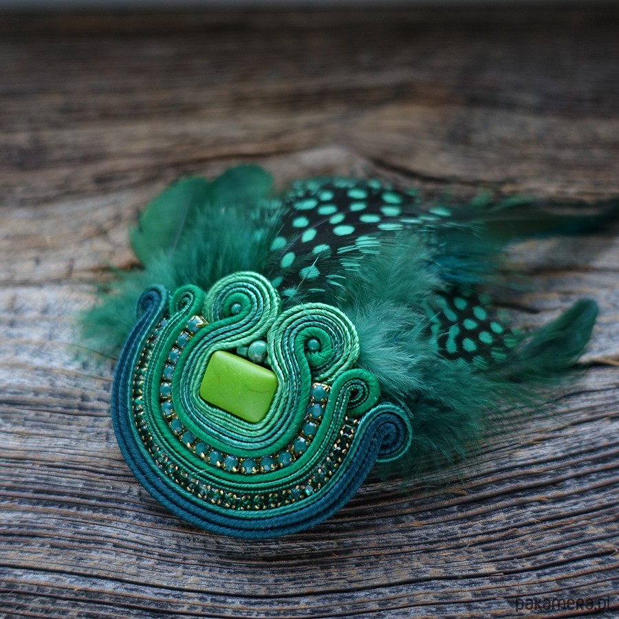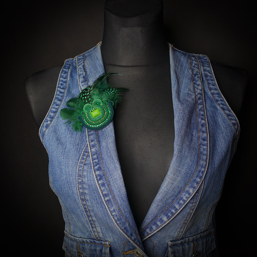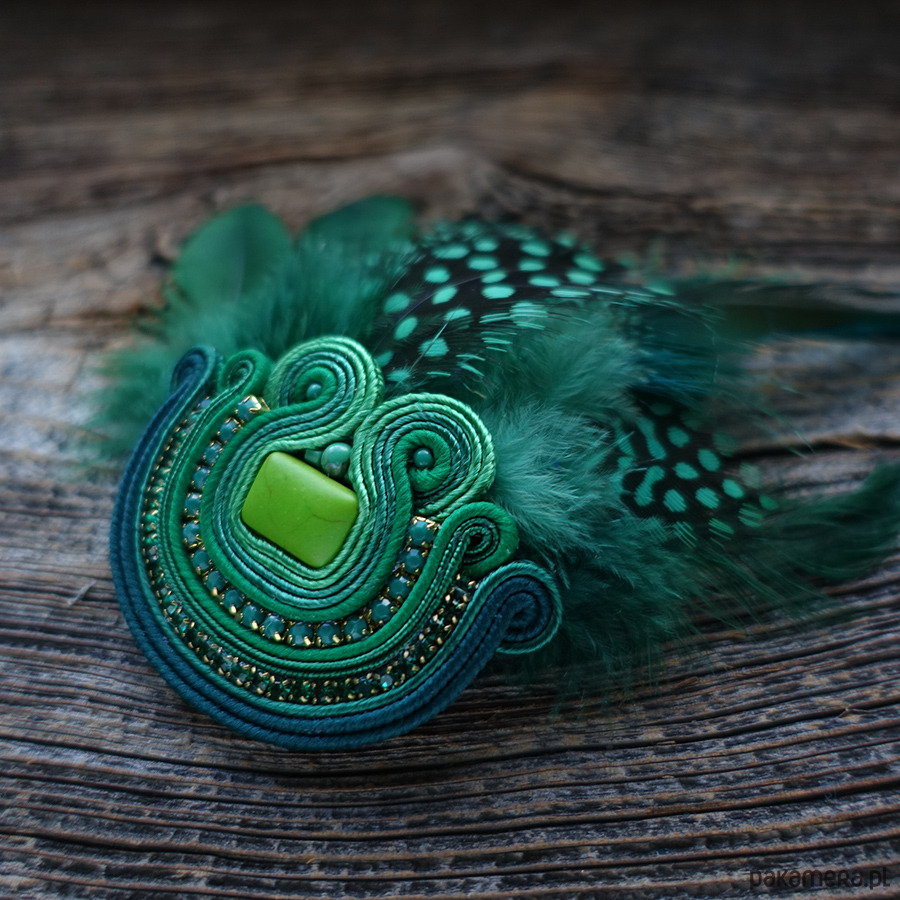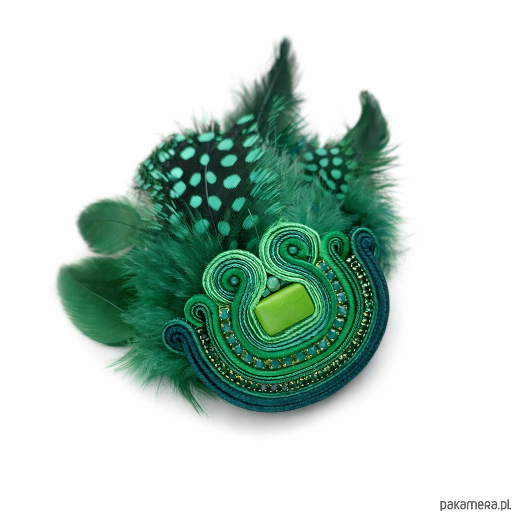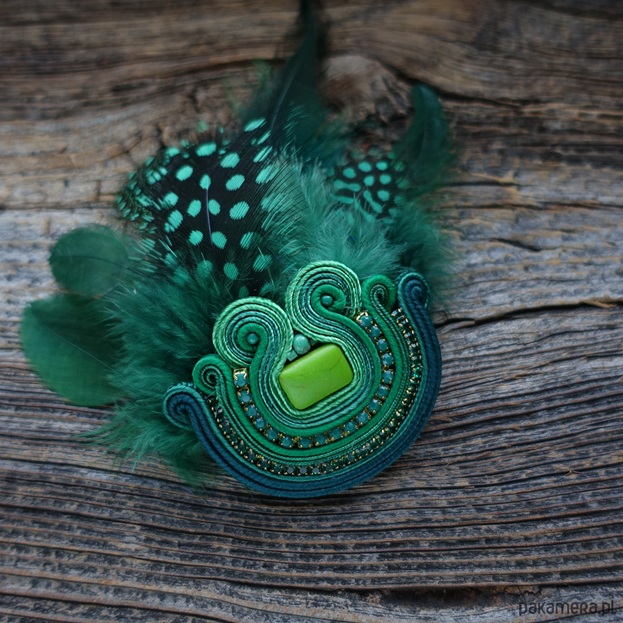 Zielona broszka soutache z piórami
