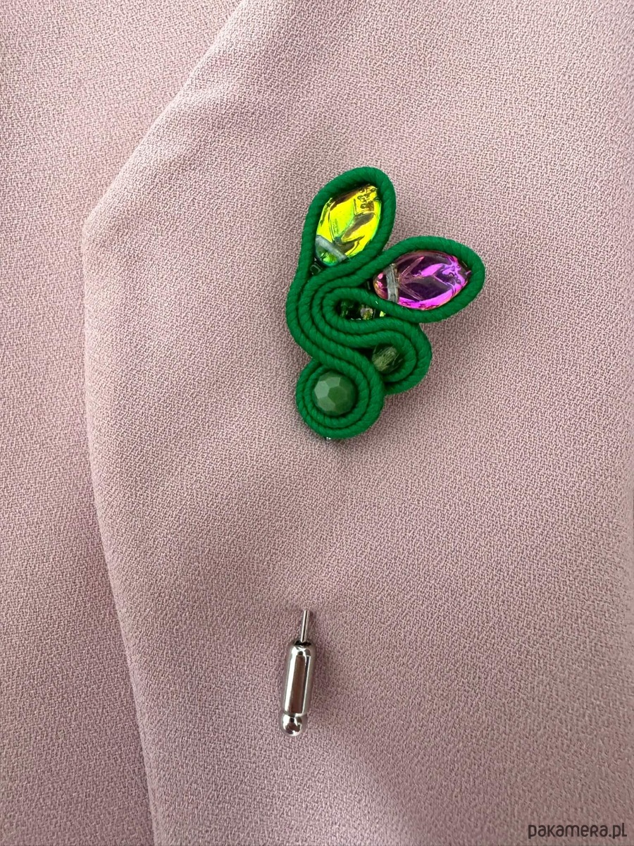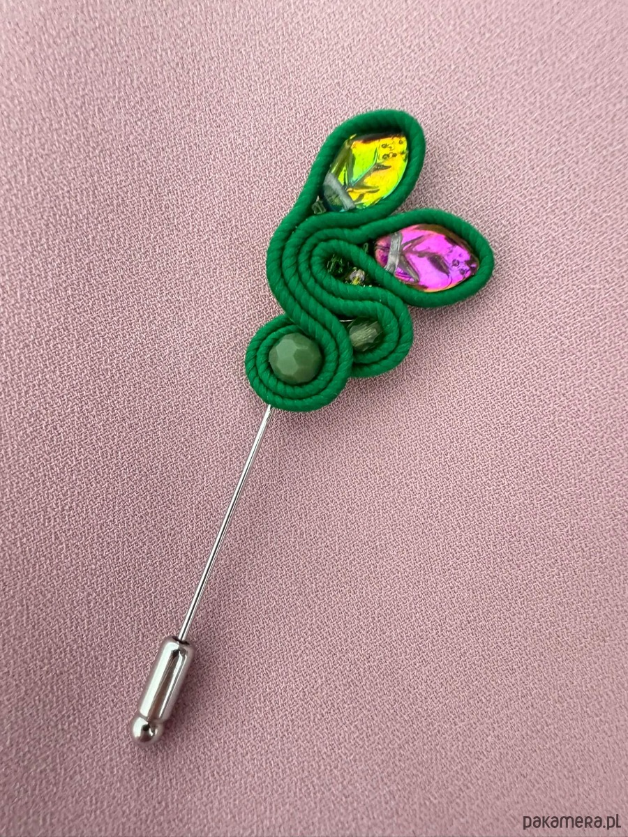 Ręcznie wykonana zielona broszka sutasz na szpilce, inspirowana naturalnymi kształtami i roślinną lekkością. Kompozycja z ozdobnych sznurków sutasz oraz połyskujących liści tworzy subtelną, ale wyrazistą formę.