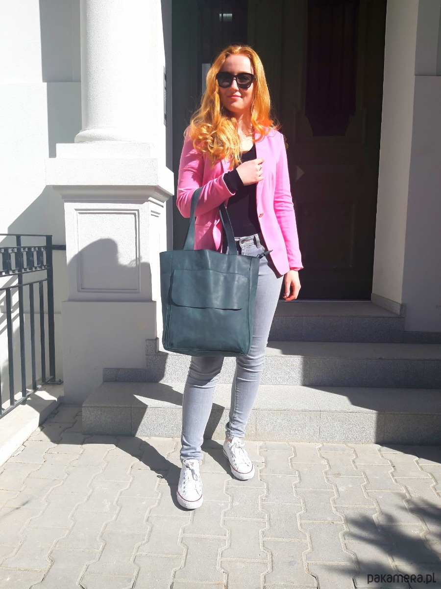 Na ostatnim zdjęciu jest pokazana na modelce inna torba, w tym samym kształcie i wielkości, ale z innej skóry. Chciałam pokazać proporcje i wielkość na sylwetce.