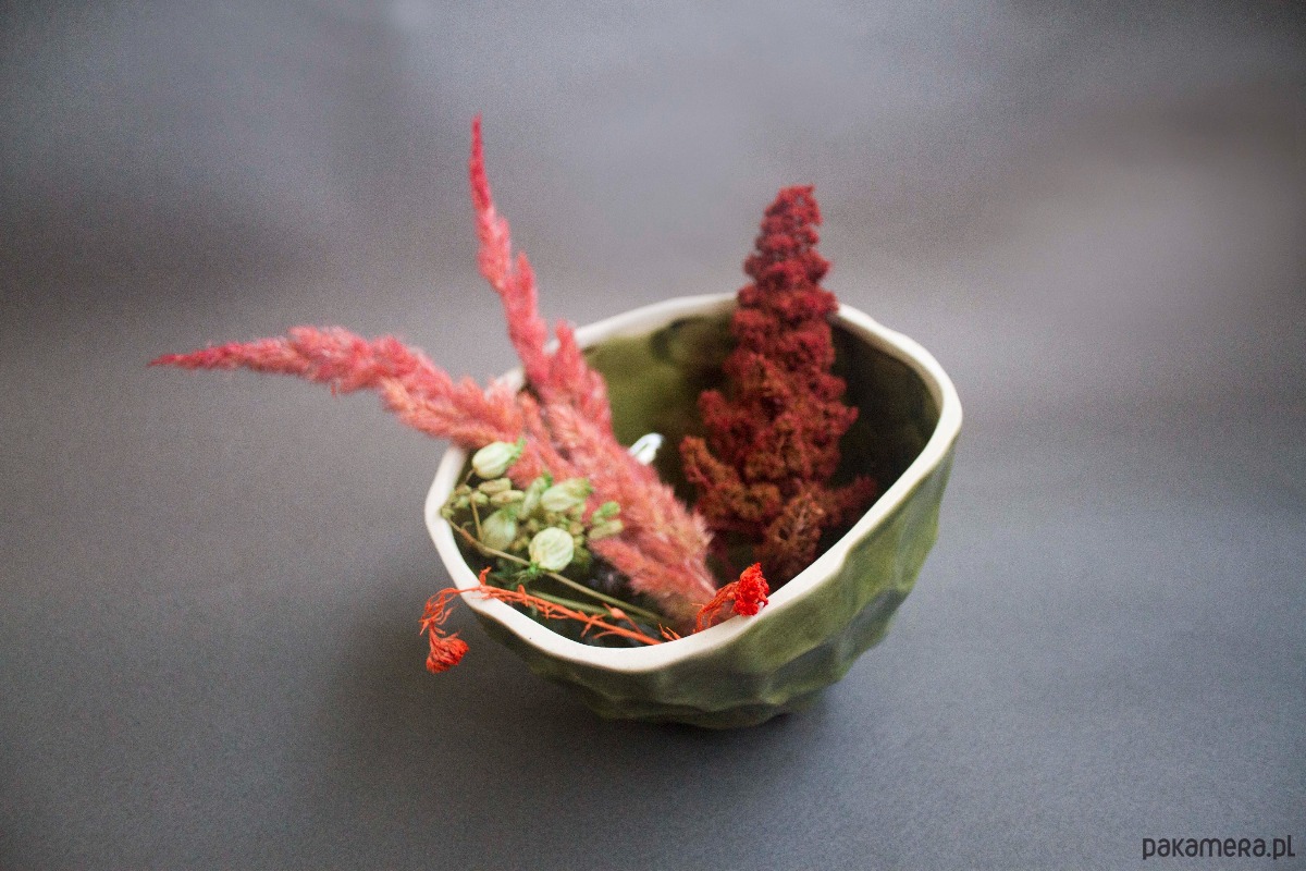 Asymetryczna, o organicznym kształcie miska idealnie nada się na przystawki lub przekąski. Można ją postawić na jednym z dwóch wypłaszczeń dna, dzięki czemu lekko pochylona stanowi doskonały element stołu przyciągający uwagę. Dobrze też leży w dłoni, gdy chcemy z przekąskami przejść się tu i tam, np. na imprezie, albo na taras w celu kontemplacji. Polecana szczególnie introwertykom, stanowi dobry punkt do zaczęcia rozmowy:D