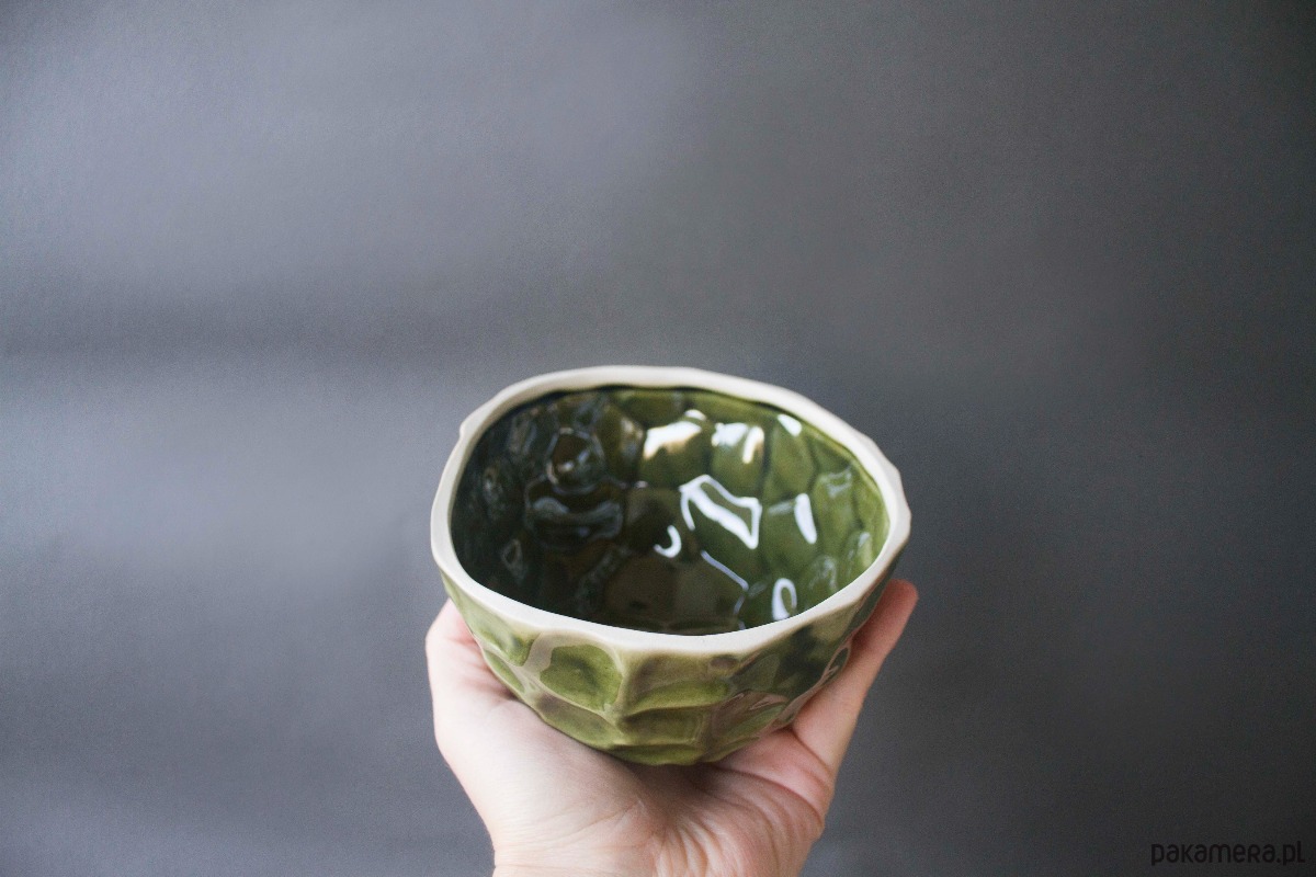materiał: szkliwiona kamionka, szkliwo zielone półprzezroczyste