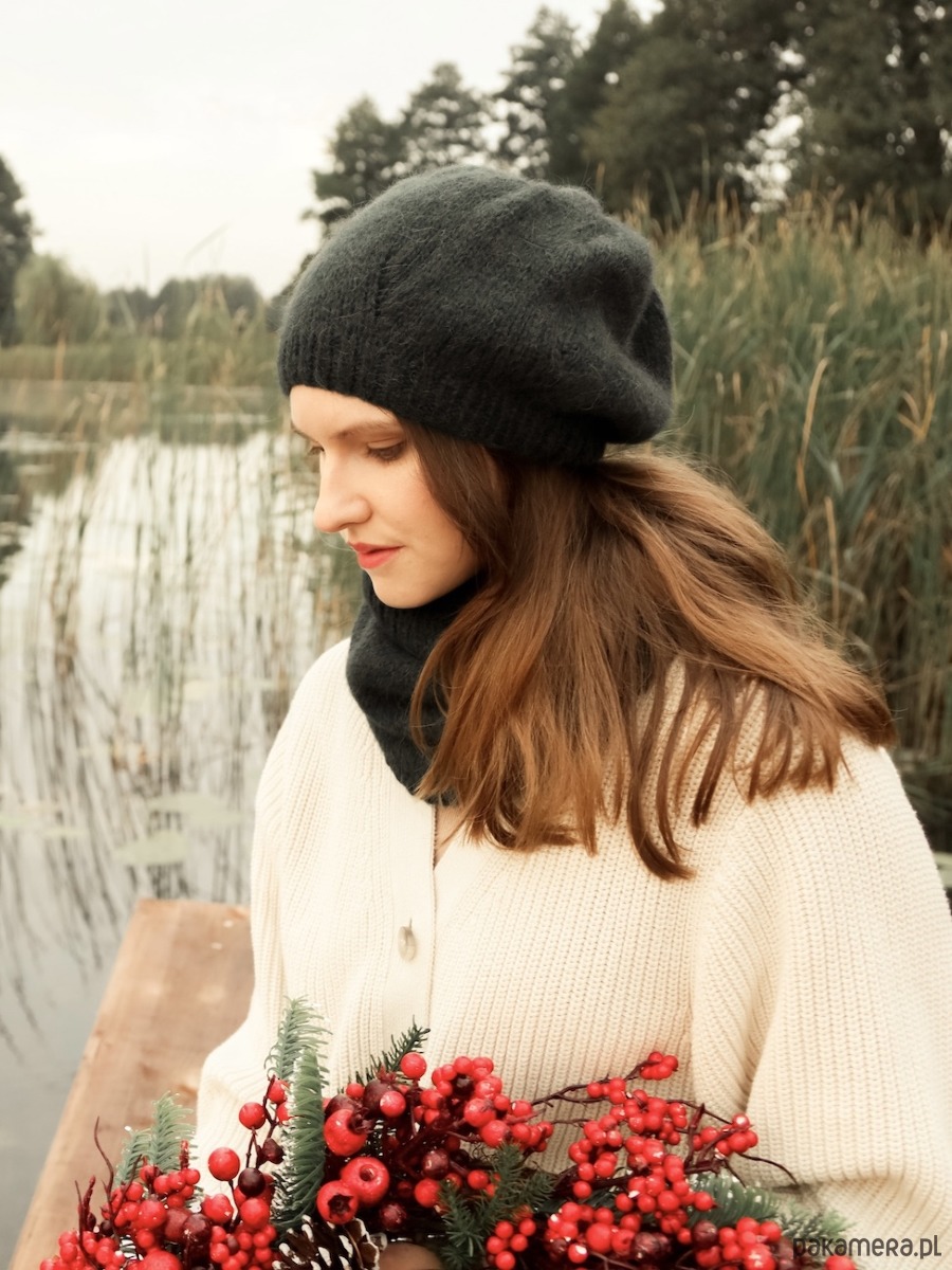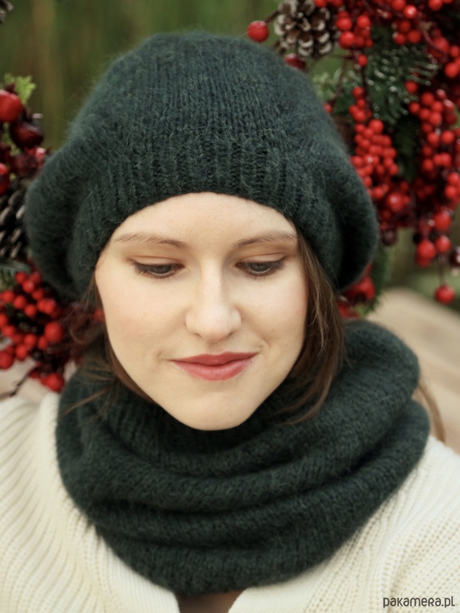 Ciemnozielona czapka z alpaki to element kolekcji lekkich jak piórko czapek beretowych, które nie zrujnują Twojej fryzury. Wszystkie czapki z tej serii są bardzo twarzowe, gdyż możesz “modelować” je, układając i nosząc na różne sposoby. Zaprojektowałam je nieco na kształt beretu. To oznacza, że przylegają przy twarzy, nie zsuwając się z głowy, a ich pozostała część się rozszerza. Szerszą część możesz uformować z tyłu lub zawadiacko przekręcić na bok.