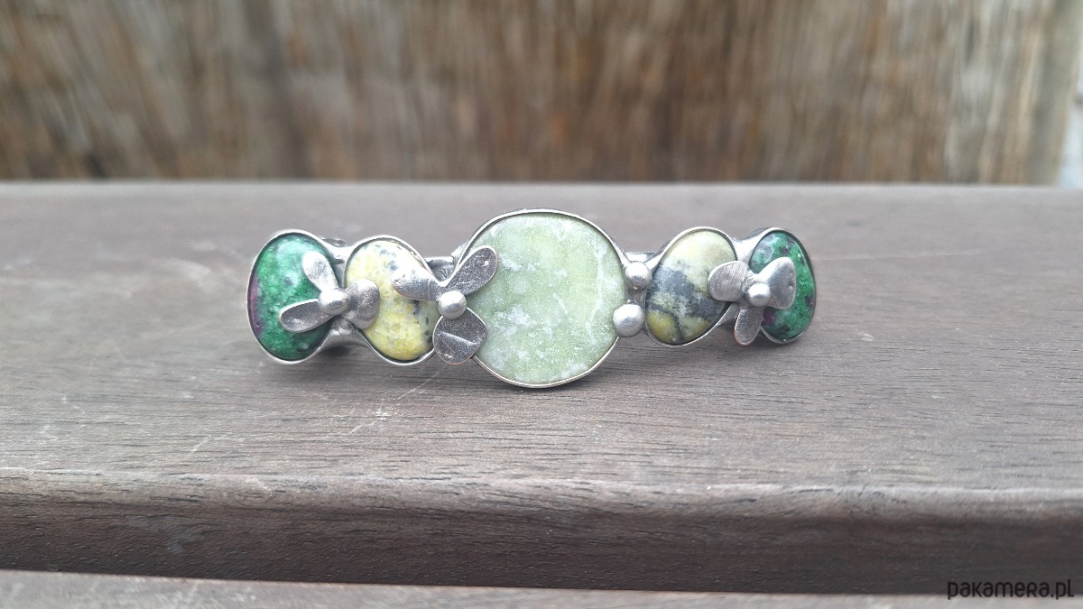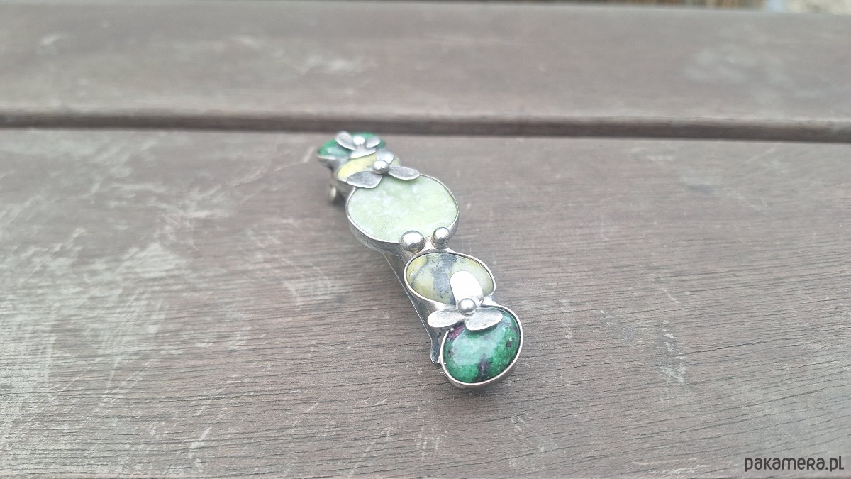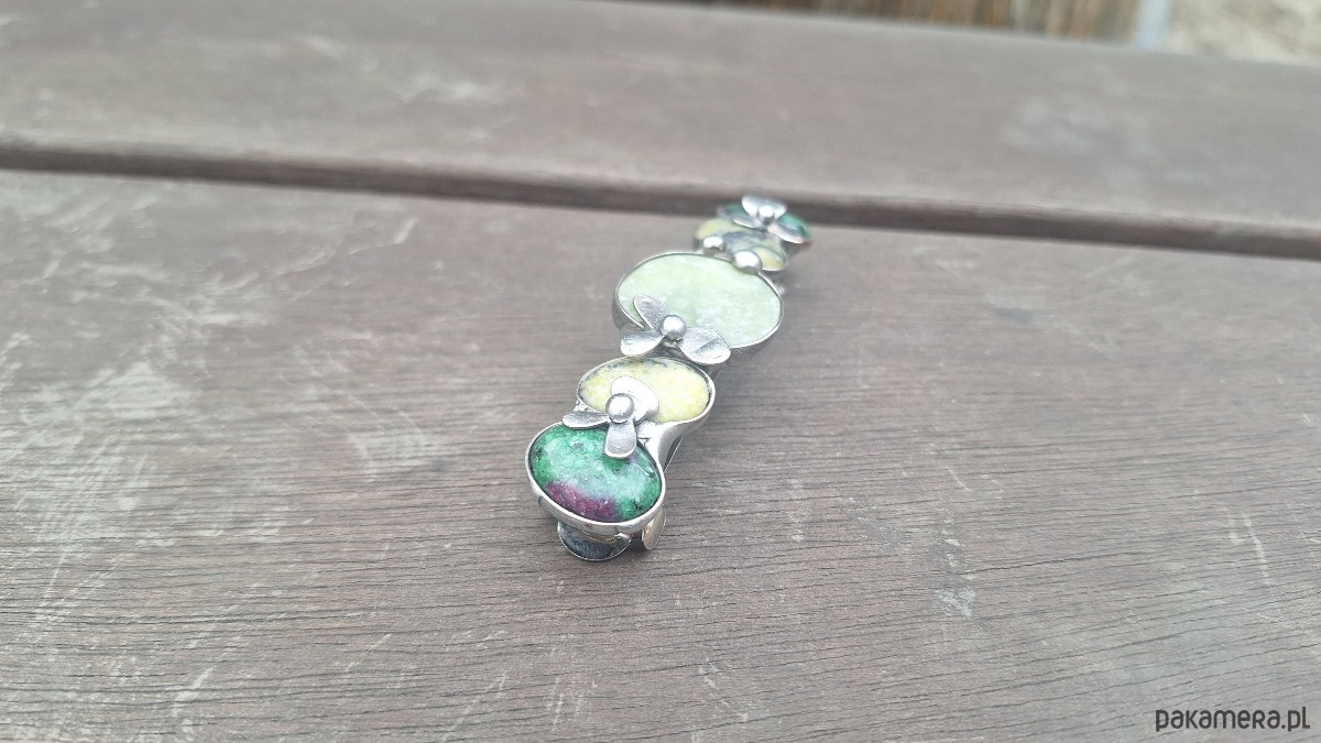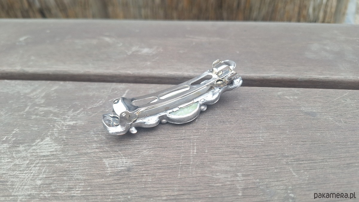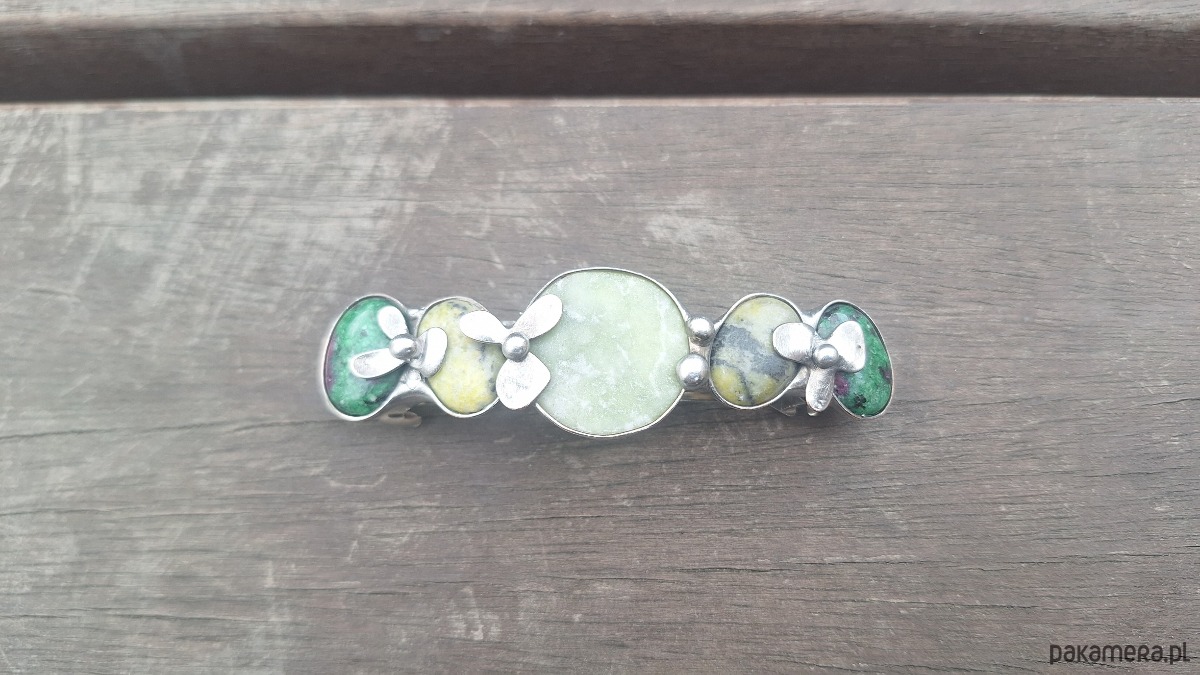 Klamra do włosów, wykonana z miedzi, cyny, jadeitu, zoisytów i lizardytów. Wymiary ok. 8 na 2 cm. Zapięcie 6 cm, metalowe.