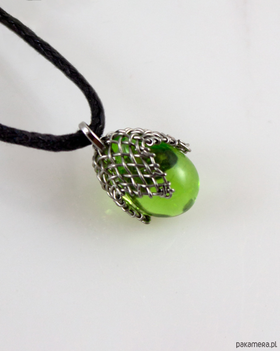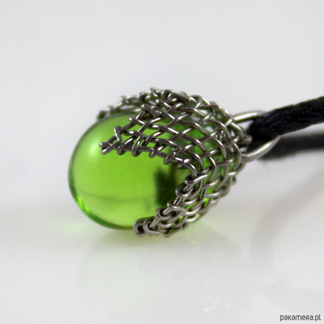Szklana kropla oprawiona w ręcznie formowaną metalową siateczkę. Całkowita wielkość wisiorka to ok. 2 cm. W komplecie bawełniany sznurek do zawieszenia.