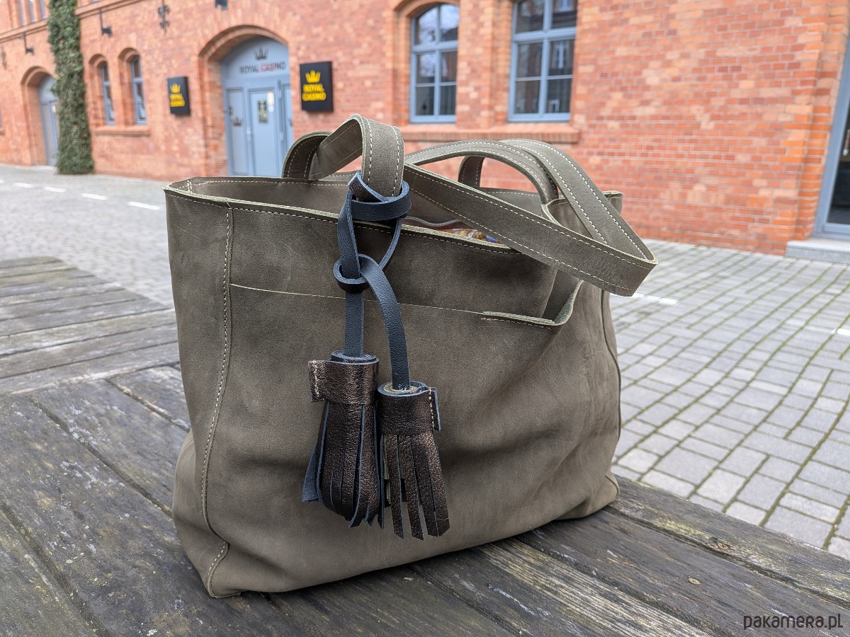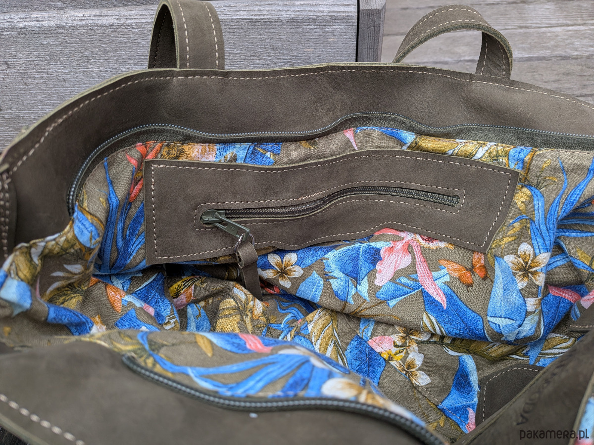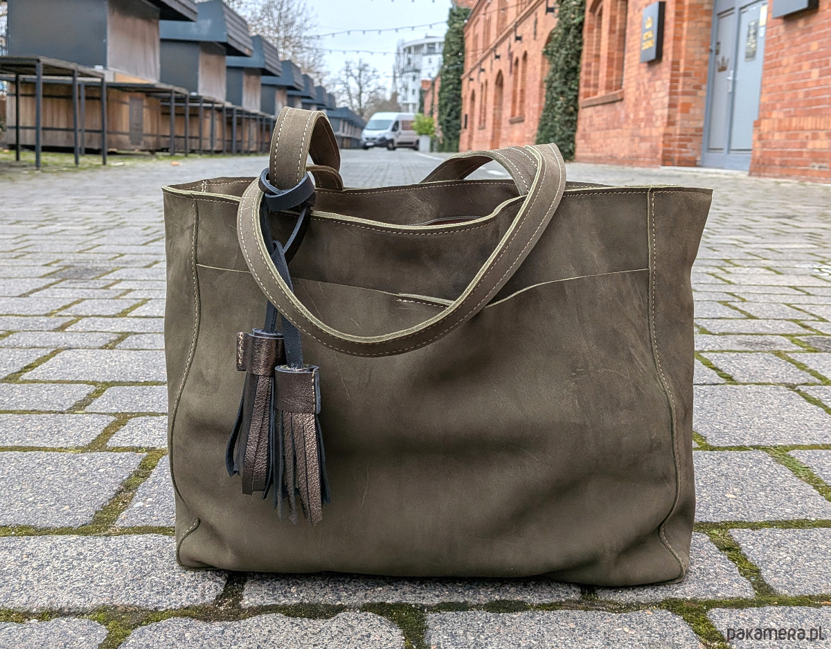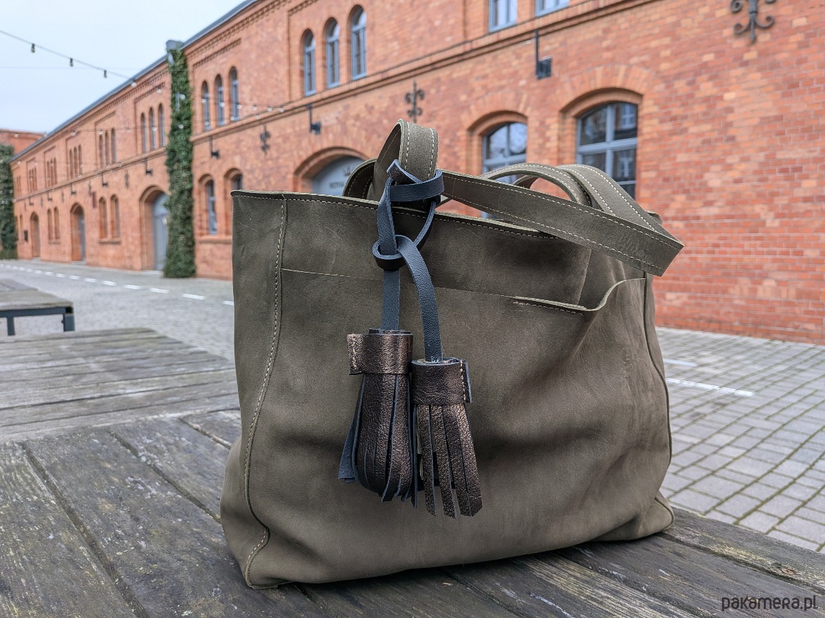 Uszyta z naturalnej skóry nubukowej. Odcień ciemno zielony, taki trochę leśny, trochę wojskowy. Z przodu zewnętrzna kieszeń zapinana na magnes.