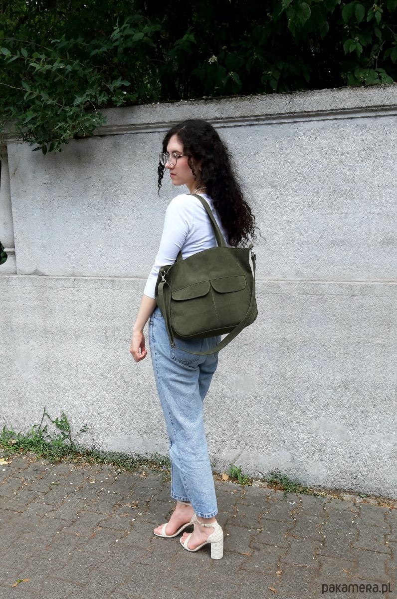 Duża, uszyta ze skóry naturalnej w kolorze leśnej zieleni.
