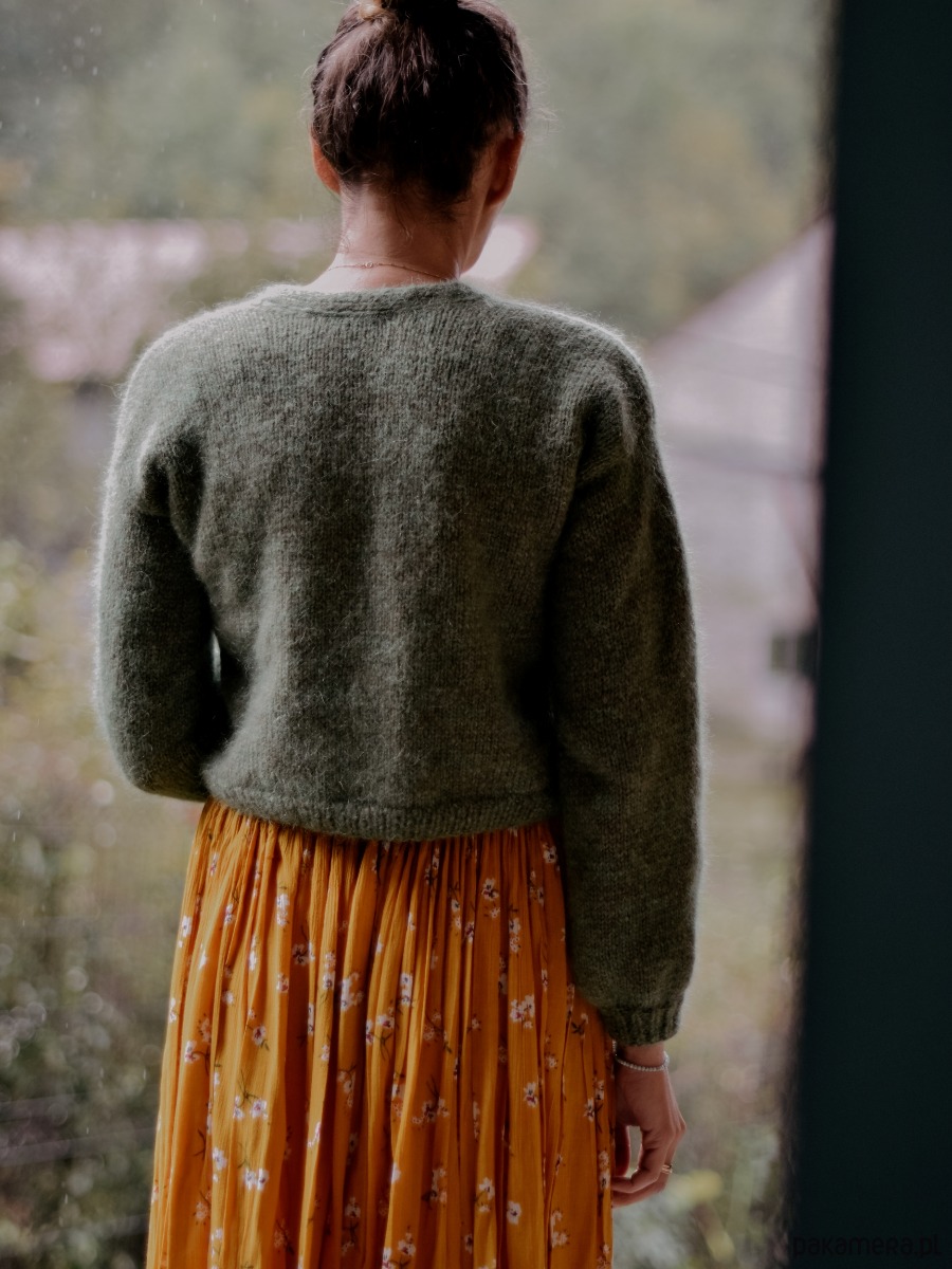 Krótki sweter idealny na jesienne chłody. Robiony z niezwykle miękkiej, puchatej i lekkiej jak piórko włóczki - przędzonej specjalną techniką "dmuchania". Bardzo przyjemny dla skóry i nie drapie (sprawdzone przez dzieci). Z przyjemnością otulisz się tą puchatą pięknością, wtulisz się w niego by zapomnieć o chłodach.