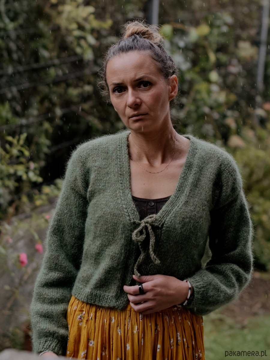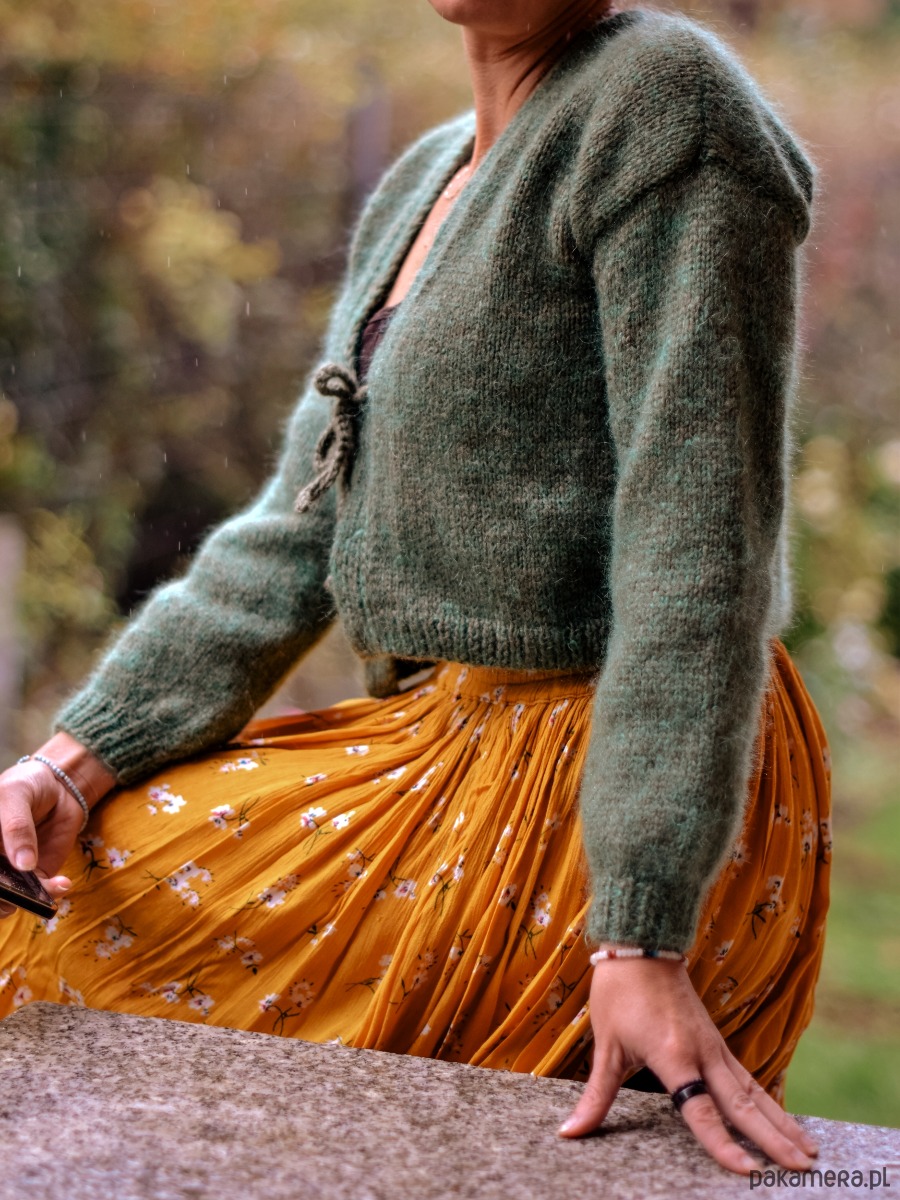 Kardigan do pasa, odsłaniający dekolt, z troczkami do wiązania i długim rękawem. Kolor to oliwkowa zieleń pomieszana z papuzią zielenią.