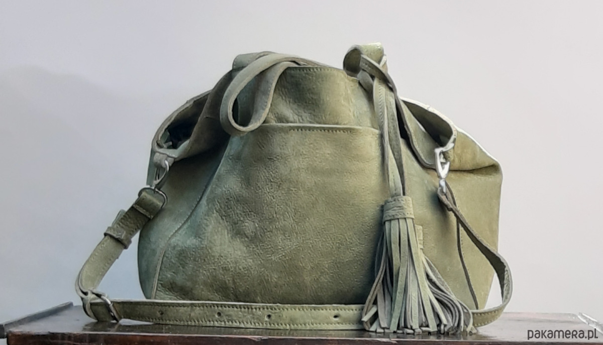 Torba z grubszej skóry, w komplecie frędzle, ładnie układa się podczas noszenia.
