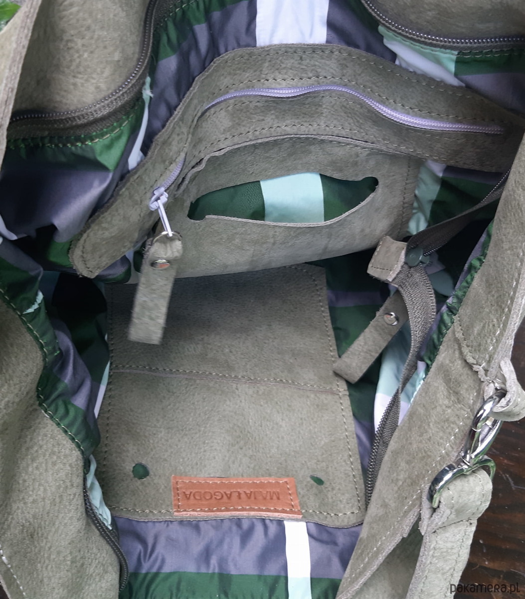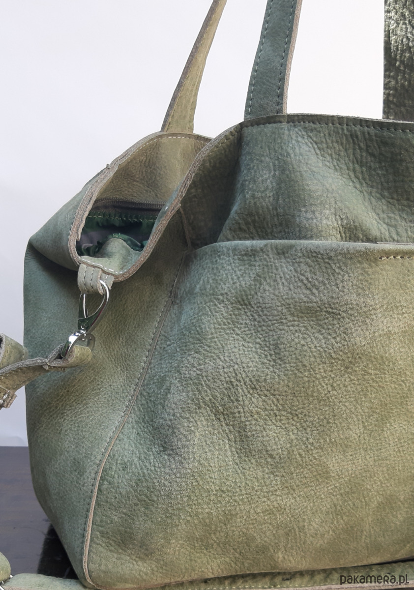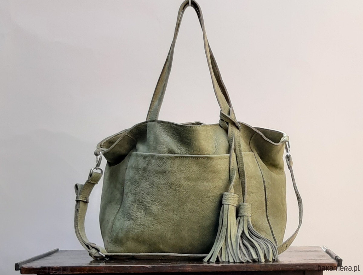 Duża, uszyta ze skóry naturalnej typu nubuk w kolorze zielono -butelkowym.