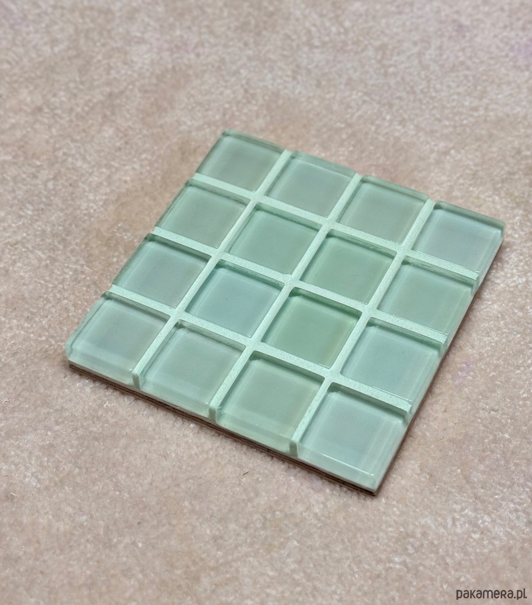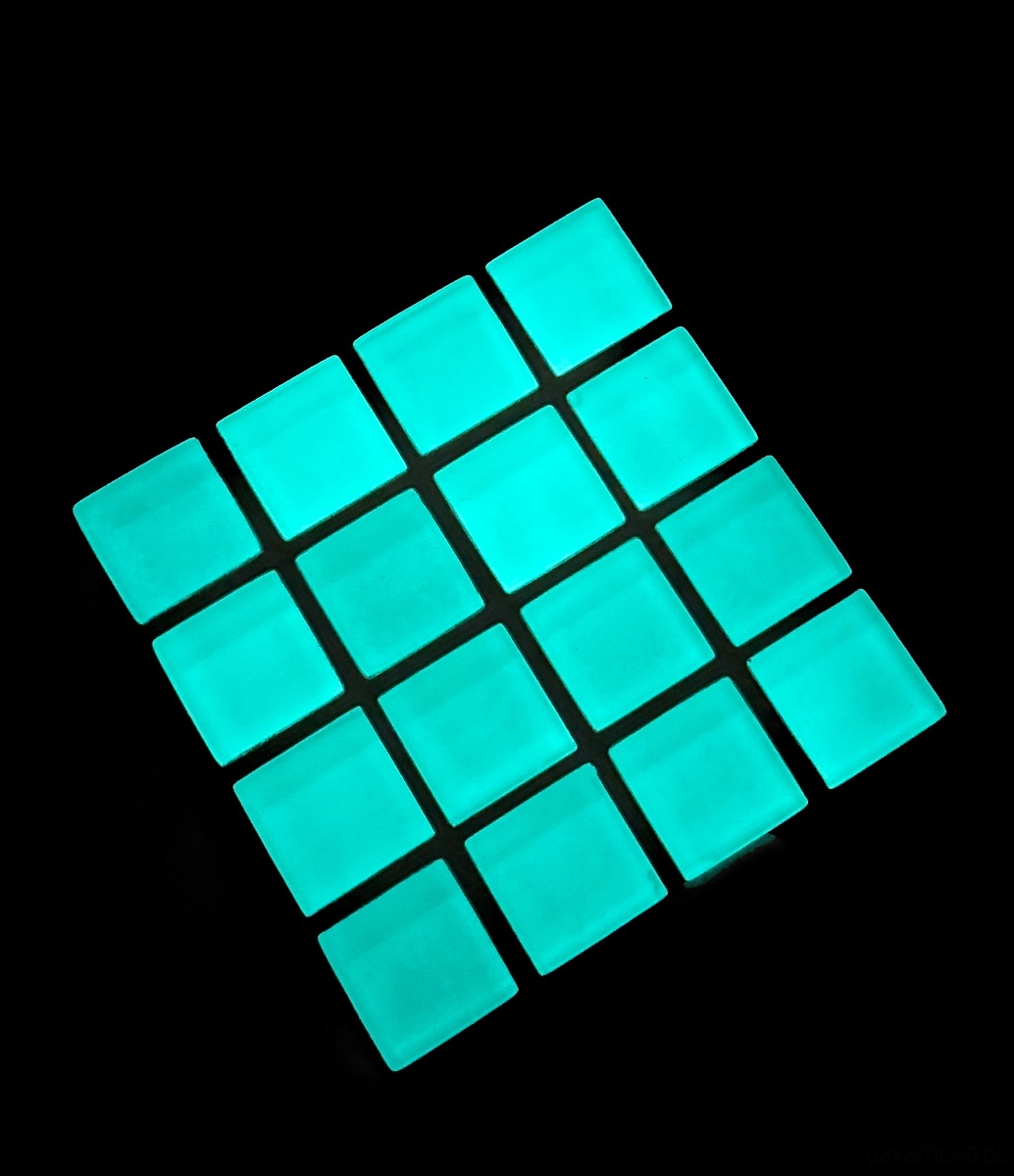 Podkładka 4x4 została wykonana ze szklanej, świecącej w ciemności mozaiki z dodatkiem zielonej, neonowej fugi. Posiada silikonowe nóżki-trzyma się powierzchni. Idealnie sprawdzi się jako podkładka pod kubek, kieliszek lub inne drobne przedmioty.