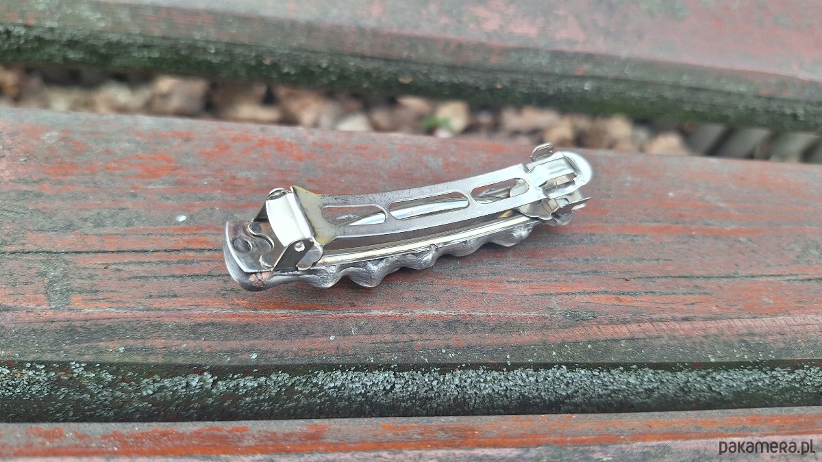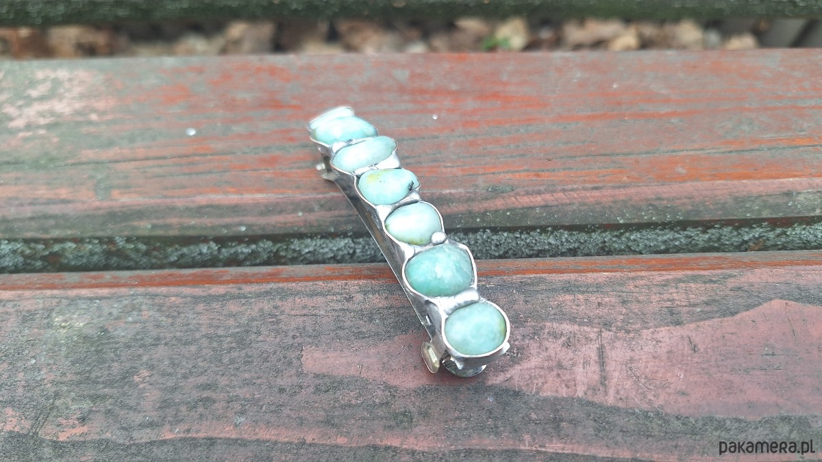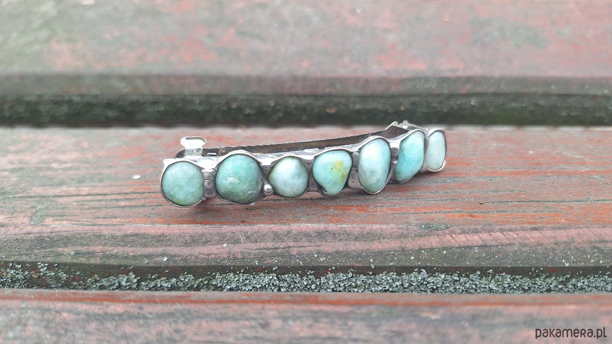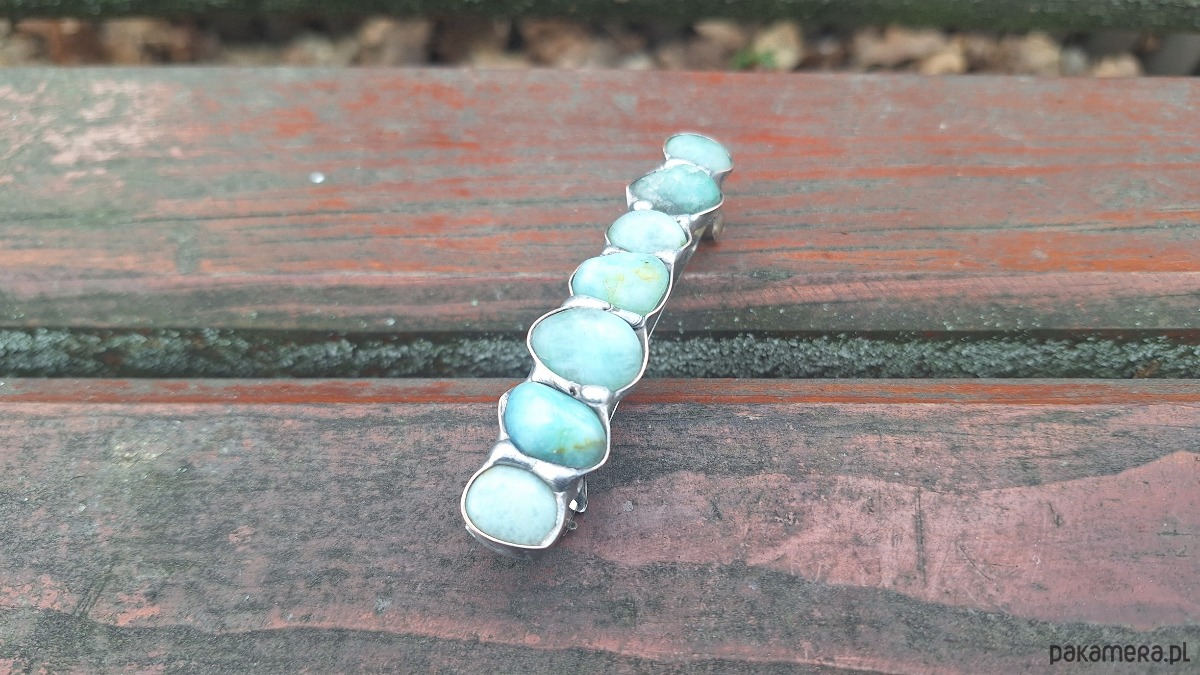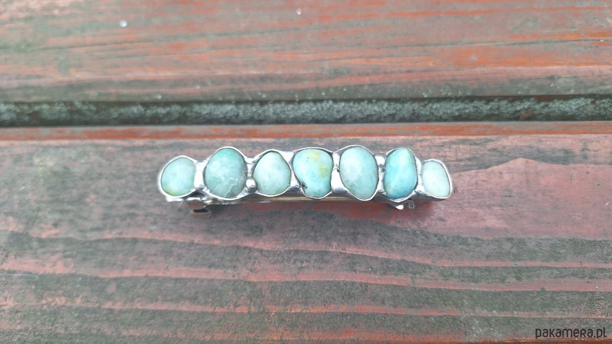 Klamra do włosów, wykonana z miedzi, cyny i chryzoprazów. Wymiary ok. 8 na 1.5 cm. Zapięcie 6 cm, metalowe.