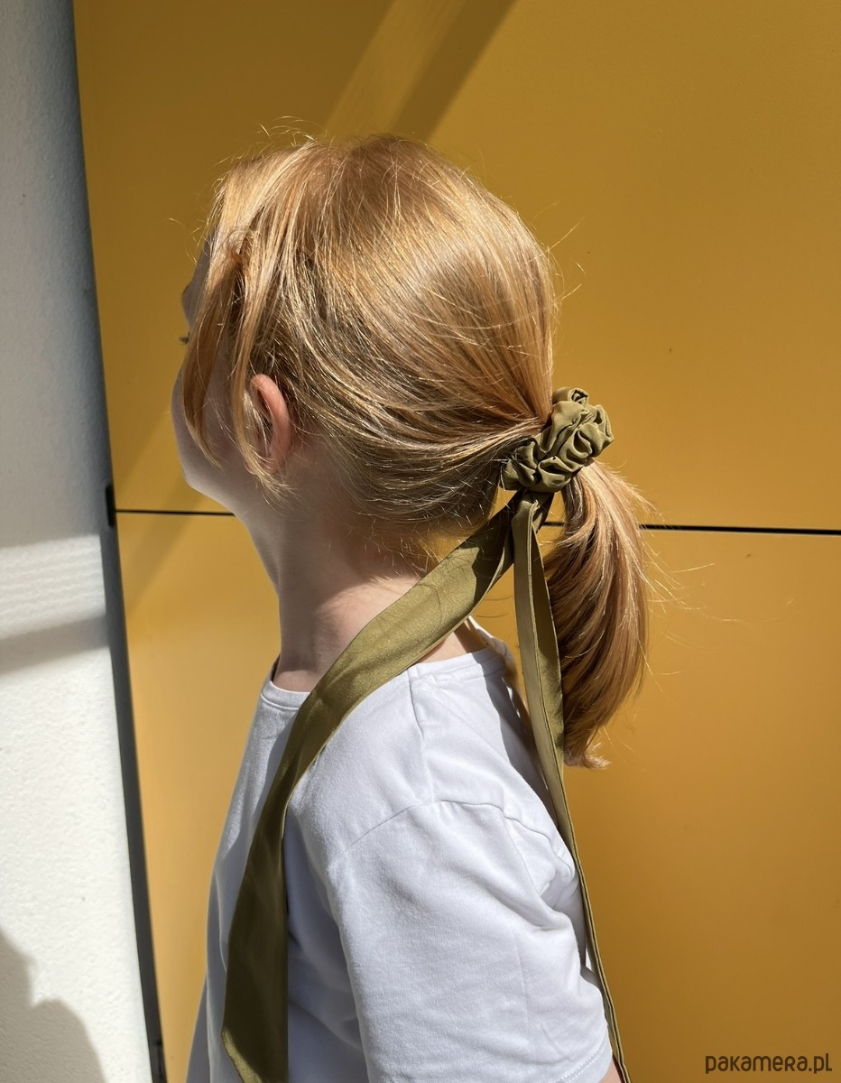 Urocza scrunchie Silva z długą szarfą w kolorze zgniłej zieleni to połączenie delikatności, funkcjonalności i wyjątkowego uroku.