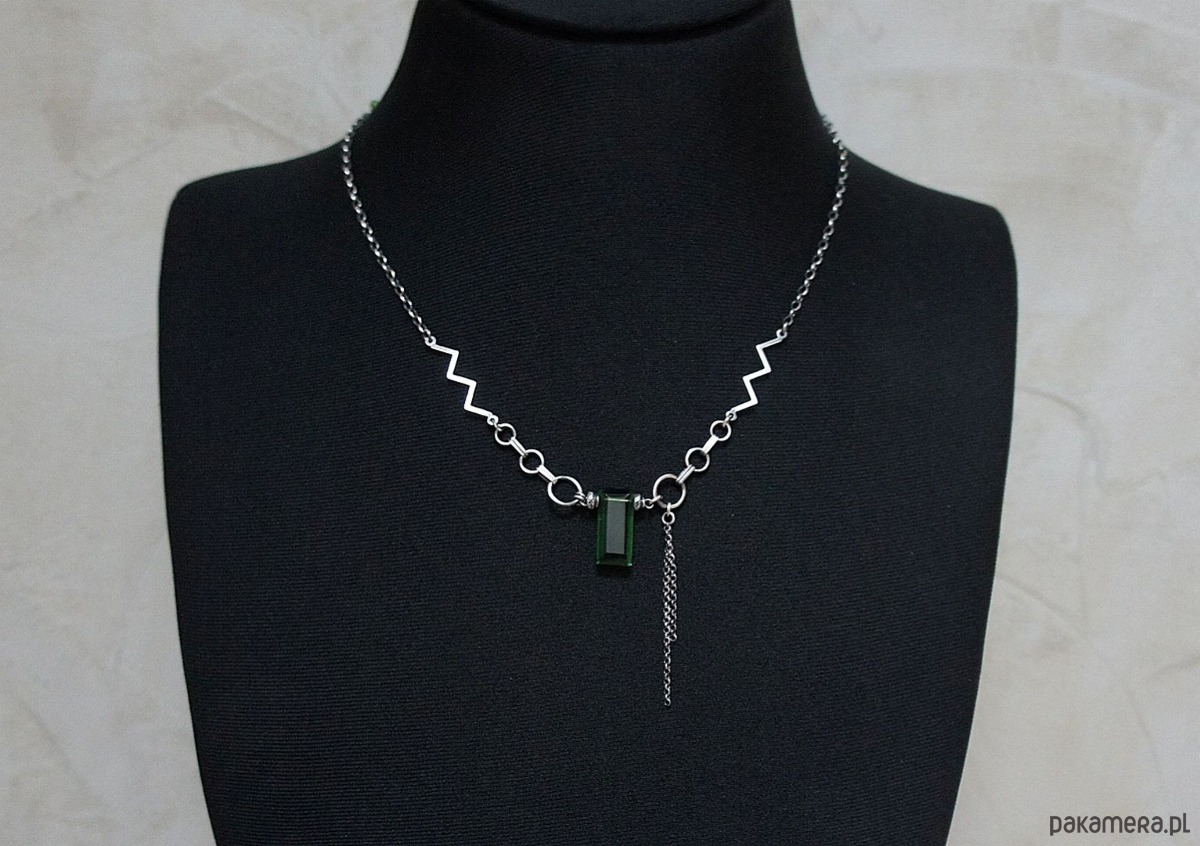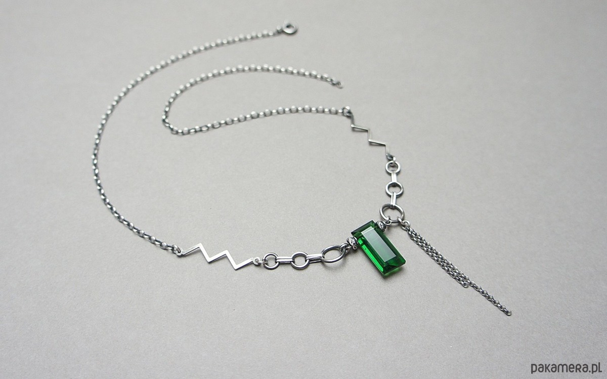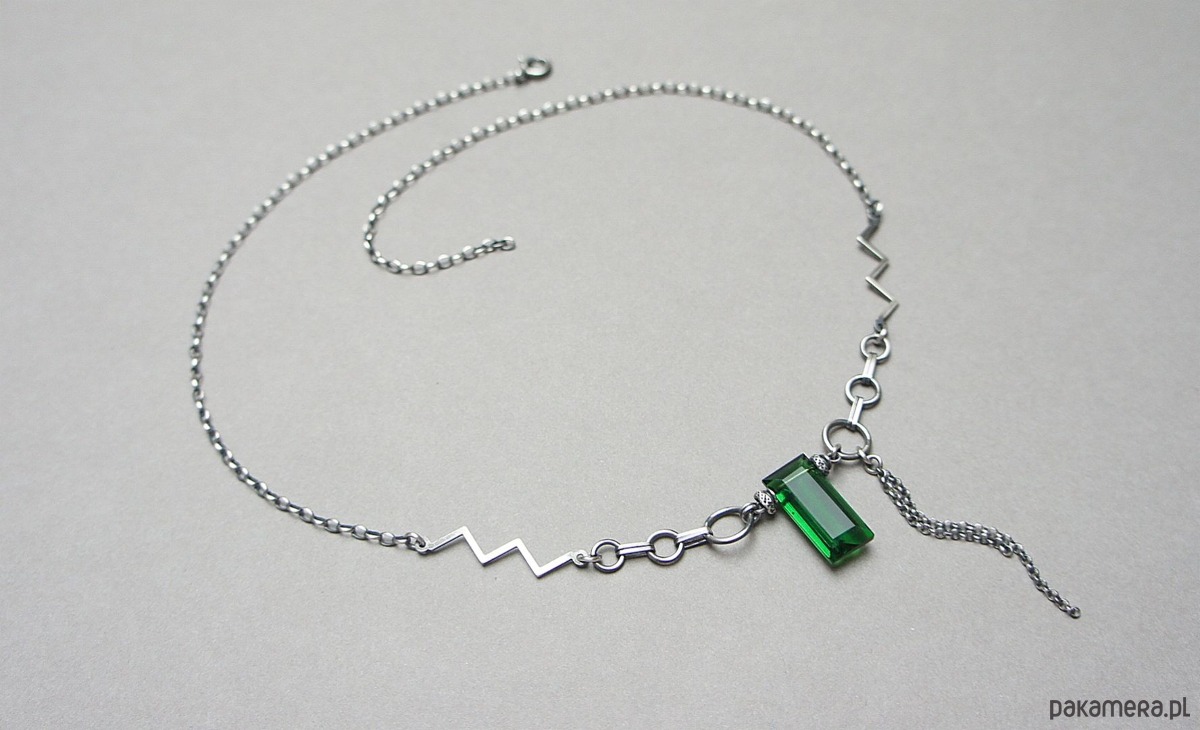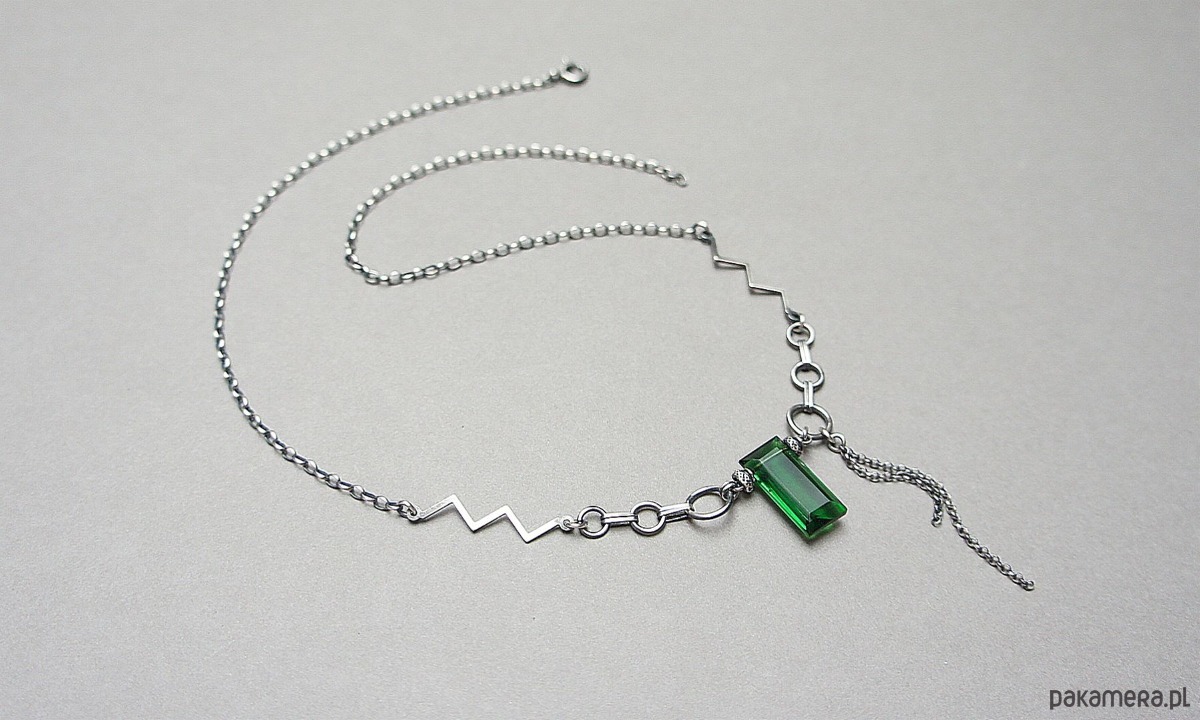 Naszyjnik wykonany ze srebra [pr. 925] w połączeniu ze sztabką z kwarcu [wymiary sztabki 18mm x 8mm]. Całość zaoksydowana i przetarta. Długość naszyjnika około 45,5cm. Biżuteria ozdobnie zapakowana w pudełeczko z logo firmy.