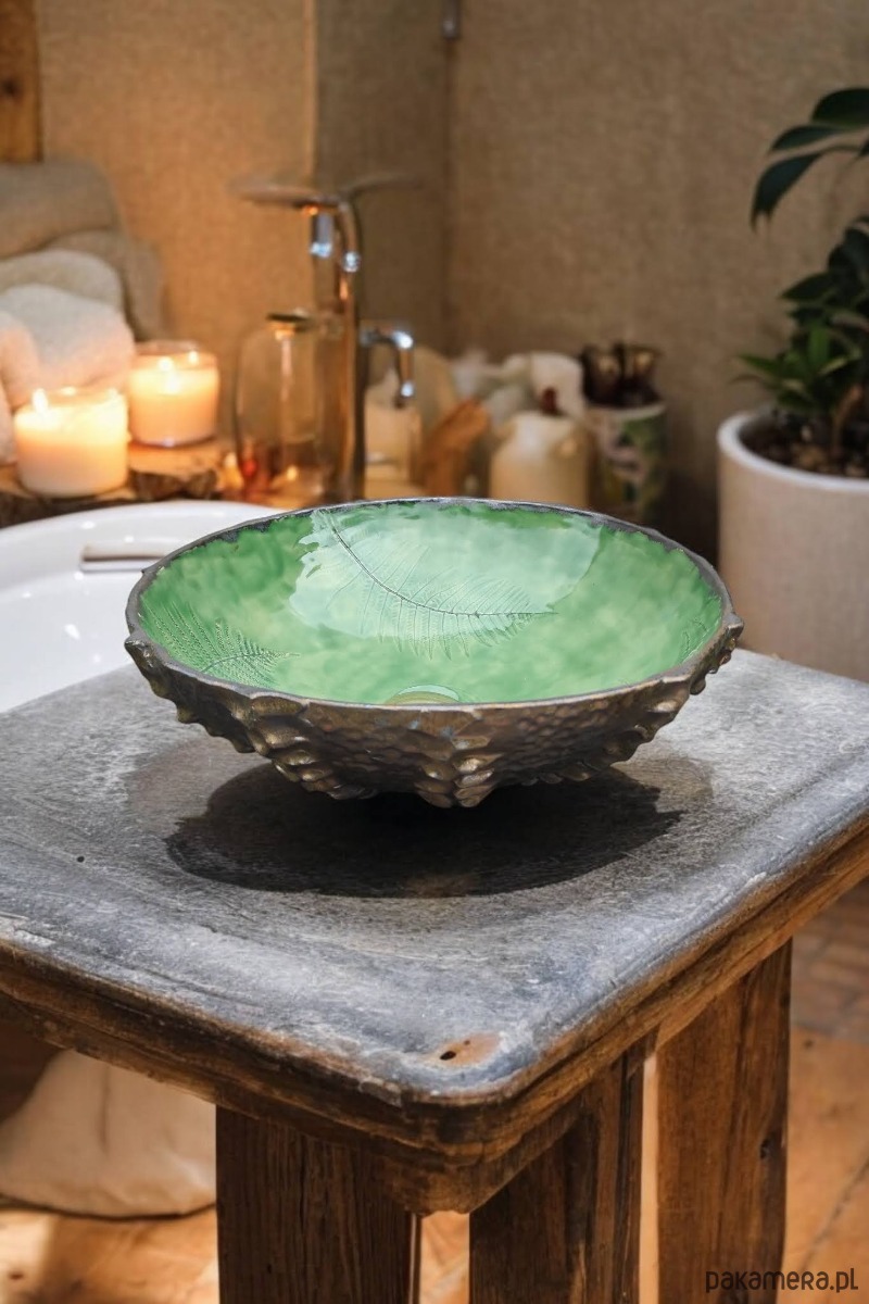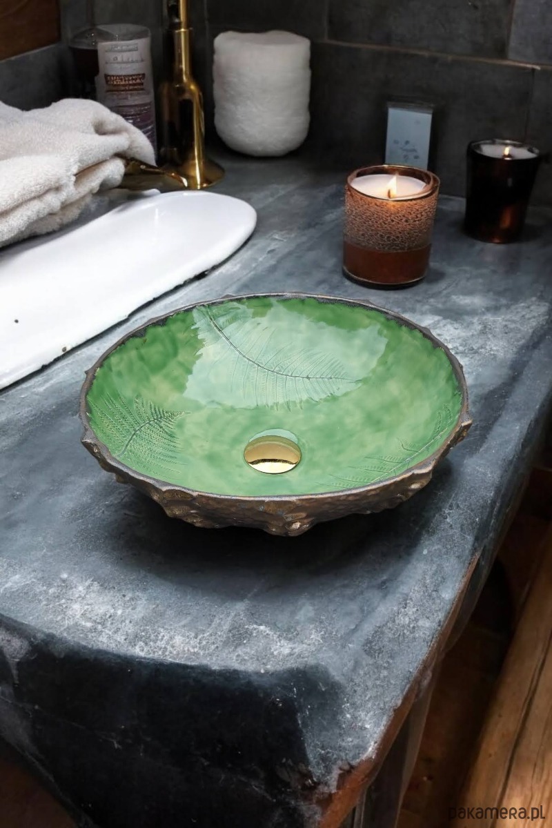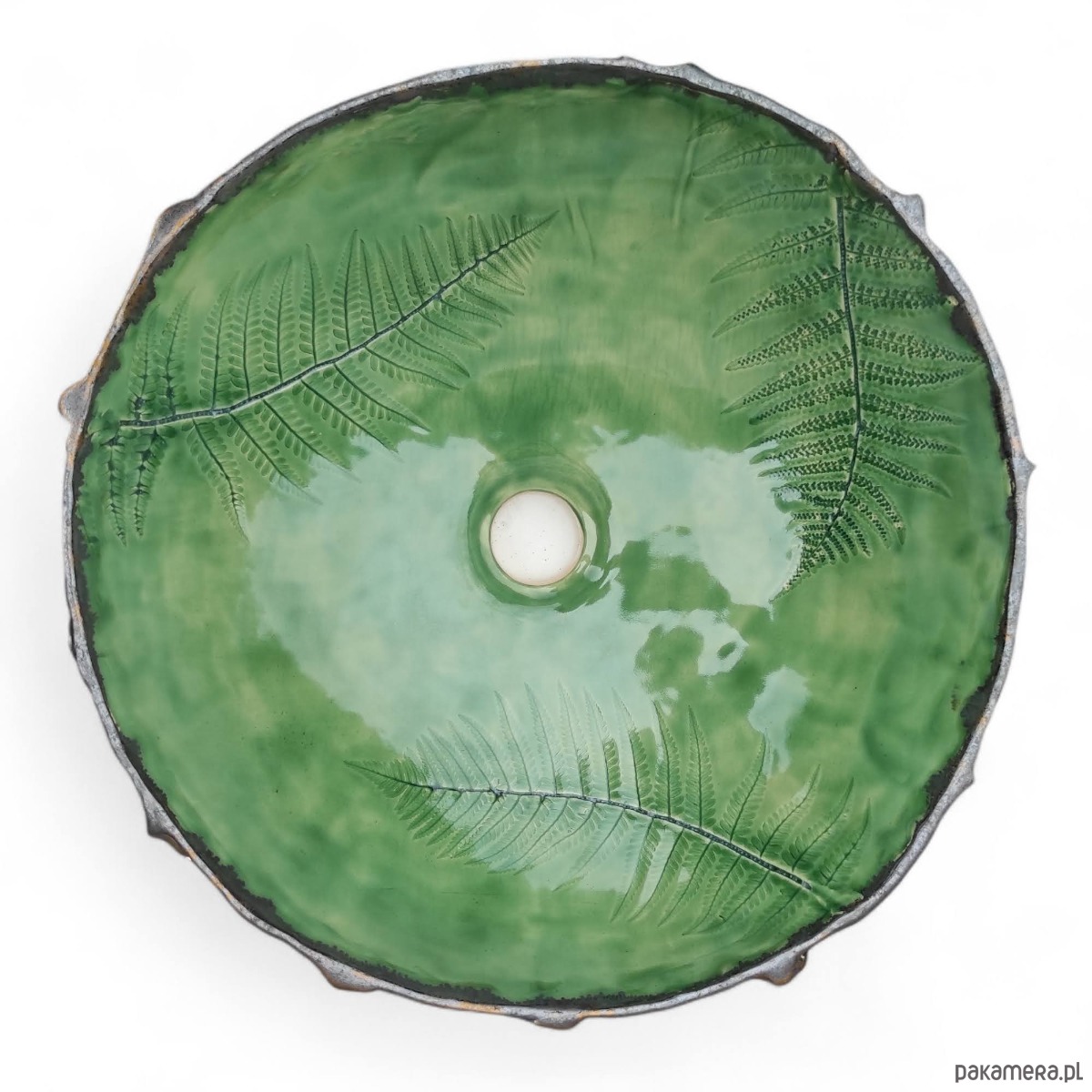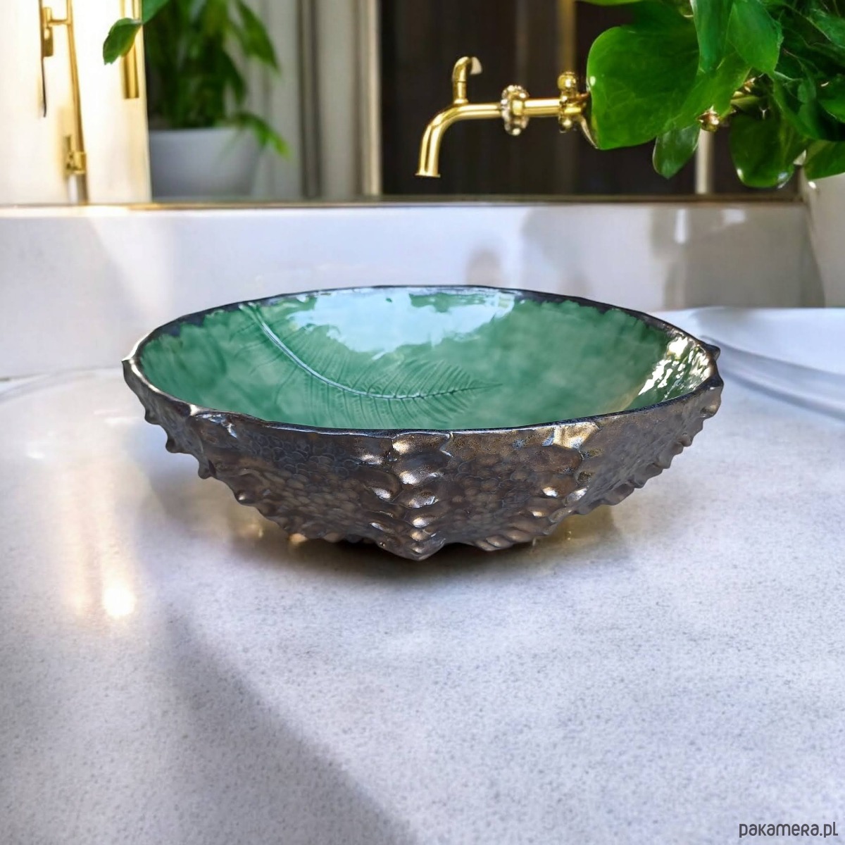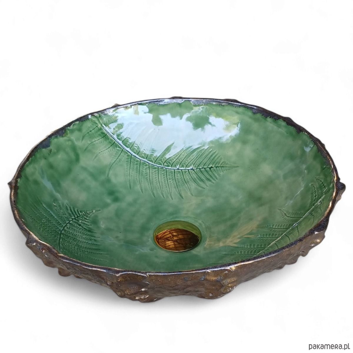 Zielona umywalka nablatowa z odciśniętymi na wewnętrznej stronie liśćmi paproci. Na zewnątrz ręcznie formowany wzór w kolorze starego złota.