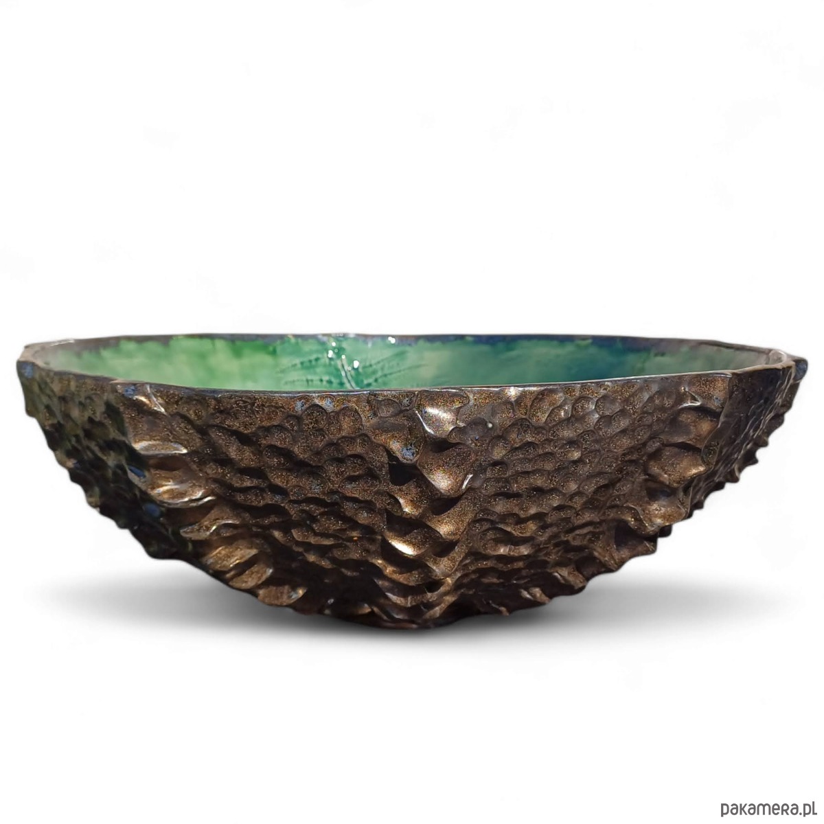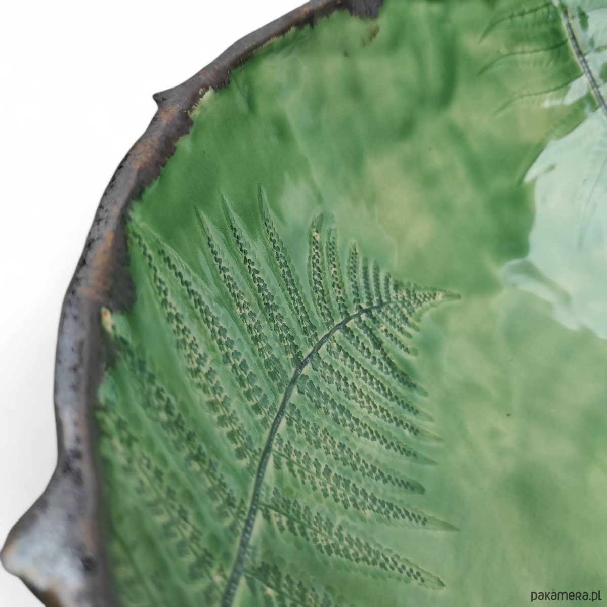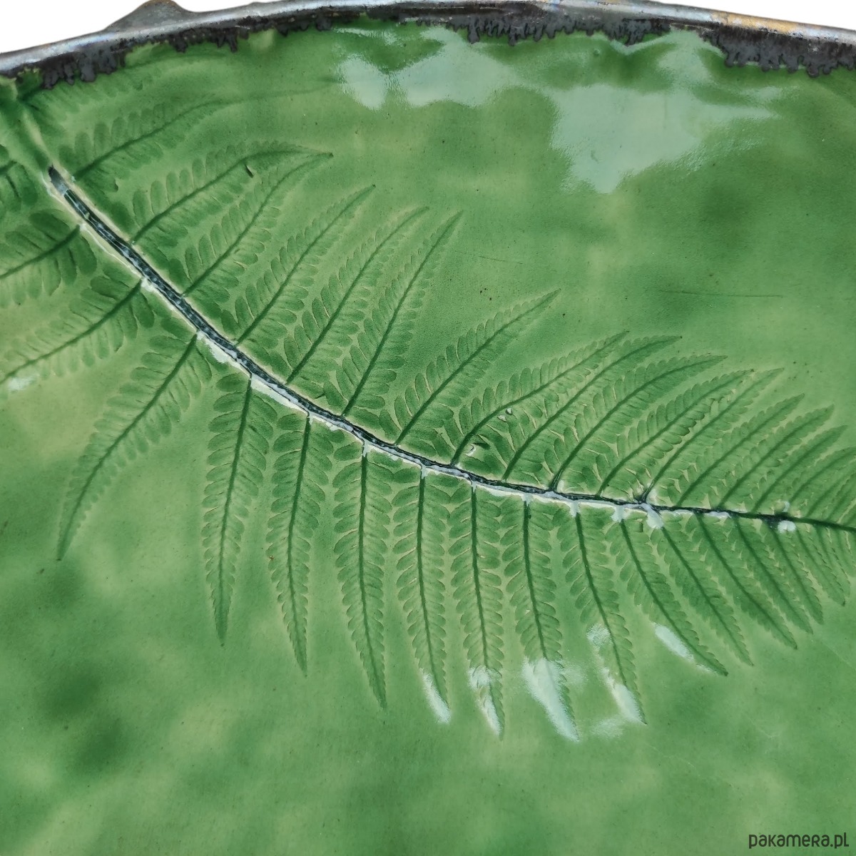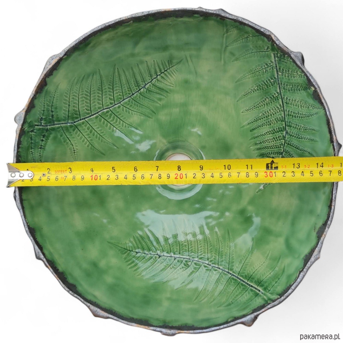 Zielona umywalka nablatowa z odciśniętymi na wewnętrznej stronie liśćmi paproci. Na zewnątrz ręcznie formowany wzór w kolorze starego złota.