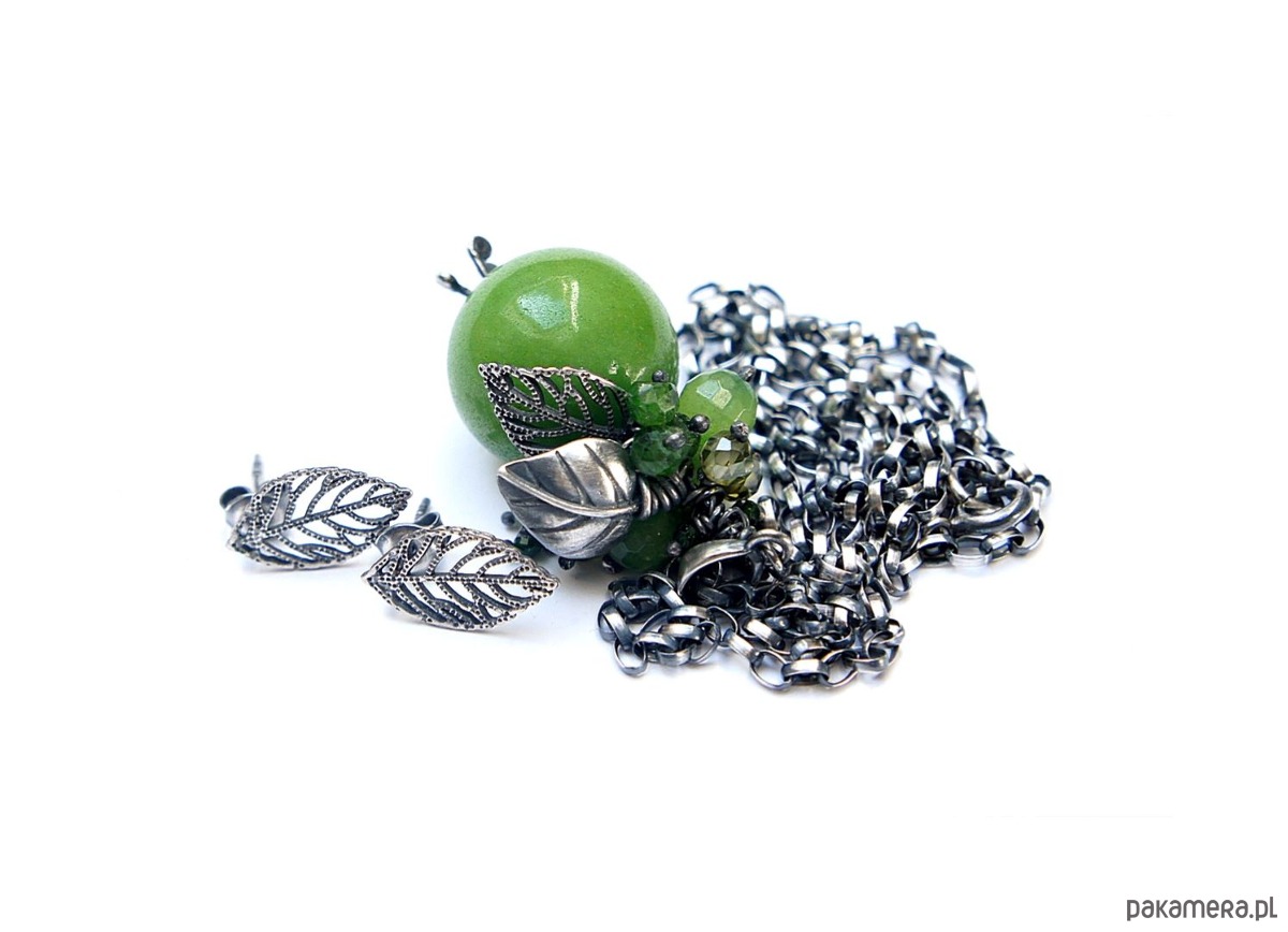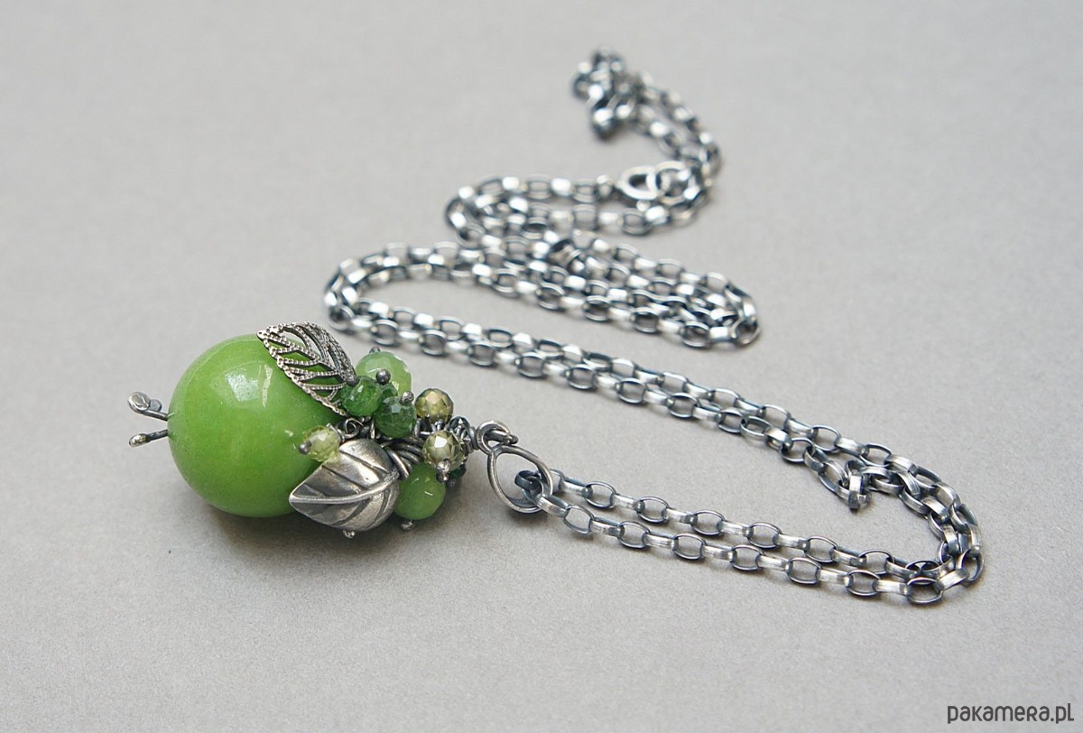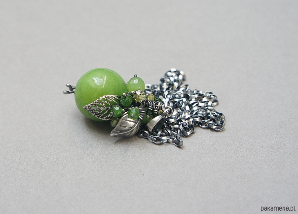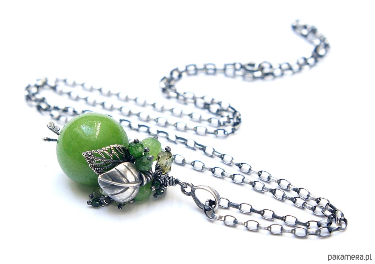 Naszyjnik wykonany ze srebra [pr. 925] w połączeniu z kuleczką jadeitu [18mm], fasetowanymi jadeitami [6mm], perydotami [3mm], cyrkoniami [4mm], diopsydami [4mm], szmaragdami nilu [2mm] oraz srebrnymi listkami. Srebro oksydowane i przetarte. Całkowita długość naszyjnika 62cm. Biżuteria ozdobnie zapakowana.