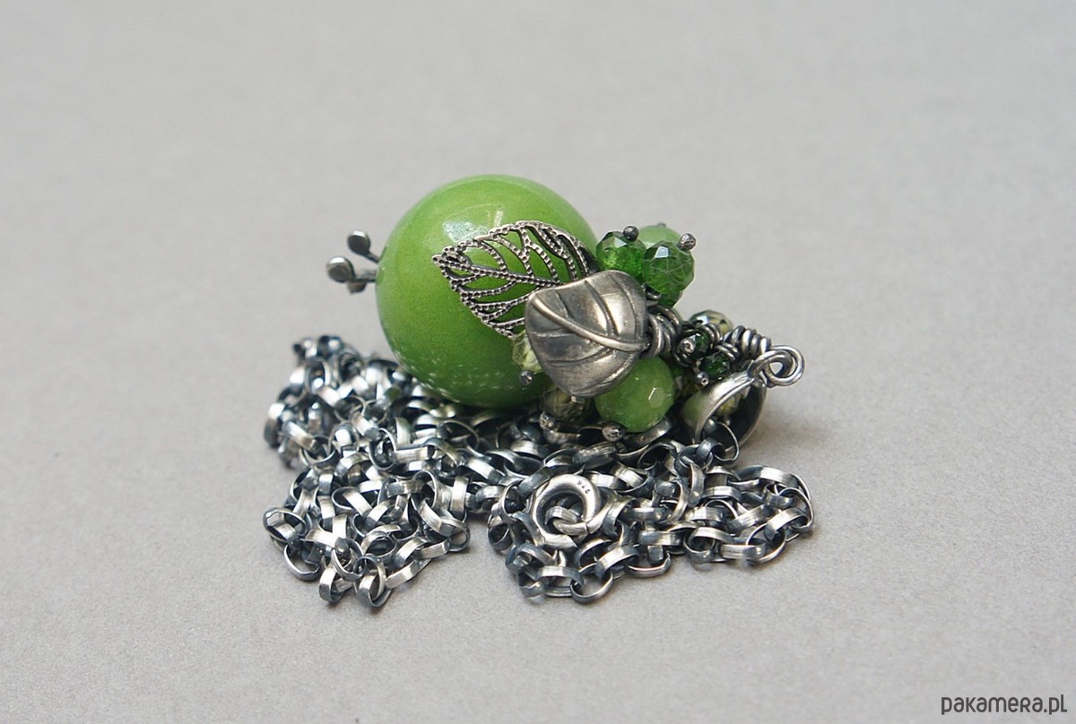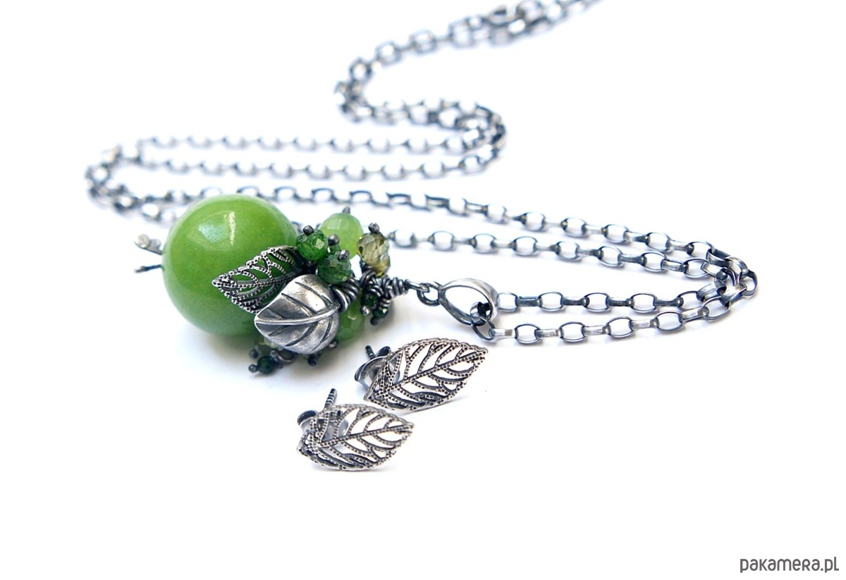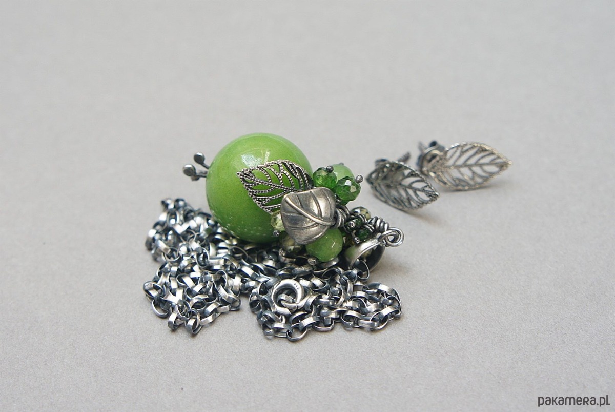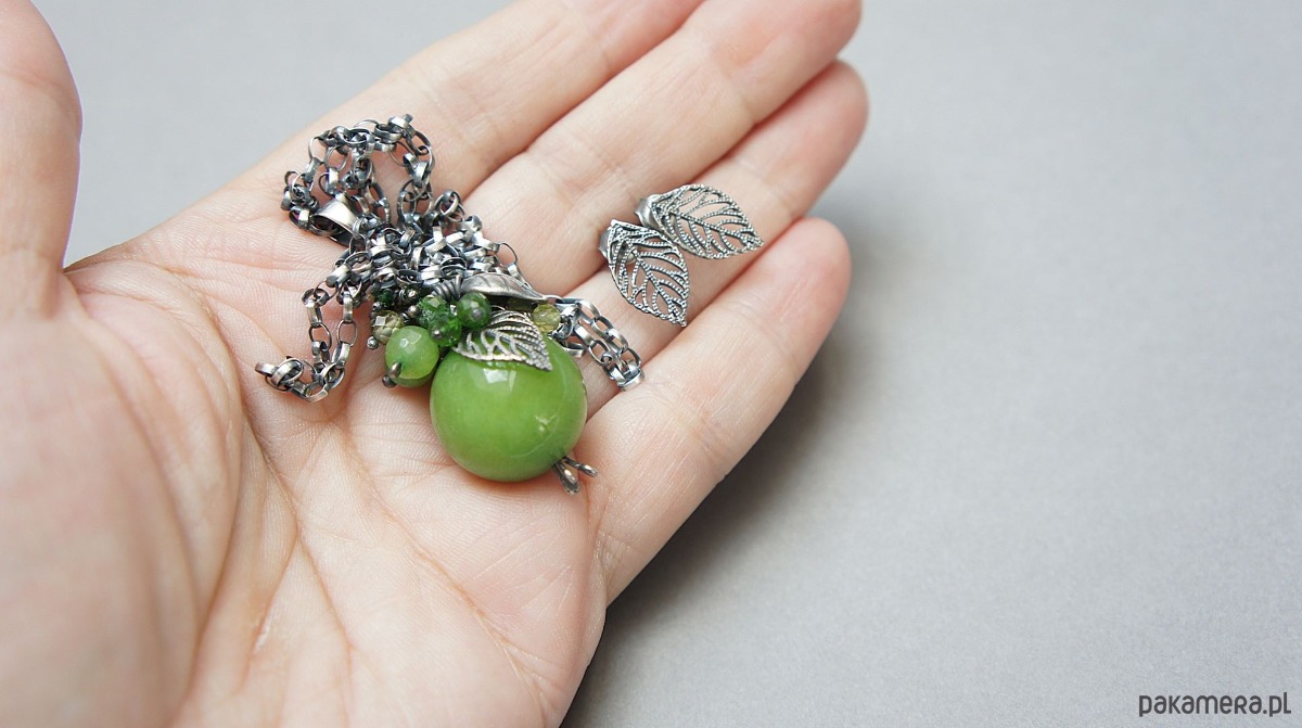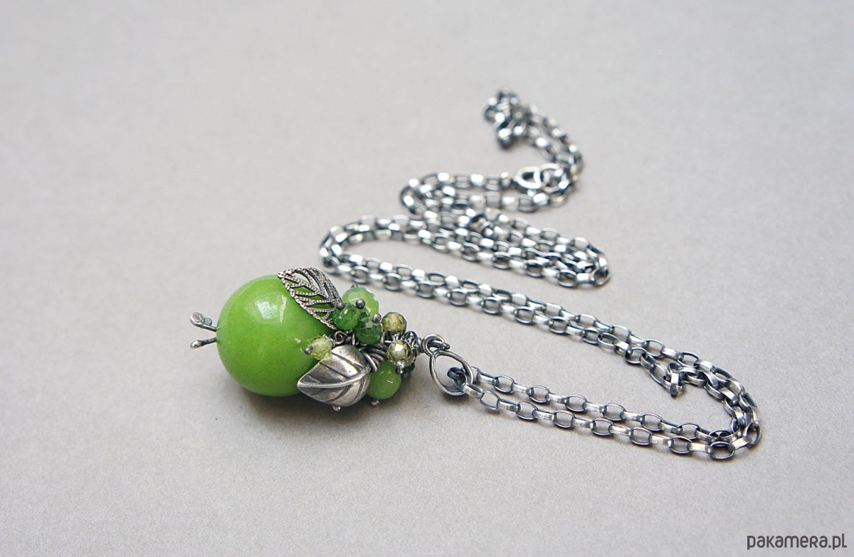 Naszyjnik wykonany ze srebra [pr. 925] w połączeniu z kuleczką jadeitu [18mm], fasetowanymi jadeitami [6mm], perydotami [3mm], cyrkoniami [4mm], diopsydami [4mm], szmaragdami nilu [2mm] oraz srebrnymi listkami. Srebro oksydowane i przetarte. Całkowita długość naszyjnika 62cm. Biżuteria ozdobnie zapakowana.