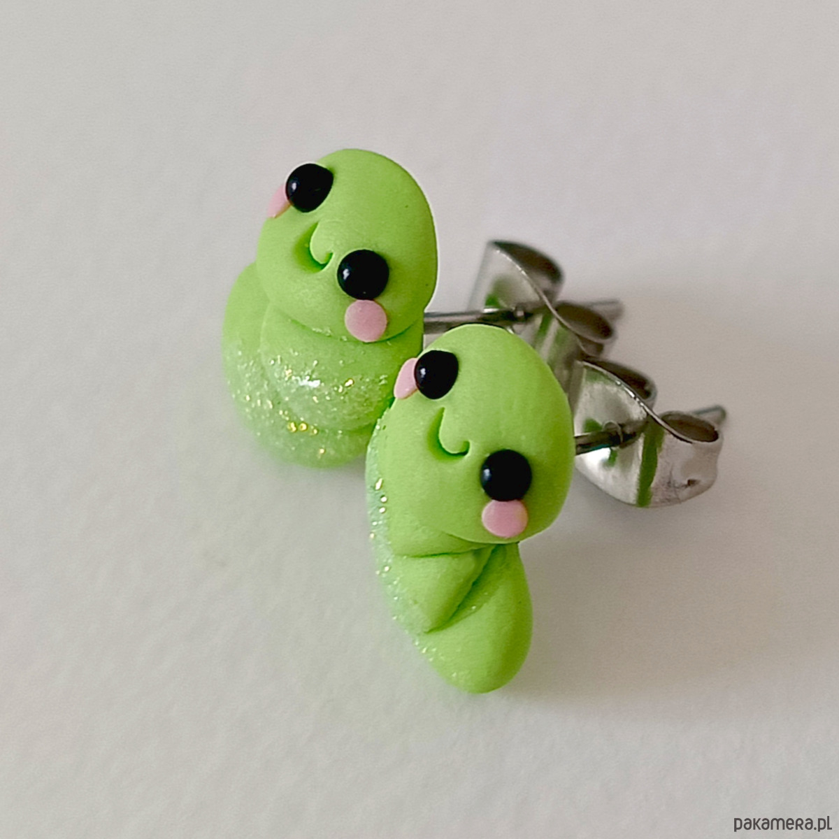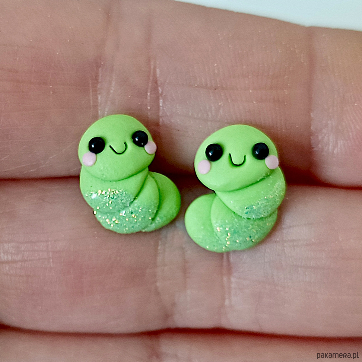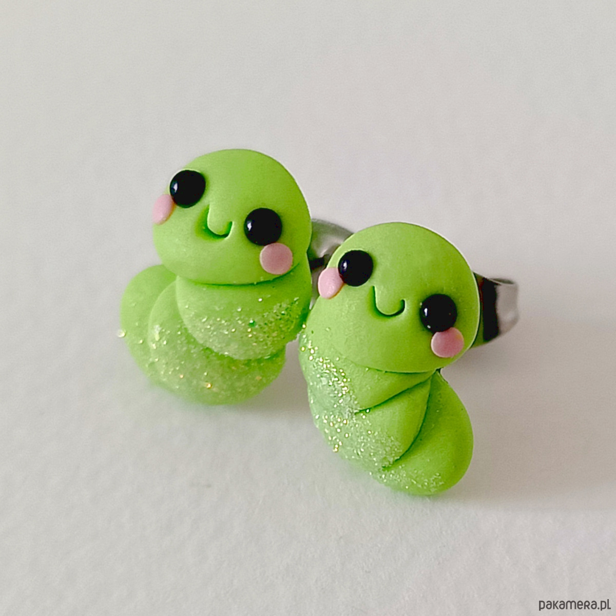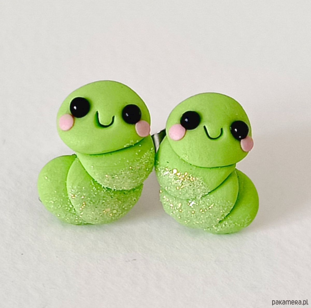Urocze kolczyki w kształcie zielonych gąsieniczek, wykonane ręcznie z masy polimerowej. Idealne na wiosnę – dla dziewczynek, miłośniczek natury i fanek nietuzinkowej biżuterii. Mają 14 mm i osadzone są na sztyftach ze stali nierdzewnej, co gwarantuje wygodę i trwałość. Doskonały pomysł na prezent na Wielkanoc lub Dzień Matki.