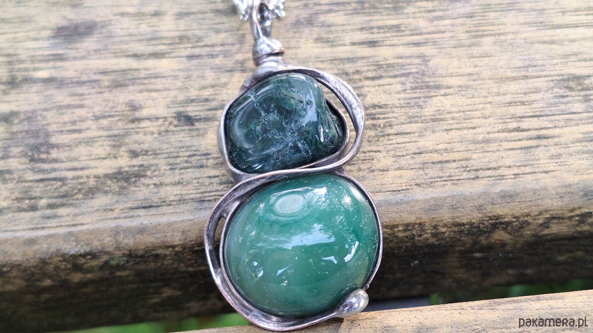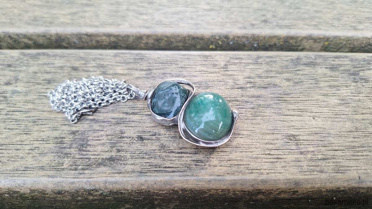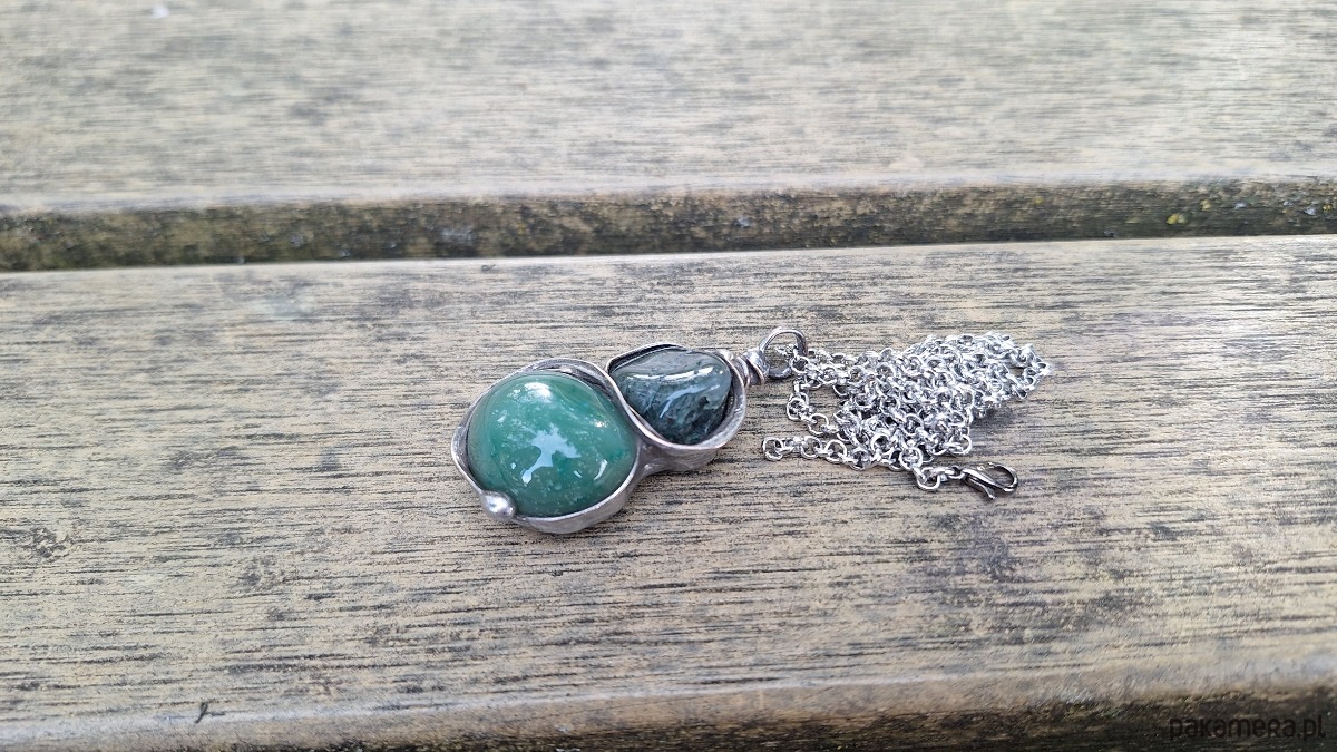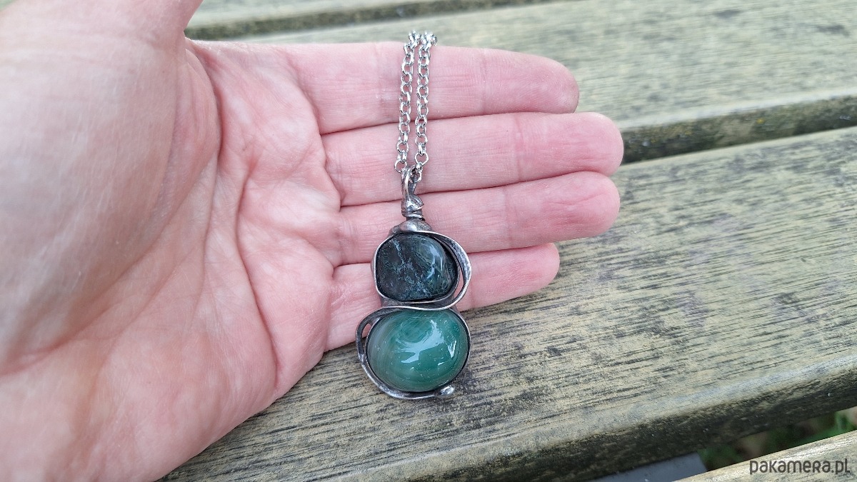Wisiorek wykonany z miedzi, cyny i agatów. Wymiary ok. 4.5 na 2 cm. Zawieszony na łańcuszku o długości ok. 50 cm.