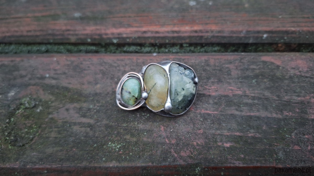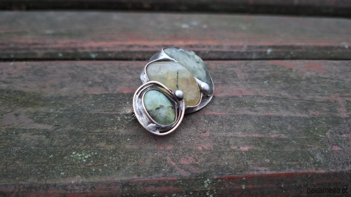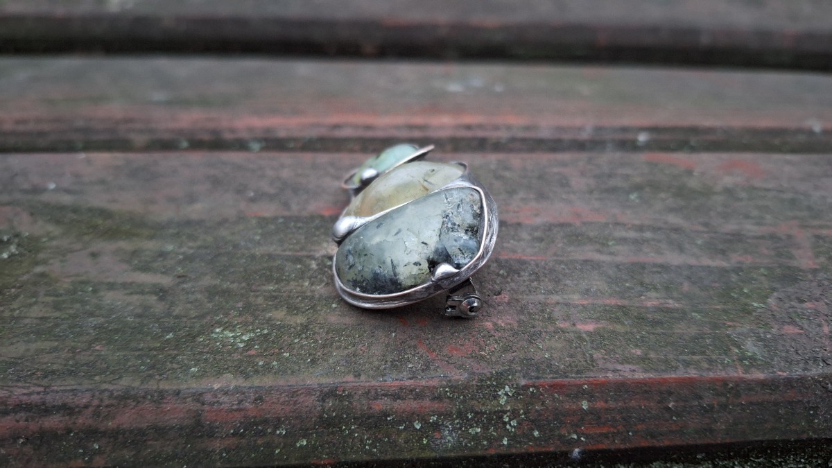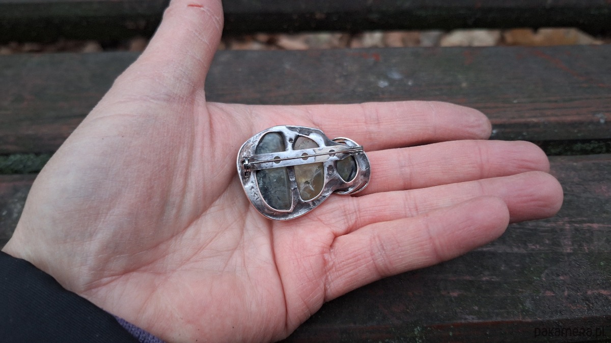 Broszka wykonana z miedzi, cyny, prenitów i chryzoprazu. Wymiary ok. 4.5 na 3 cm. Zapięcie metalowe.