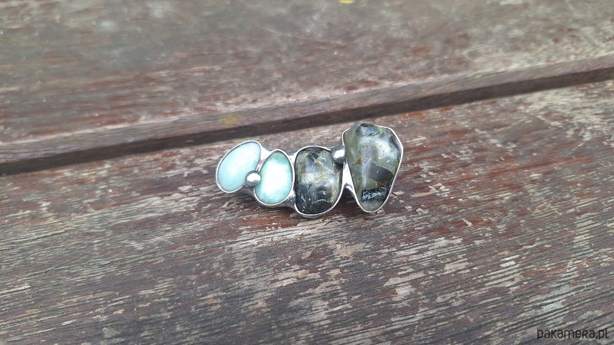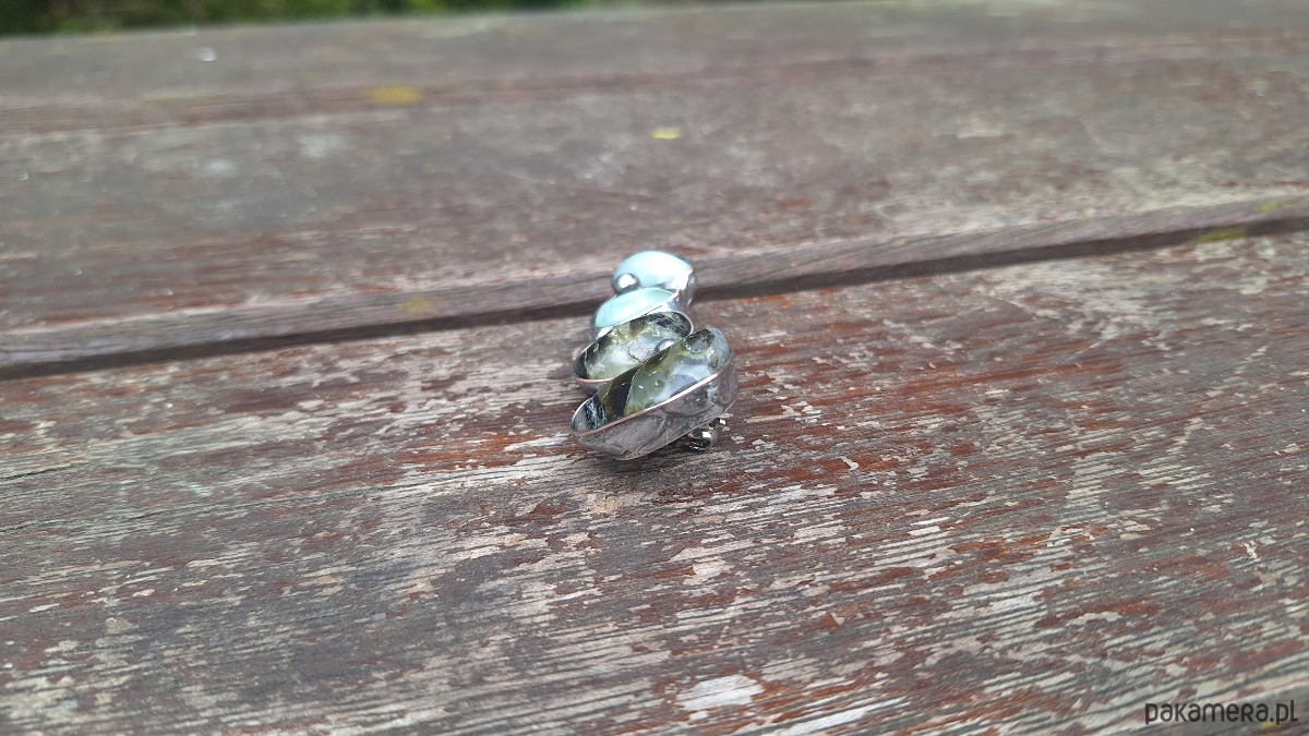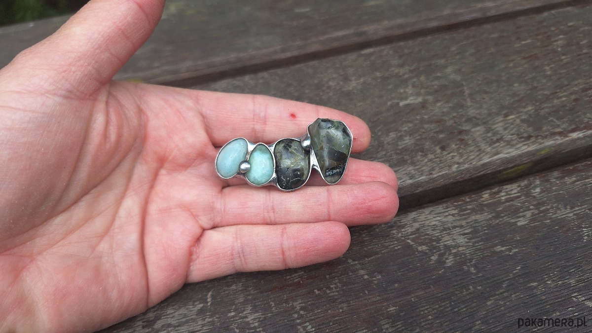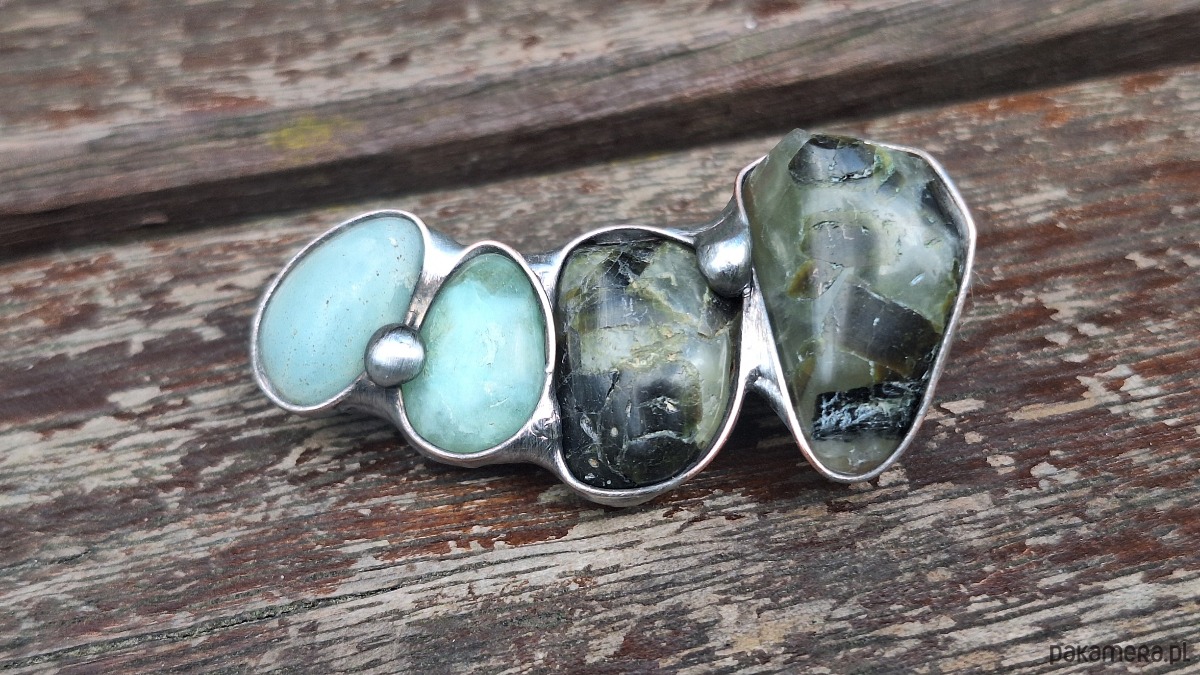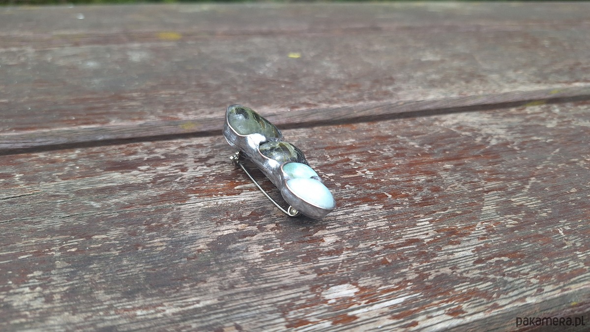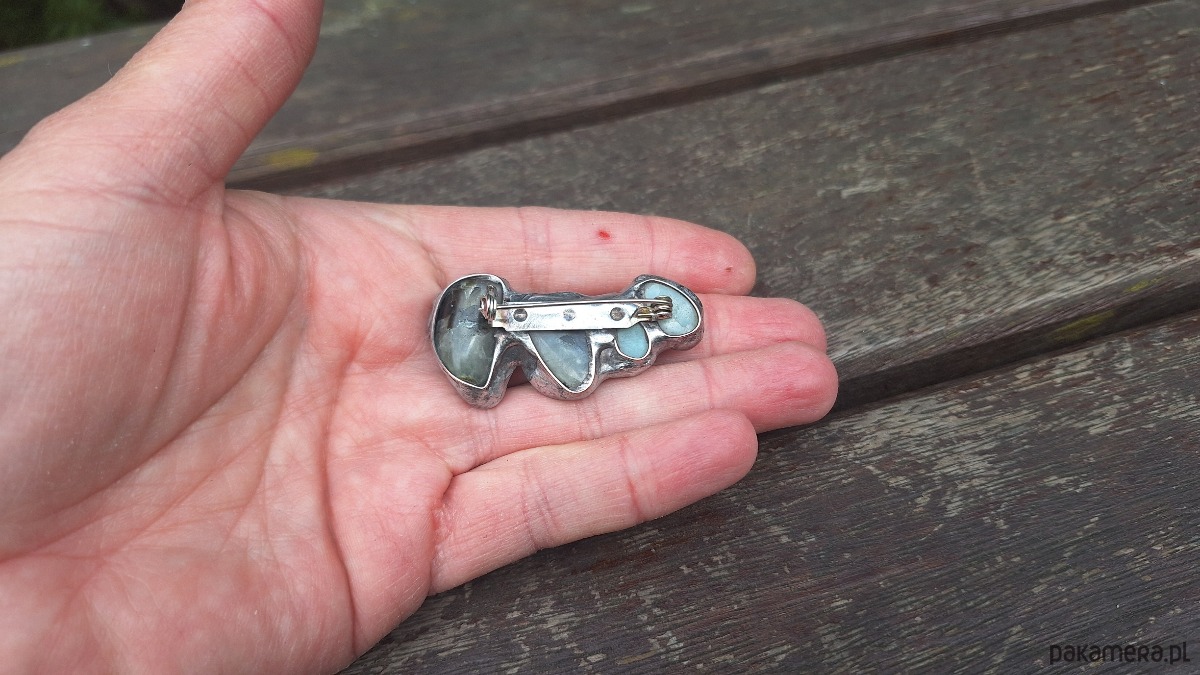 Broszka wykonana z miedzi, cyny, prenitów i chryzoprazu. Wymiary ok. 5 na 2 cm. Zapięcie metalowe.