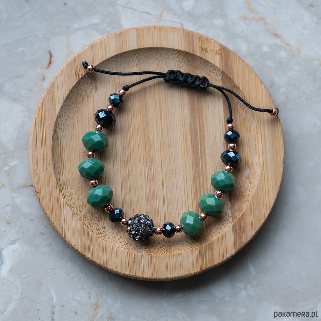 Design: Regulowany rozmiar pozwala na idealne dopasowanie, a zastosowanie koralików szklanych w połączeniu z pozłacanymi akcentami nadaje bransoletce nowoczesny, ale i ponadczasowy charakter.