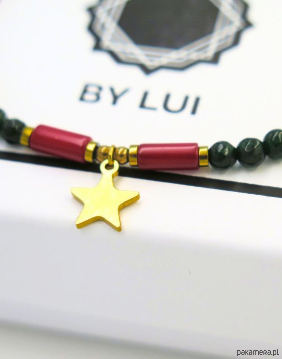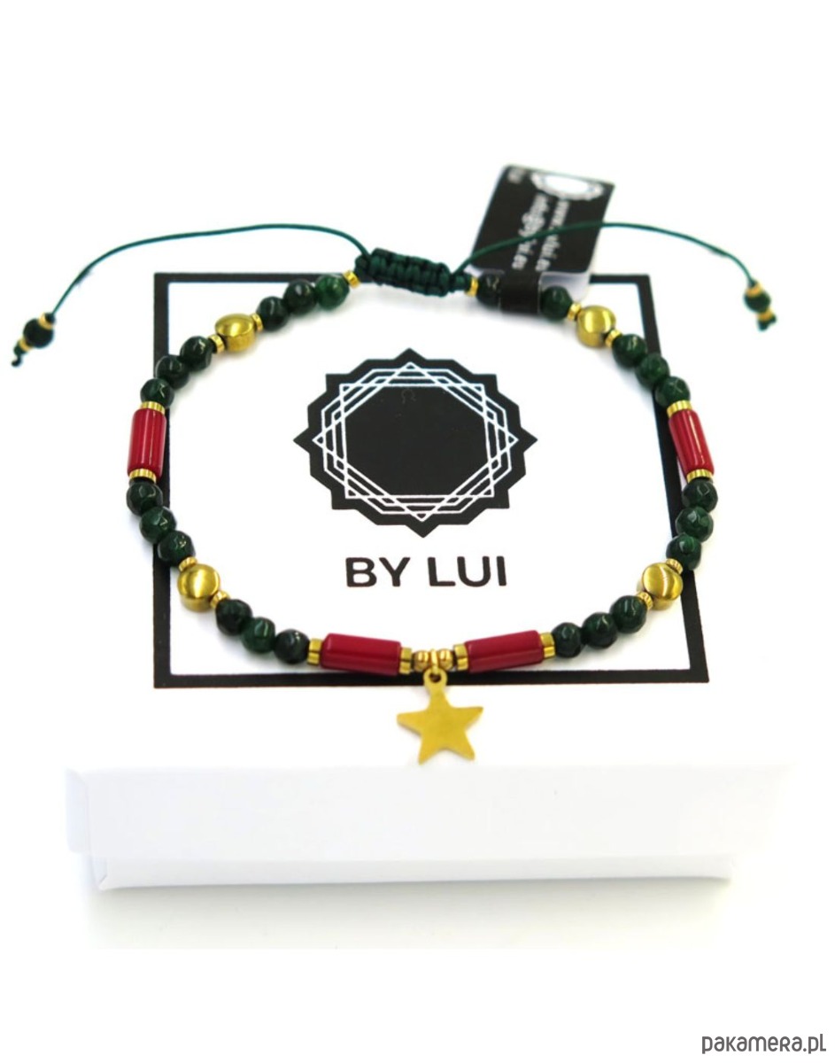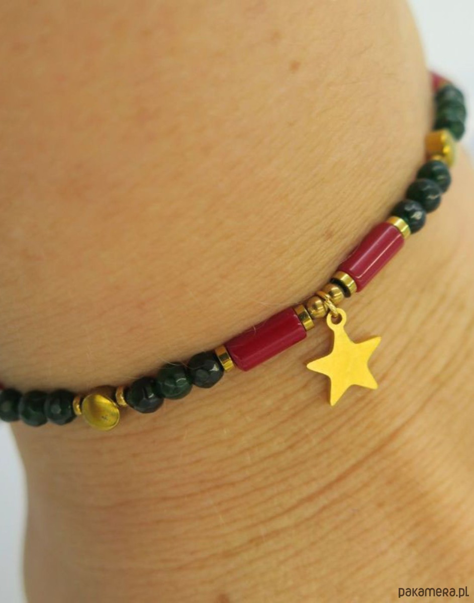 Bransoletka NY Christmas Star Bracelet to handmade biżuteria w świątecznych kolorach czerwonego koralu, zielonego agatu i złotego hematytu, inspirowana magicznym klimatem Nowego Jorku. Złota gwiazdka i naturalne kamienie tworzą elegancki dodatek idealny na święta, Mikołajki i sezon zimowy. Regulowana bransoletka to doskonały prezent dla osób kochających świąteczny styl, pozytywną energię kamieni i wyjątkową biżuterię w klimacie Christmas vibe.Zestawienie zielonego, czerwonego i złotego nawiązuje do dekoracji z 5th Avenue, światełek wokół Rockefeller Center i zimowego czaru Bryant Park.