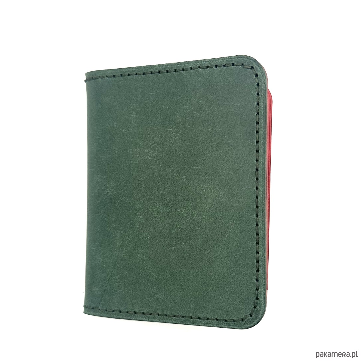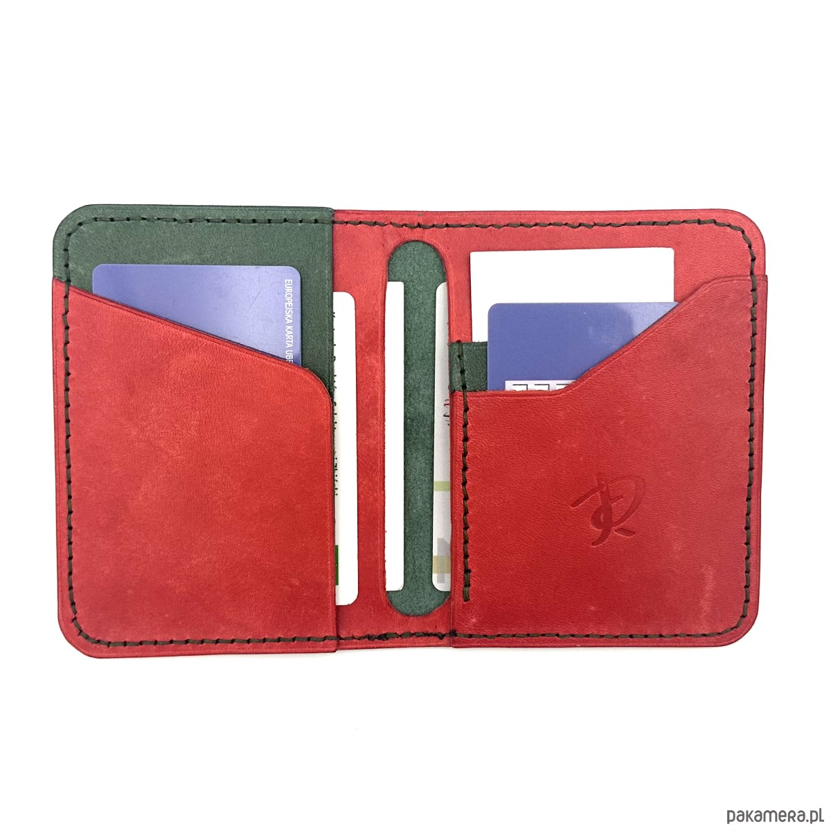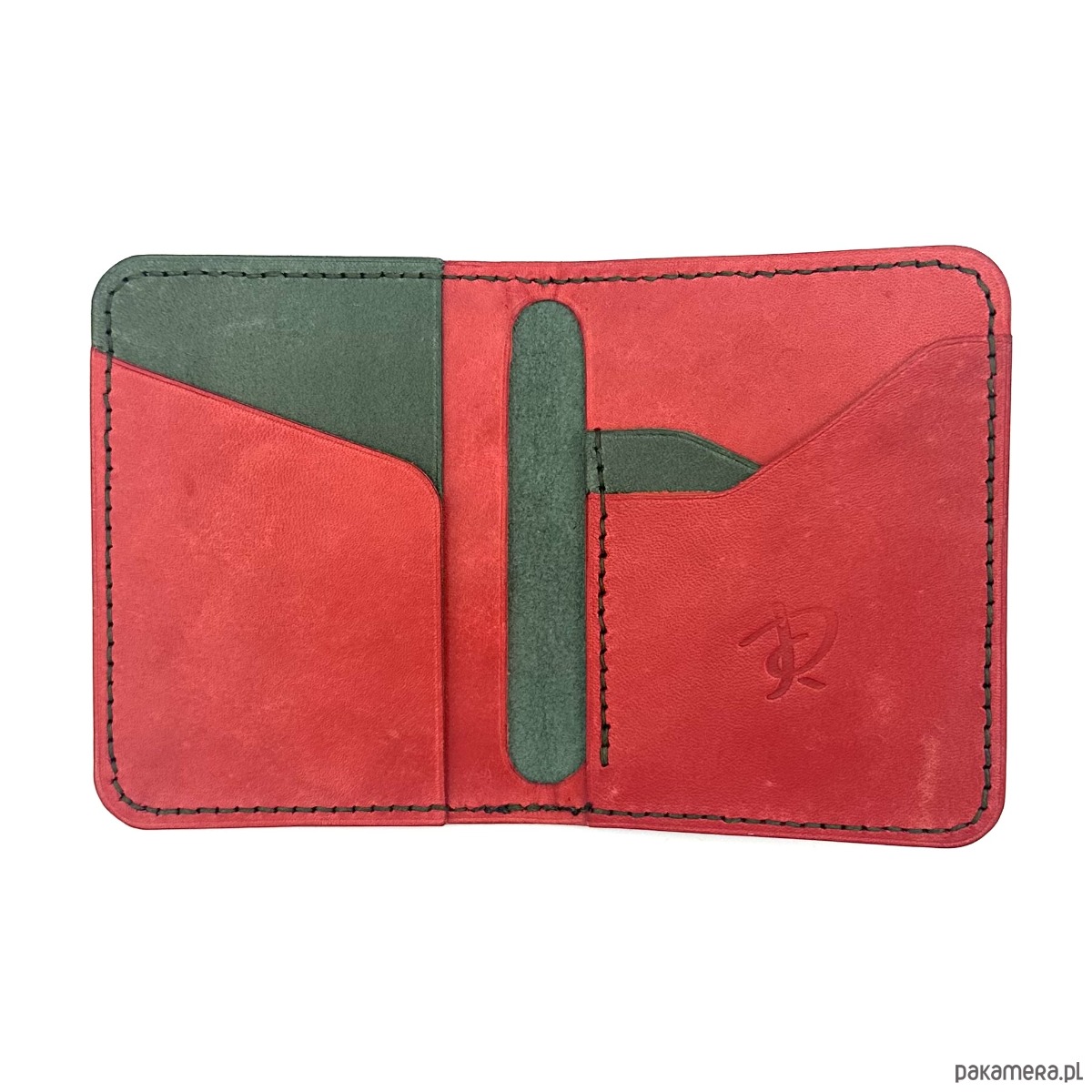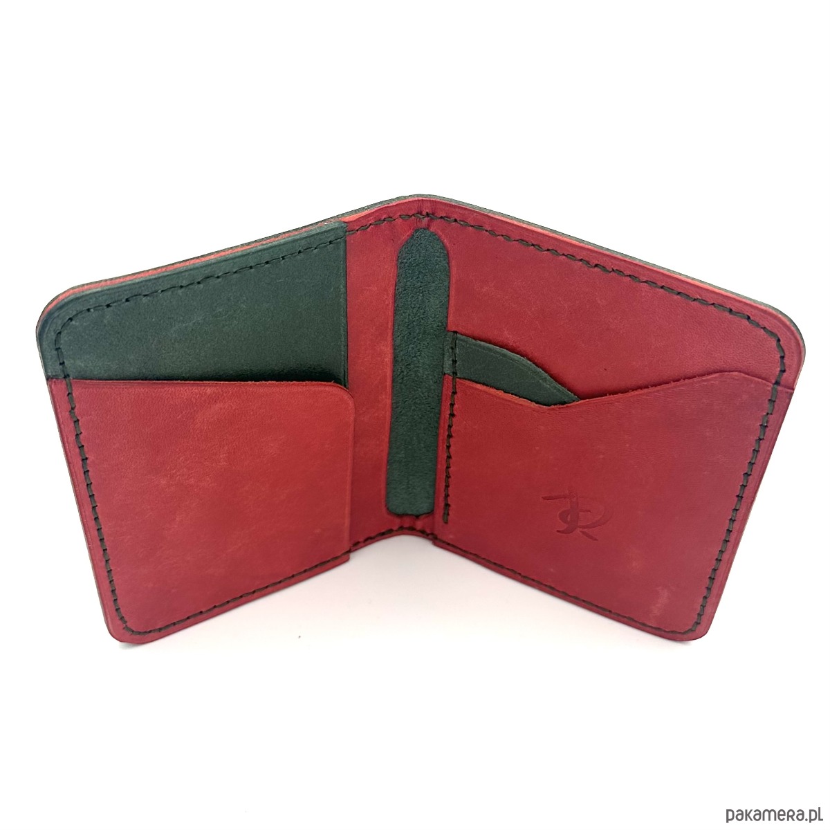 Zielono-czerwony portfel ręcznie uszyty ze skóry garbowanej roślinnie.