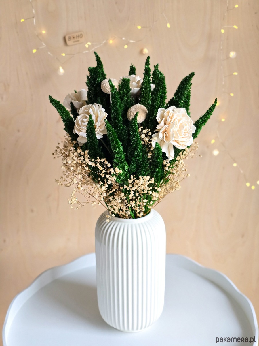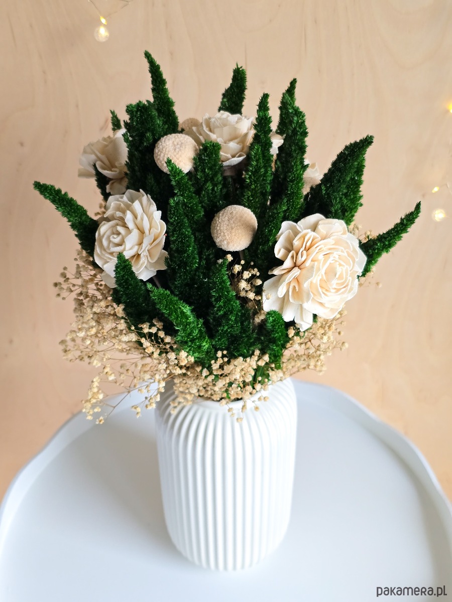 Bukiet wykonany jest ze stabilizowanych kwiatów i roślin, dlatego bukiet będzie się pięknie prezentował przez długi czas. To propozycja dla osób, które chcą mieć piękną dekorację bez obaw, że kwiaty zwiędną.