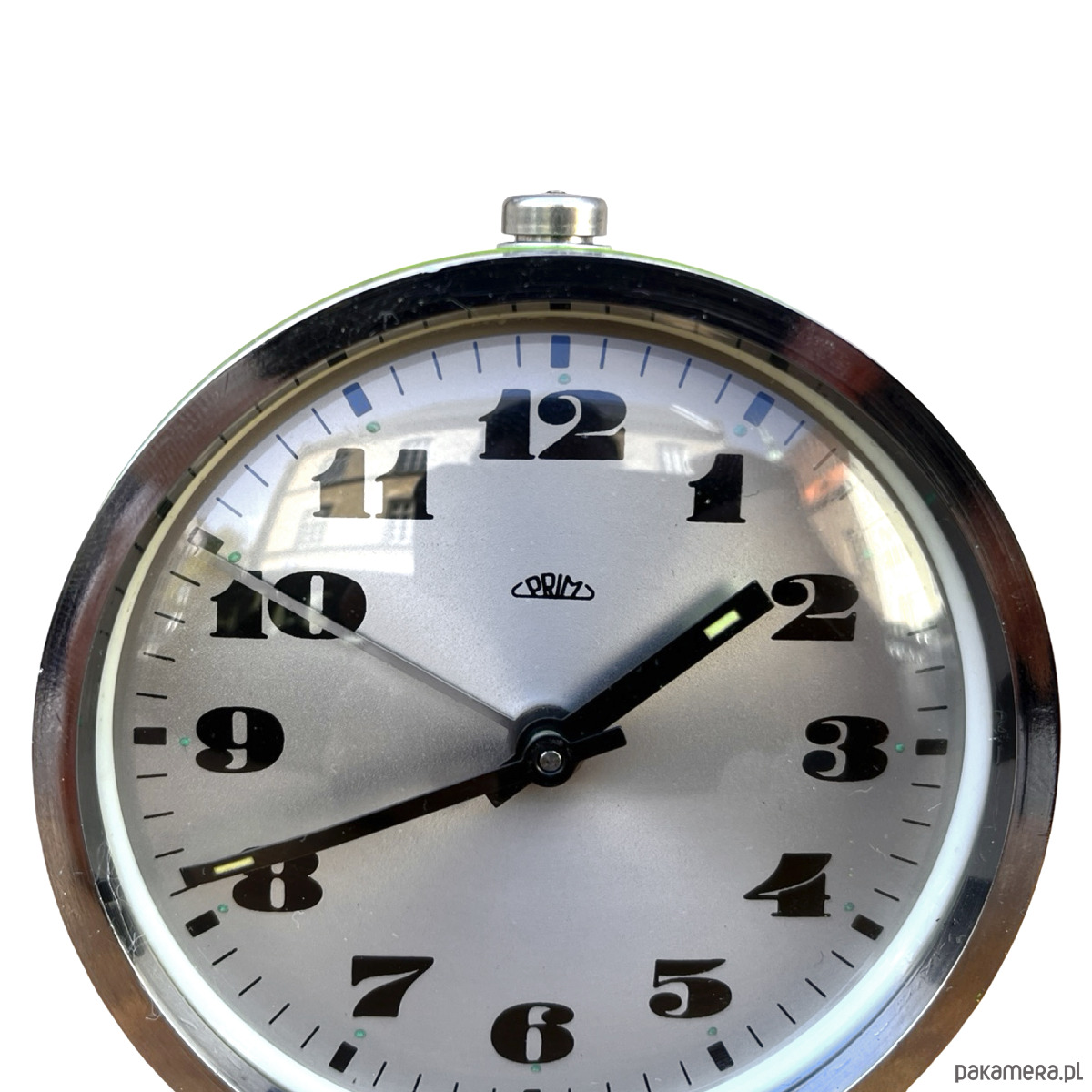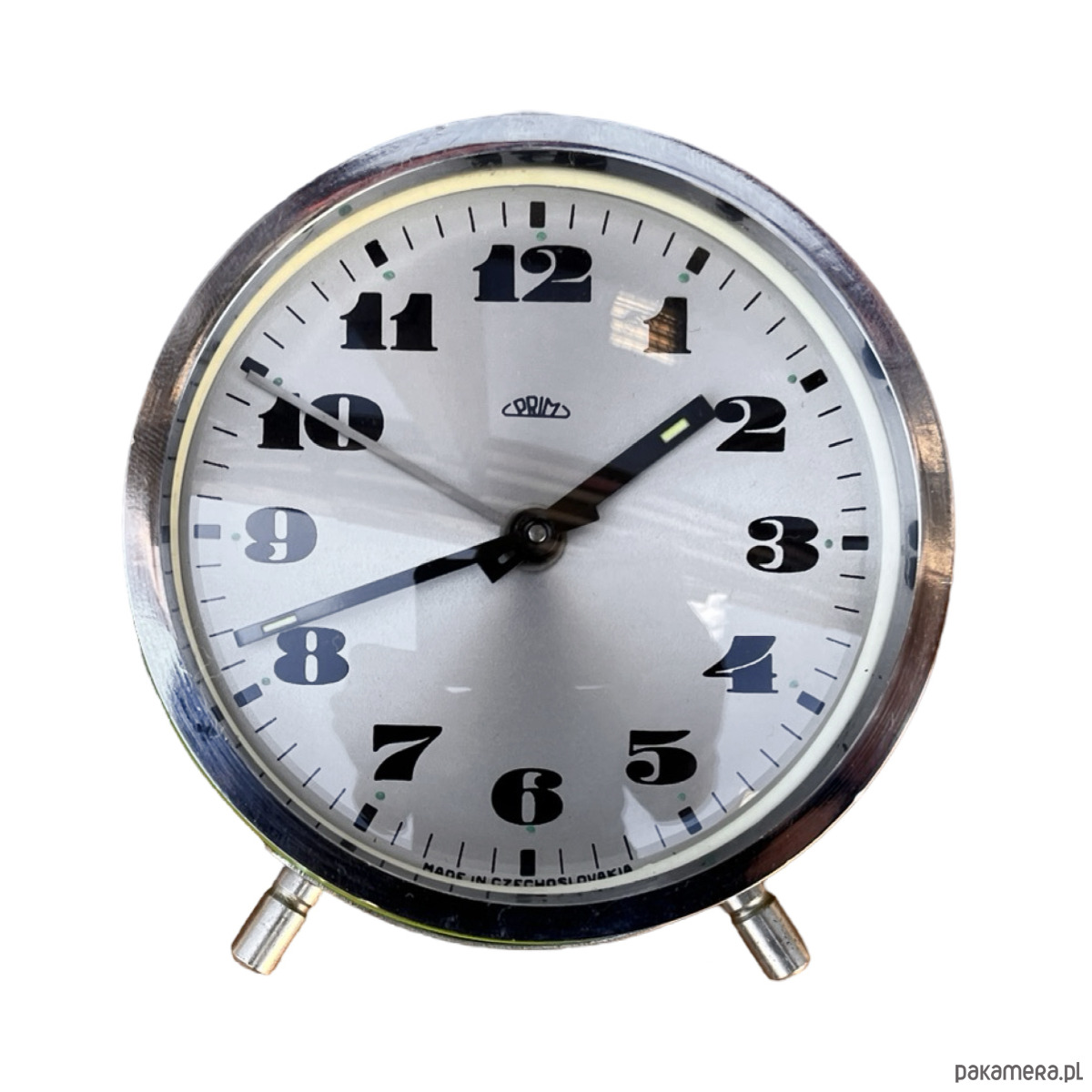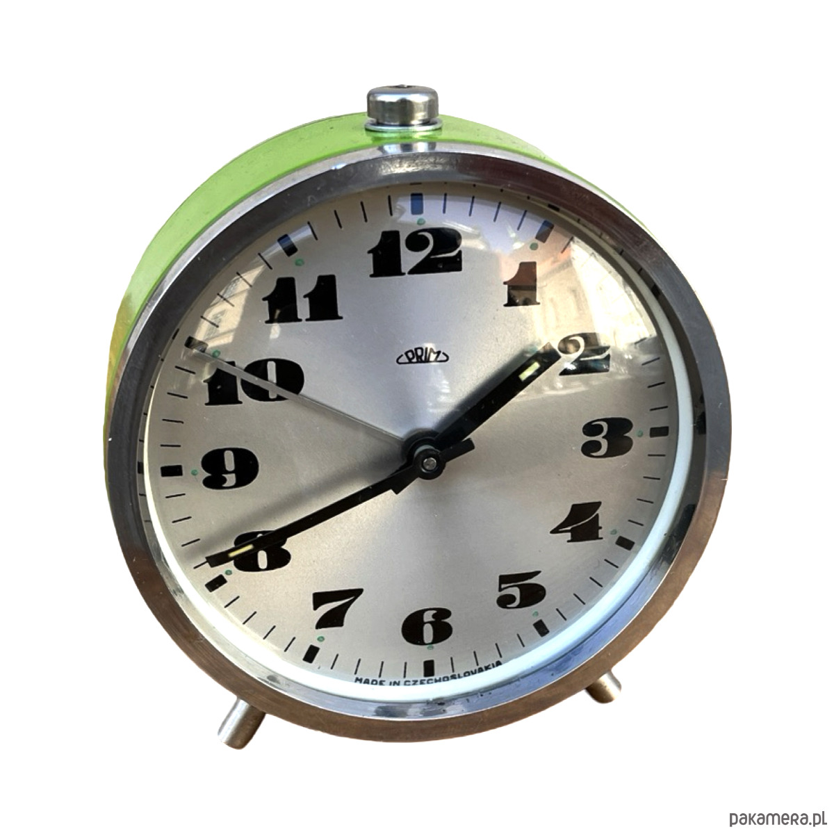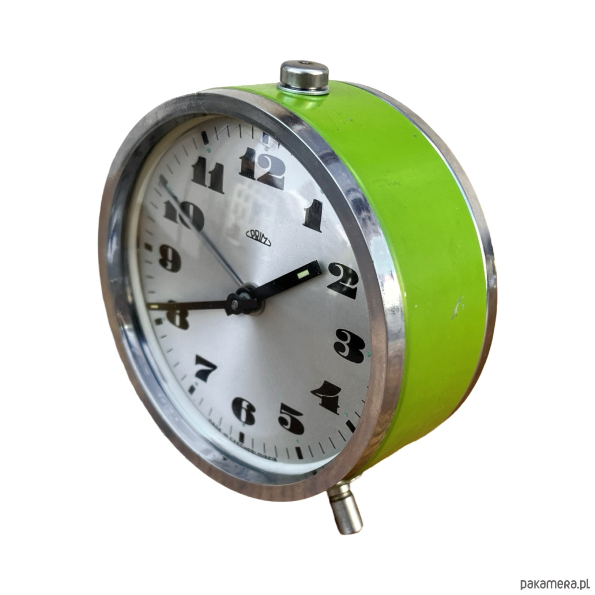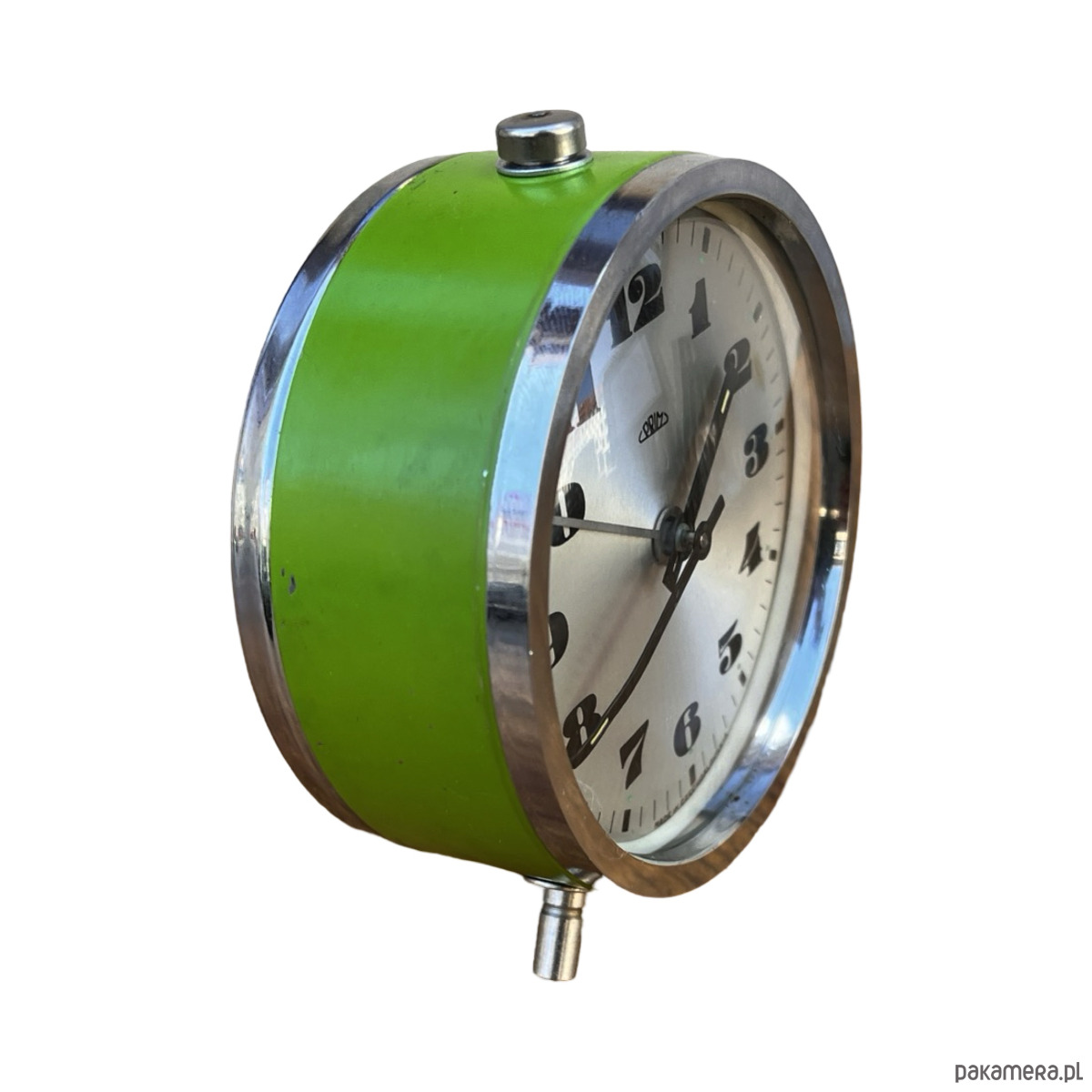 Srebrno-zielony modernistyczny budzik Prim wyprodukowany w latach 70. Zegarek metalowy w stylu space age, z korpusem wykonanym ze szczotkowanej stali. Budzik posiada klasyczny cyferblat okuty w szkło. Zegar w stanie oryginalnym, bardzo dobrym, nosi niewielkie ślady użytkowania ślady utlenienia metalu. Zegar mechaniczny, nakręcany. Uwaga zegar tyka i ten dziwięk jest słyszalny.