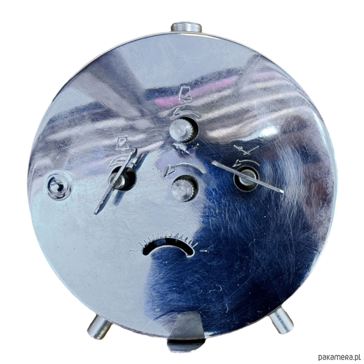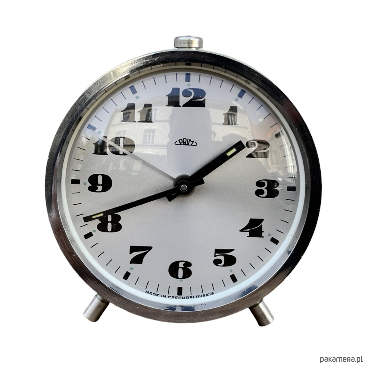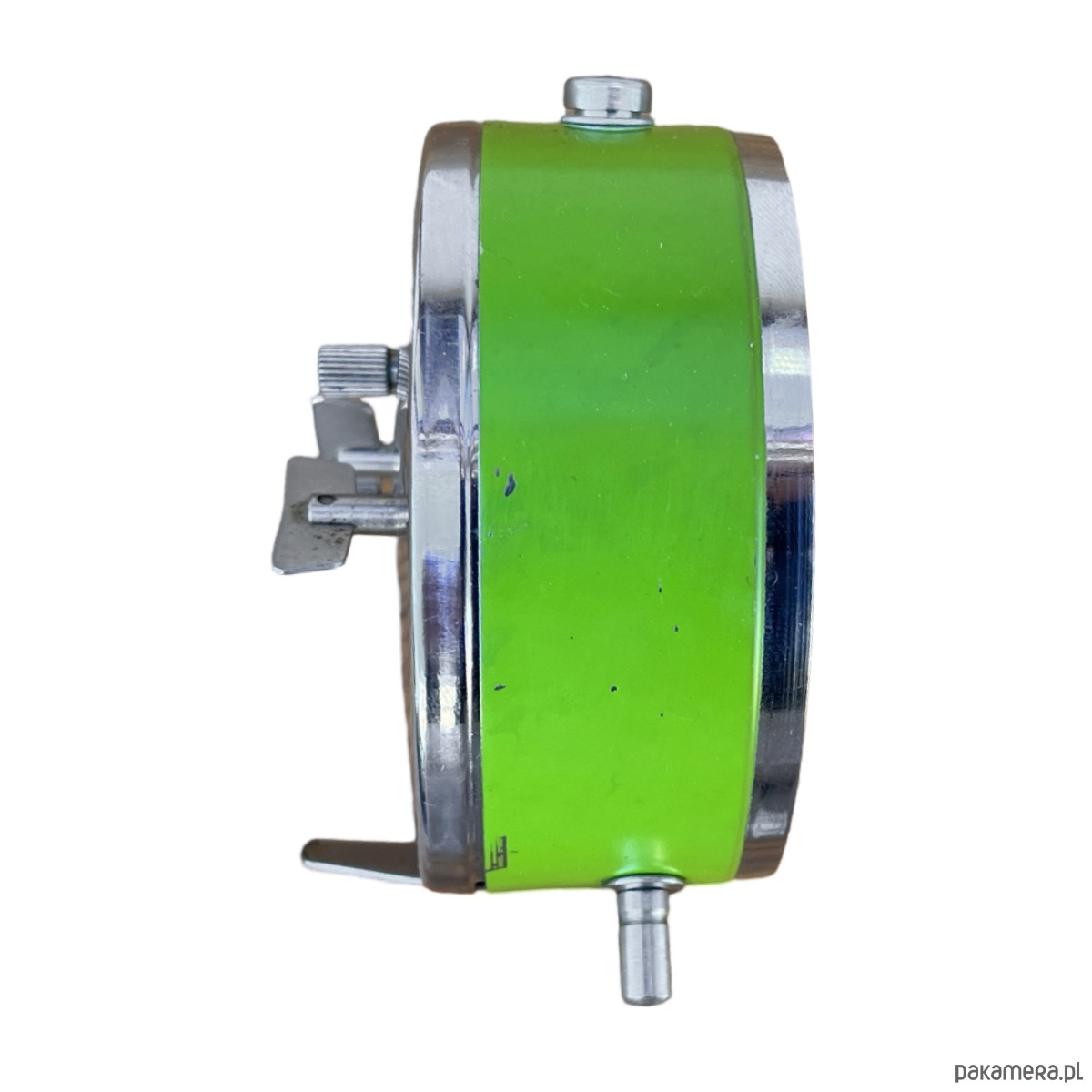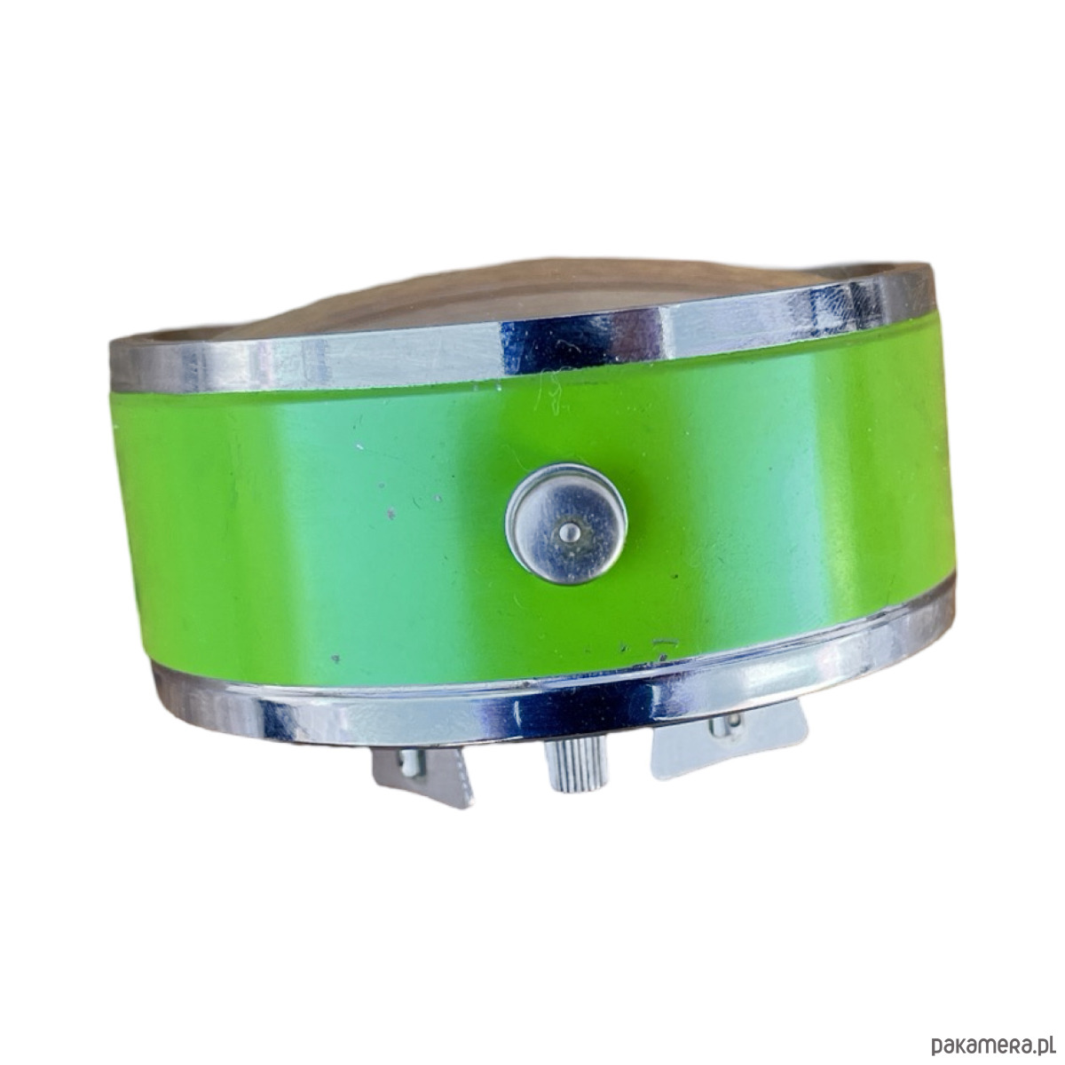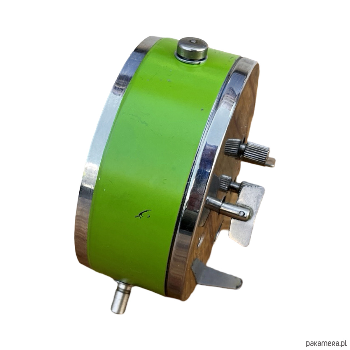 Srebrno-zielony modernistyczny budzik Prim wyprodukowany w latach 70. Zegarek metalowy w stylu space age, z korpusem wykonanym ze szczotkowanej stali. Budzik posiada klasyczny cyferblat okuty w szkło. Zegar w stanie oryginalnym, bardzo dobrym, nosi niewielkie ślady użytkowania ślady utlenienia metalu. Zegar mechaniczny, nakręcany. Uwaga zegar tyka i ten dziwięk jest słyszalny.